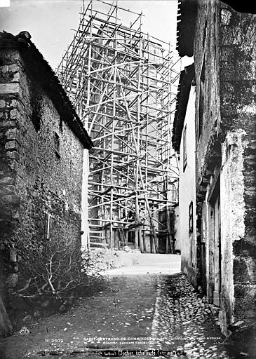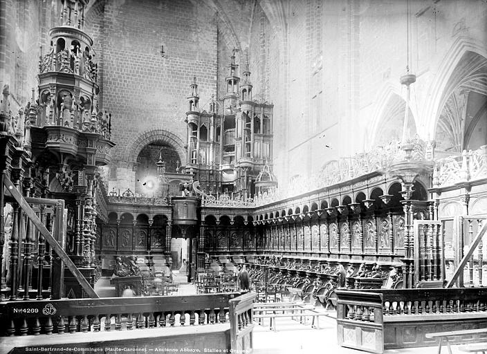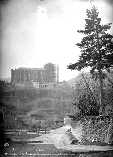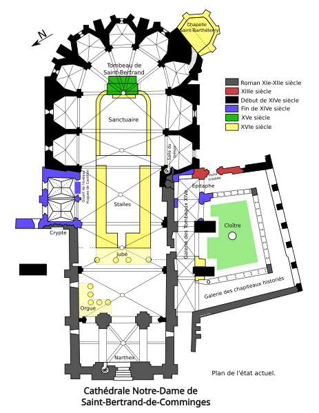 La cathédrale Notre‑Dame de Saint‑Bertrand‑de‑Comminges, située en Haute‑Garonne, a été élevée vers 1100 par Bertrand de l'Isle et s'inscrivait alors dans un ensemble comprenant un cloître et un enclos fortifié. La cité antique de Lugdunum Convenarum, devenue Convenae au Moyen Âge, est connue pour être évêché depuis le Ve siècle. La Vita de Bertrand, rédigée par le moine Vital au XIIe siècle, est le seul texte contemporain mentionnant le chantier ; elle décrit la reconstruction de la cathédrale et l'établissement d'une clôture canoniale lors de la réforme du chapitre. Des vestiges de l'édifice roman de Bertrand sont intégrés à l'édifice actuel : la tour‑clocher et le portail à sa base, l'avant‑nef voûtée et la partie inférieure des murs gouttereaux des trois à quatre premières travées de la nef. L'église romane était à trois nefs, le vaisseau central étant plus large et plus haut, les collatéraux étant voûtés en demi‑berceau ; le choeur primitif, mal connu, pouvait comporter trois absides alignées et il n'y avait pas de transept. Un cloître est édifié au cours de la seconde moitié du XIIe siècle le long du mur gouttereau sud, agrandi au XIIIe siècle ; il subsiste notamment la galerie ouest. La canonisation de Bertrand, validée entre 1218 et 1222, donne à la cité son nom de Saint‑Bertrand‑de‑Comminges et augmente l'afflux de pèlerins. Au début du XIVe siècle, sous l'impulsion de Bertrand de Got — devenu pape sous le nom de Clément V — la cathédrale est partiellement reconstruite et agrandie dans le style gothique pour mieux accueillir les fidèles. Le chanoine Adhémar de Saint‑Pastou dirige et finance le chantier de 1304 à 1325, comme l'atteste sa pierre tumulaire enchâssée dans le mur nord de la chapelle axiale. La reconstruction se poursuit jusqu'aux environs de 1352 grâce à l'action successive des évêques Boson de Salignac, Scott de Linières et Hugues de Castillon. Les travaux commencent par les parties basses du choeur et ses chapelles rayonnantes autour des anciennes absides, puis entraînent la destruction de la salle capitulaire, de la sacristie et de l'ancien choeur roman. La nef romane à trois vaisseaux est remplacée par une seule nef gothique beaucoup plus haute, voûtée d'ogives et appuyée à l'ouest contre le clocher ; la reconstruction progresse régulièrement d'est en ouest et le décor des clés de voûte documente ce rythme de chantier. Les clefs de voûte de l'abside et de la travée de choeur portent les armes de Scott de Linières (accompagnées de celles de Bertrand de Got) et d'Adhémar de Saint‑Pastou ; celles de la nef portent notamment les armes d'Hugues de Castillon, d'attributions ligées à saint Bertrand et, plus tard, les armes de Jean de Mauléon. Hugues de Castillon fait bâtir une chapelle funéraire dans le mur nord de la quatrième travée, qui renferme son tombeau et une pierre tumulaire, et son successeur Bernard de Cosnac achève probablement l'ensemble en ajoutant une chapelle haute sur la galerie nord du cloître. À partir du XVIe siècle l'aménagement intérieur est entièrement refait par Jean de Mauléon : les boiseries de la Renaissance, dont le jubé, les stalles et le buffet de l'orgue, datent de cette période, avec inauguration du jubé et des stalles vers 1535 et achèvement de l'orgue vers 1550. Depuis la fin du Moyen Âge l'architecture n'a subi aucune transformation majeure, mais la cathédrale a fait l'objet de nombreuses restaurations aux XIXe et XXe siècles, portant sur toitures, contreforts et parements ; le clocher fut entièrement reparementé entre 1883 et 1887 après un effondrement de parement en 1878. Des campagnes de restauration dirigées par Sylvain Stym‑Popper (1953‑1957) puis Bernard Voinchet (1973‑1991) ont consolidé maçonneries et toitures, dégagé des ouvertures romanes et nettoyé et rejointoyé les parements intérieurs et extérieurs ; ces interventions ont toutefois entraîné la disparition de la seule empreinte conservée de la voûte du vaisseau central roman, visible jusque‑là sur le mur est du clocher. Classée parmi les monuments historiques dès 1840 et inscrite au patrimoine mondial de l'UNESCO au titre des chemins de Saint‑Jacques‑de‑Compostelle, la cathédrale fut le siège du diocèse de Comminges jusqu'à la bulle Qui Christi Domini de 1801 et est depuis lors l'église paroissiale Sainte‑Marie.