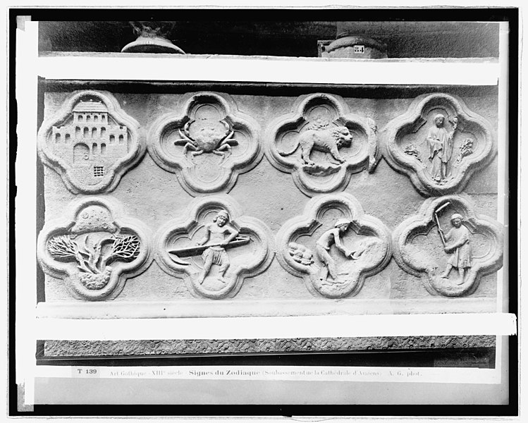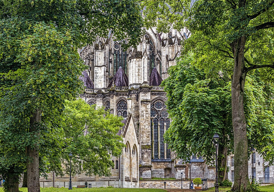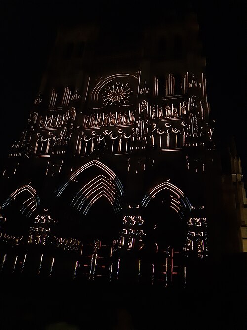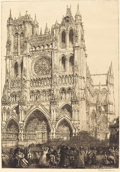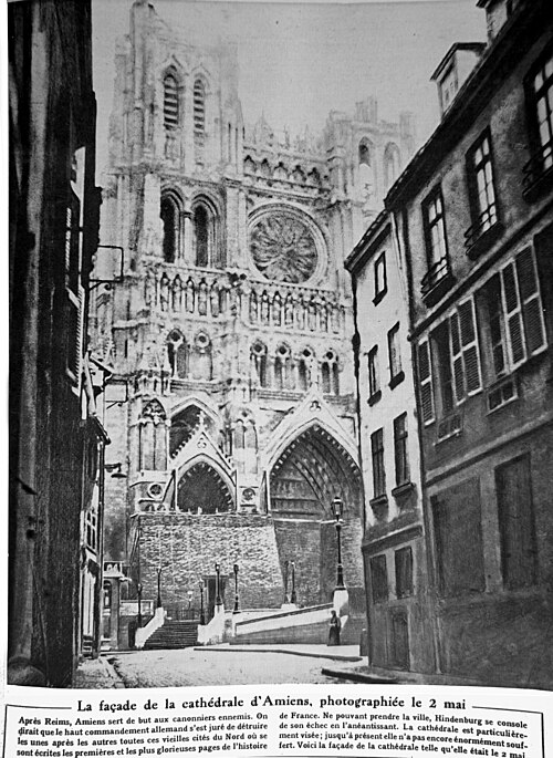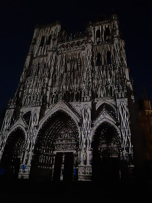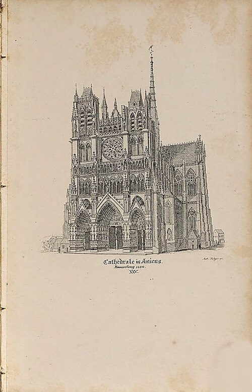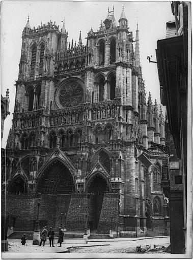 La cathédrale Notre‑Dame d'Amiens occupe le site où se sont succédé plusieurs sanctuaires depuis l'Antiquité ; la présence d'une communauté chrétienne y est attestée dès la première moitié du IVe siècle et une mention documentée évoque, en 850, une cathédrale double dédiée à la Vierge et à saint Firmin. Après des reconstructions successives au fil des incendies et des périodes de transformations (notamment après 1019, au début du XIIe siècle et après les destructions de 1137), une cathédrale romane fut élevée et consacrée en 1152. L'arrivée en 1206 de la relique du chef de saint Jean‑Baptiste fit de l'église un lieu de pèlerinage majeur et contribua à l'accroissement des ressources du chapitre. Pour accueillir cet afflux et répondre à l'essor urbain, le projet d'une nouvelle cathédrale gothique fut engagé au début du XIIIe siècle : les travaux, entrepris sous l'épiscopat d'Évrard de Fouilloy, débutent en 1220 sous la direction de Robert de Luzarches, puis de Thomas de Cormont et de son fils Renaud. Mené avec une rare rapidité pour une œuvre de cette ampleur, le chantier permit d'achever la nef en 1236 et d'aboutir, après des phases successives et quelques interruptions liées aux incendies et aux besoins de financement, à l'achèvement du gros œuvre vers 1269. Le voûtement de la nef et du chœur fut réalisé à la fin du XIIIe siècle et le labyrinthe installé en 1288 ; les chapelles latérales de la nef se développèrent entre la fin du XIIIe et la fin du XIVe siècle, tandis que le couronnement des tours et les parties flamboyantes furent finalisés autour du XVe et du début du XVIe siècle. La flèche de la croisée, élevée au XVIe siècle en charpente recouverte de plomb, remplace une flèche antérieure détruite par la foudre en 1528.