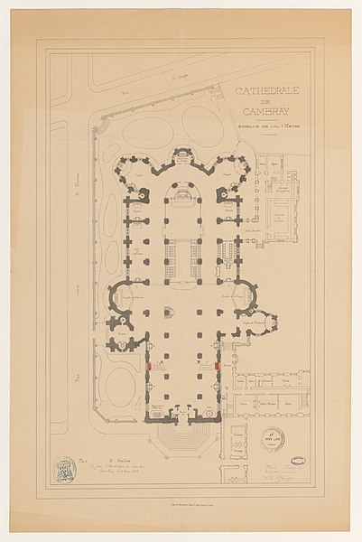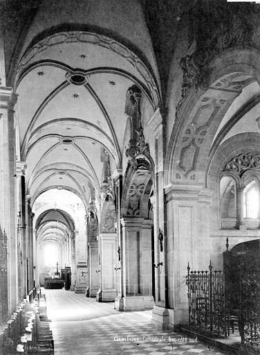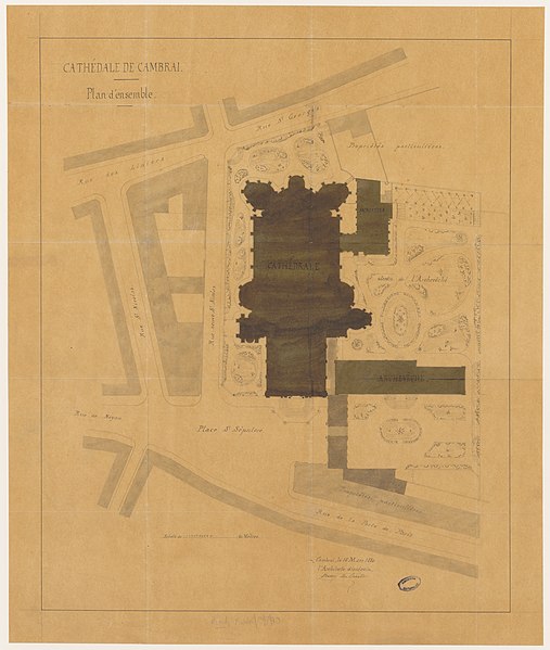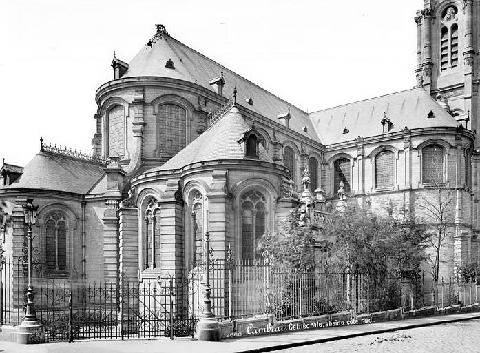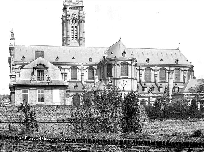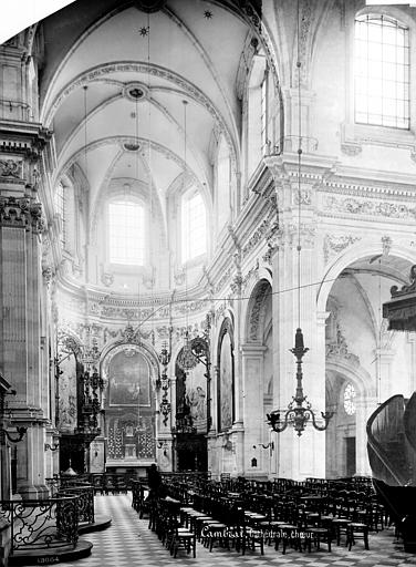 Aujourd'hui la cathédrale abrite notamment le monument funéraire à Fénelon, œuvre de David d'Angers, neuf grandes grisailles en trompe-l'œil du peintre Martin-Joseph Geeraerts, les ossements d'évêques et archevêques conservés dans la crypte, ainsi que l'icône de Notre-Dame de Grâce, donnée le 14 août 1451 par le chanoine Fursy de Bruille et traditionnellement attribuée à saint Luc. Les grandes orgues de tribune, construites par la maison Pierre Schyven en 1897 avec 2 408 tuyaux répartis en 38 jeux, furent restaurées et agrandies par Auguste Convers après la guerre de 1914–1918 pour atteindre 49 jeux et environ 3 670 tuyaux ; l'instrument actuel fut inauguré en 1936 par Joseph Bonnet. Le buffet, datant de la seconde moitié du XVIIIe siècle, est attribué à Aimé-Joseph Carlier et a été assemblé par l'ébéniste Buisine sur des dessins de l'architecte diocésain Guidasci. L'orgue comporte trois claviers de 61 notes, un pédalier de 32 notes et une quarantaine de registres ; sa traction est électro-pneumatique, il est doté d'un combinateur électronique, de nombreux accouplements et tirasses et d'un tremblant au récit. On trouve également un orgue de chœur, construit à neuf par Auguste Convers en 1936.
