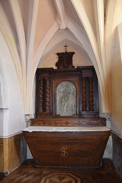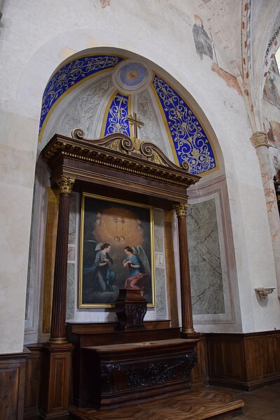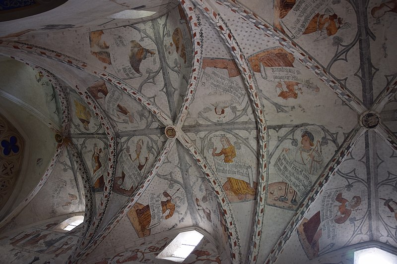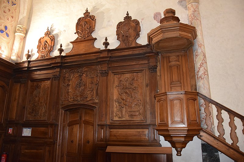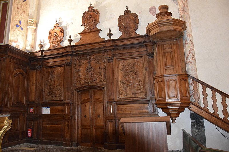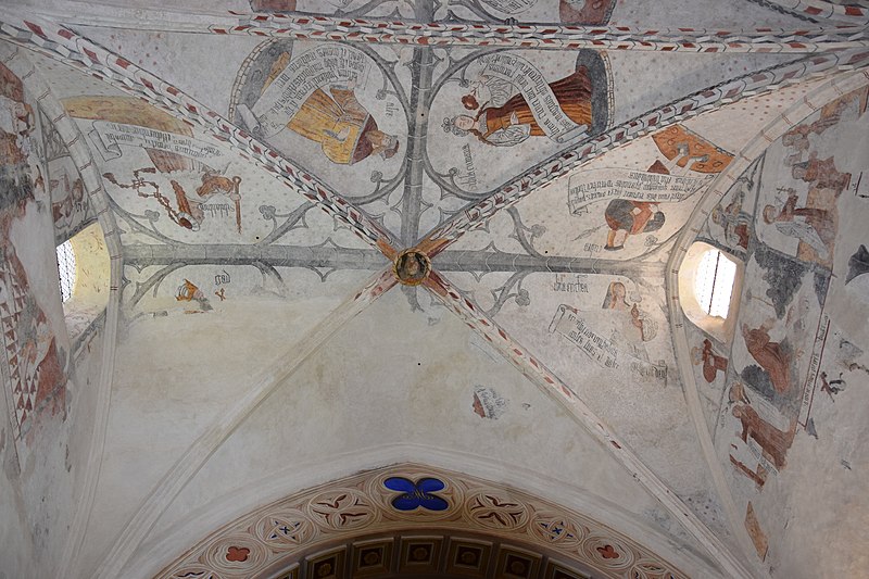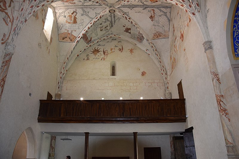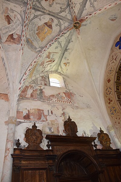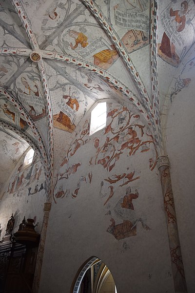 À l’intérieur, la nef est divisée en trois travées ; des croisées d’ogives reposent sur des chapiteaux cylindriques sculptés, présentant entre autres armes épiscopales et scènes profanes. Les voûtes montrent des nervures en briques rouges et des clés de voûte peintes représentant blasons et scènes religieuses ; les chapelles latérales sont voûtées en ogive avec des nervures formant liernes et tiercerons. Plusieurs décors muraux se sont succédé du Moyen Âge au XIXe siècle ; lors de travaux de restauration de boiseries au début des années 1990, des traces de peintures anciennes ont été repérées, puis deux campagnes de restauration en 2003‑2004 et 2009‑2010 ont permis de mettre au jour un ensemble monumental de peintures murales de la Renaissance, décor commandé par Jean d’Aule, évêque du Couserans de 1475 à 1515. Parmi les peintures figurent une couronne dorée entourée d’angelots, la représentation des fils de Jacob et des sibylles (douze hommes et douze femmes) tenant des manuscrits portant des inscriptions latines annonçant la venue du Sauveur, ainsi que des clés de voûte illustrant notamment saint Michel terrassant le dragon. L’orgue, les peintures et deux vantaux font l’objet d’un inventaire dans la base Palissy.