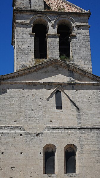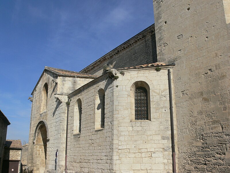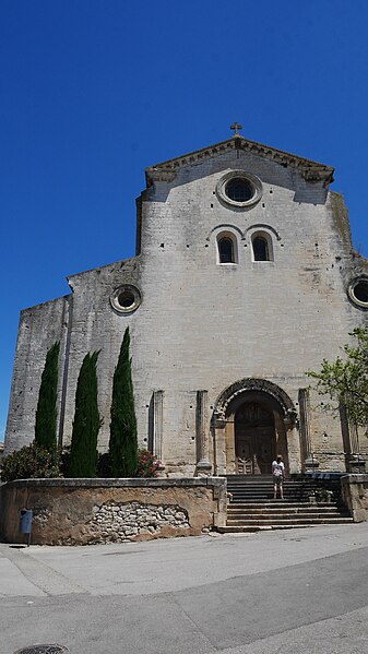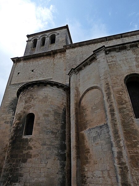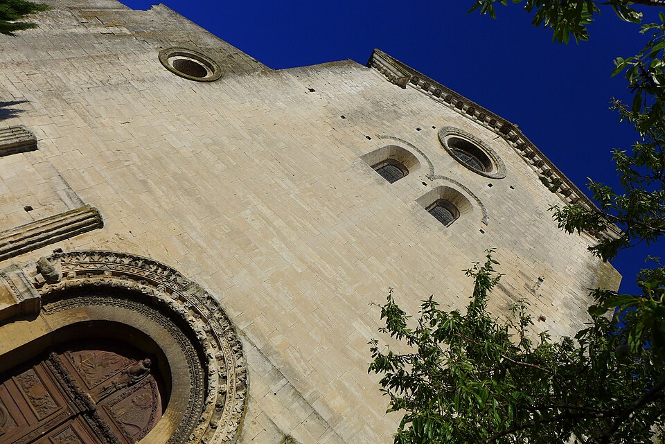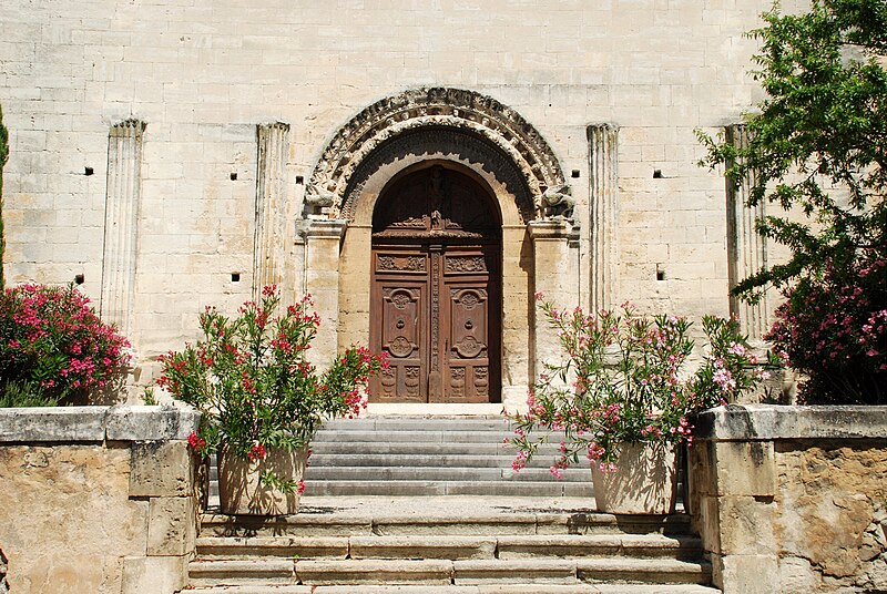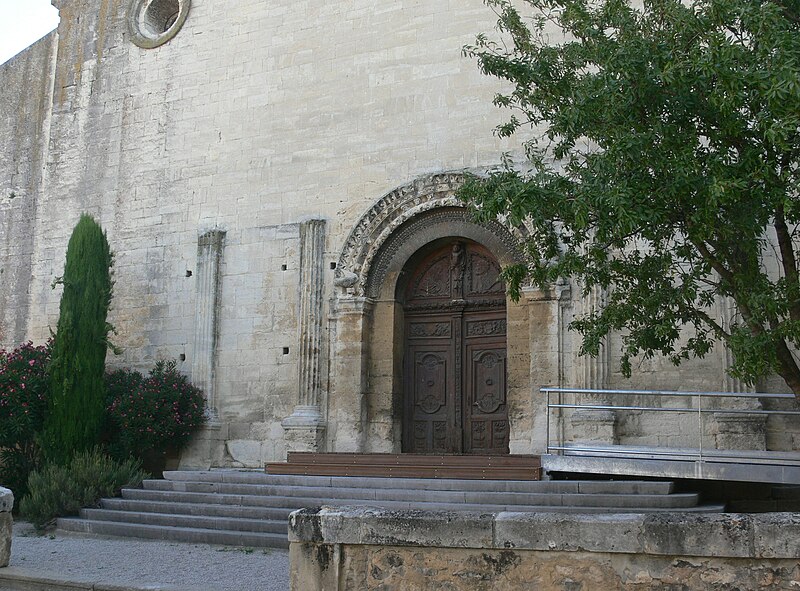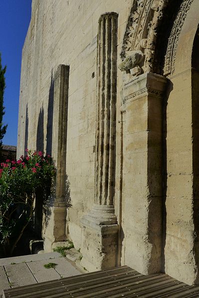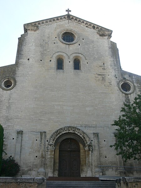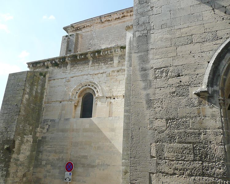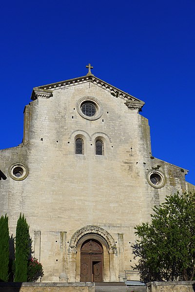 L'architecture extérieure, de type roman provençal, se caractérise par un plan simple, une harmonie de volumes, un appareil soigné et un décor dépouillé mais inspiré de l'Antiquité ; l'absence d'ouvertures au nord est notable. Les pierres, à l'intérieur comme à l'extérieur, portent de nombreuses marques de tâcherons. Les motifs antiques — frontons triangulaires, colonnes engagées et pilastres cannelés, chapiteaux à feuilles d'acanthe, frises de grecques, oves et palmettes — ornent la façade occidentale, la façade méridionale, le chevet et le chœur. La façade occidentale présente un fronton triangulaire avec frise de grecques, un oculus entouré de frises d'oves et de feuilles d'acanthe, et un portail décoré de frises d'acanthe et d'oves, encadré par des colonnes engagées cannelées et des pilastres ; les vantaux en bois datent du XVIIe siècle. La façade méridionale, protégée par le porche du XVe siècle, reprend ces thèmes antiques sous la corniche, autour d'une fenêtre haute encadrée de pilastres cannelés et couronnée de chapiteaux à feuilles d'acanthe, et au niveau d'un portail méridional doté de colonnes torsadées et de chapiteaux ornés. La façade méridionale du transept est également surmontée d'un fronton triangulaire et d'un entablement à l'antique ; de petites sculptures romanes, comme un sagittaire ou un cavalier, sont enchâssées dans ses murs.