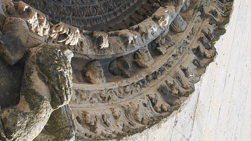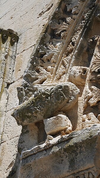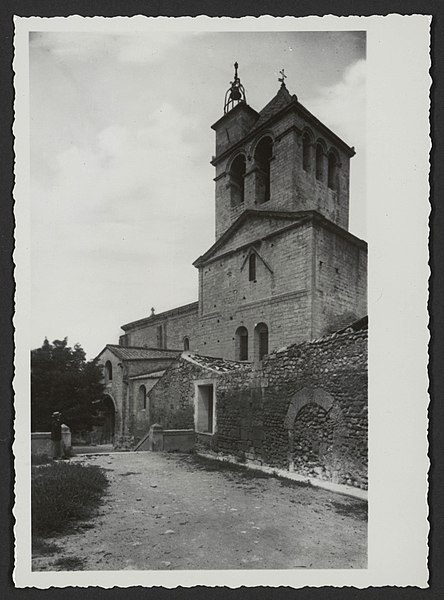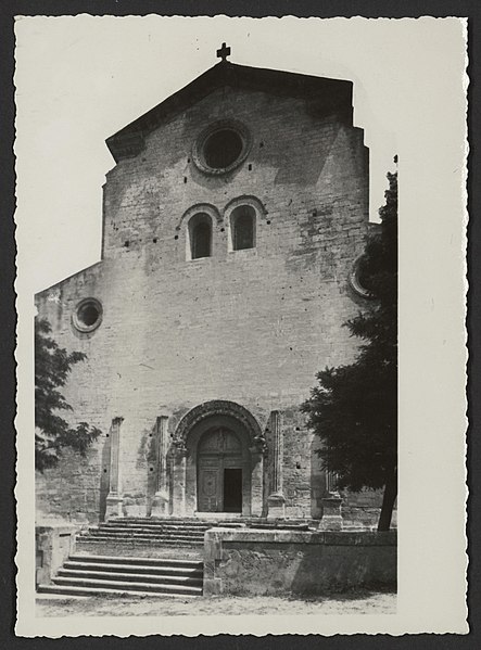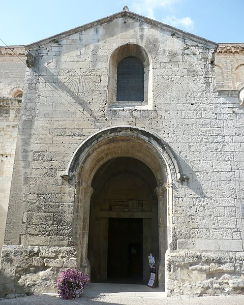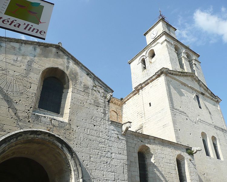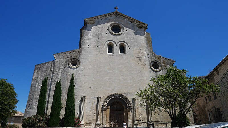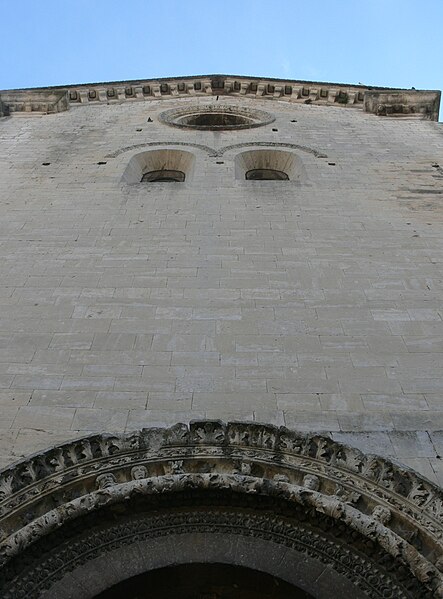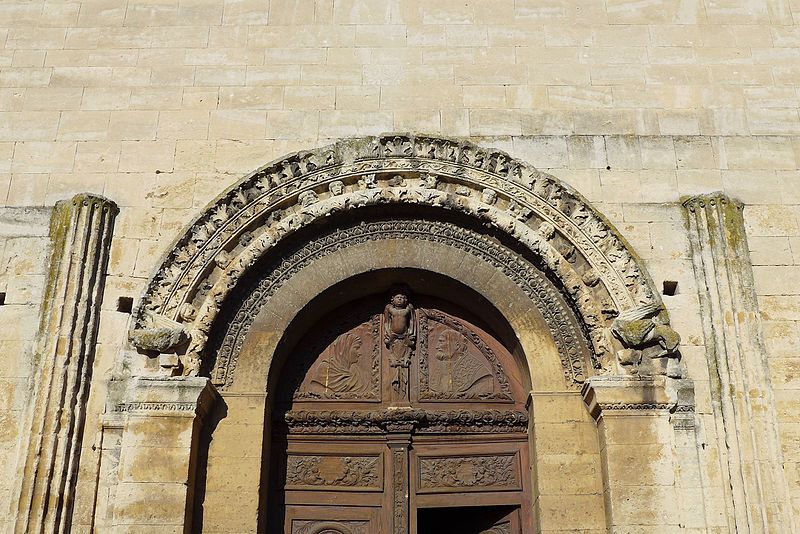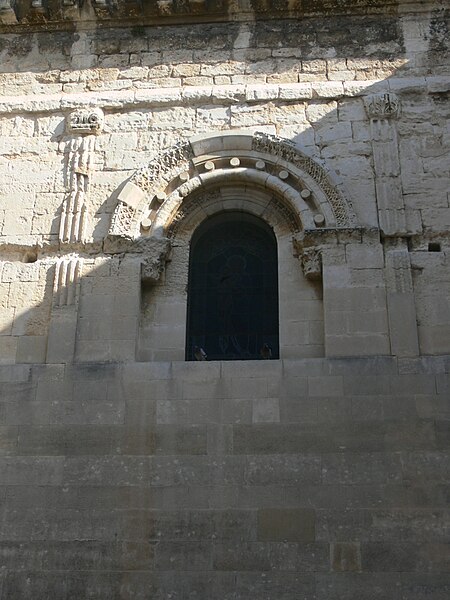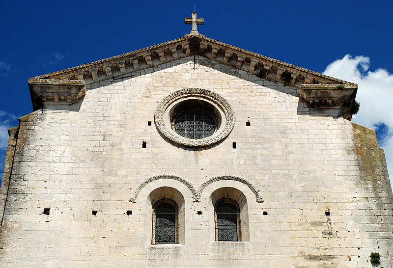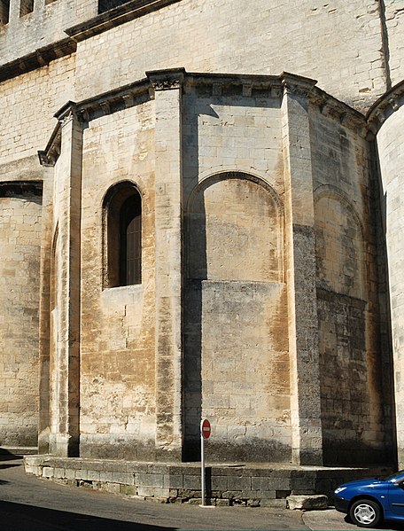 L'architecture extérieure, de type roman provençal, se caractérise par un plan simple, une harmonie de volumes, un appareil soigné et un décor dépouillé mais inspiré de l'Antiquité ; l'absence d'ouvertures au nord est notable. Les pierres, à l'intérieur comme à l'extérieur, portent de nombreuses marques de tâcherons. Les motifs antiques — frontons triangulaires, colonnes engagées et pilastres cannelés, chapiteaux à feuilles d'acanthe, frises de grecques, oves et palmettes — ornent la façade occidentale, la façade méridionale, le chevet et le chœur. La façade occidentale présente un fronton triangulaire avec frise de grecques, un oculus entouré de frises d'oves et de feuilles d'acanthe, et un portail décoré de frises d'acanthe et d'oves, encadré par des colonnes engagées cannelées et des pilastres ; les vantaux en bois datent du XVIIe siècle. La façade méridionale, protégée par le porche du XVe siècle, reprend ces thèmes antiques sous la corniche, autour d'une fenêtre haute encadrée de pilastres cannelés et couronnée de chapiteaux à feuilles d'acanthe, et au niveau d'un portail méridional doté de colonnes torsadées et de chapiteaux ornés. La façade méridionale du transept est également surmontée d'un fronton triangulaire et d'un entablement à l'antique ; de petites sculptures romanes, comme un sagittaire ou un cavalier, sont enchâssées dans ses murs.