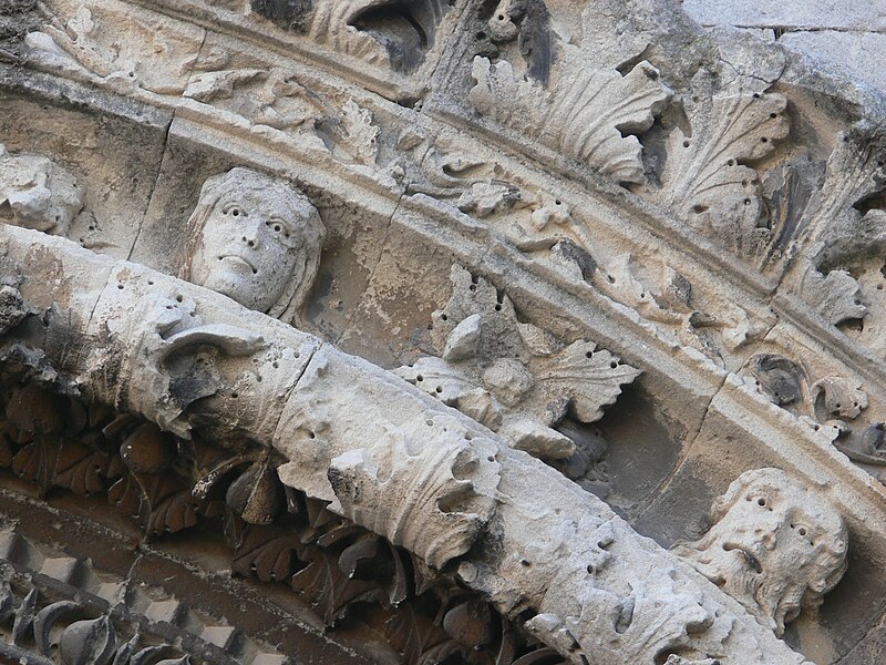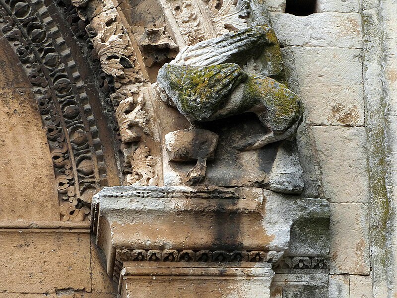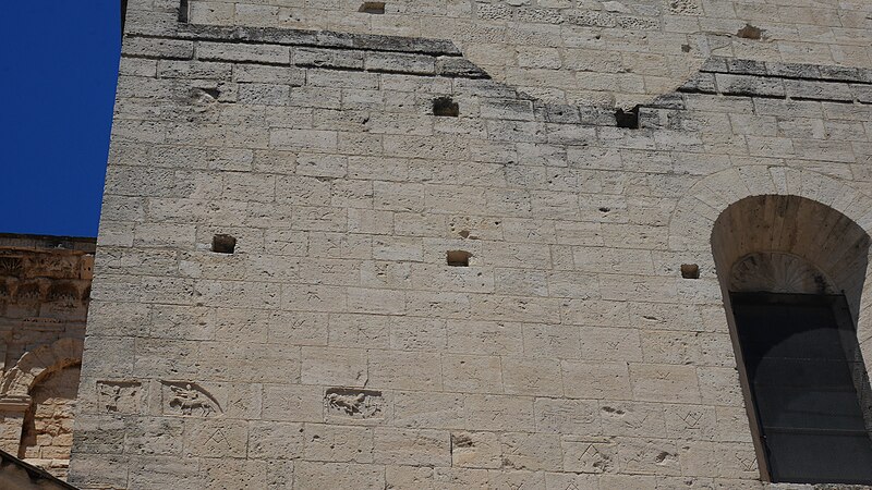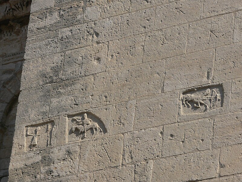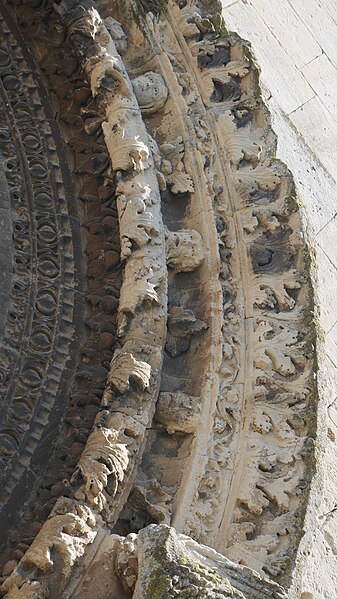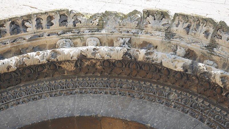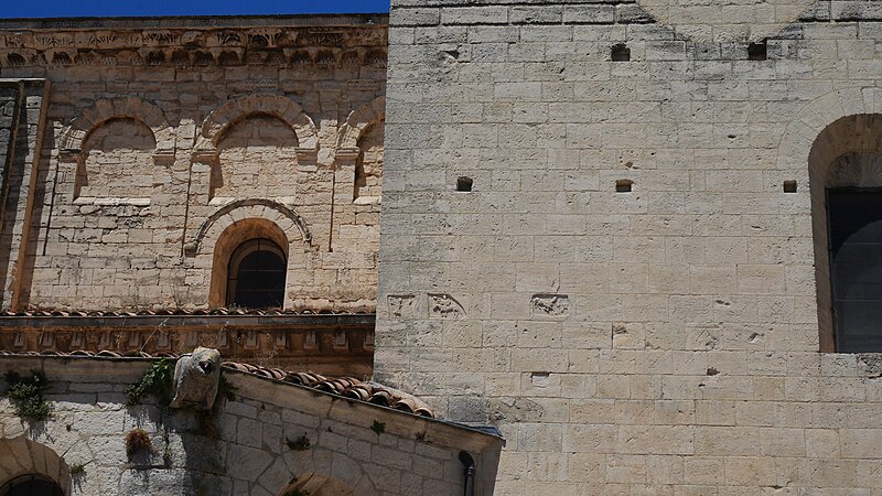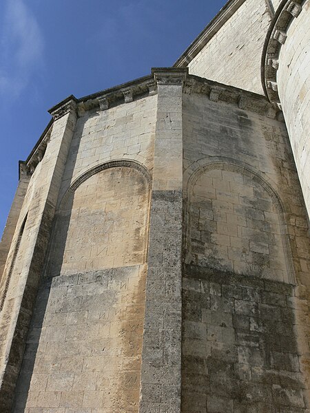 Le chevet, plus sobre, présente une triple abside et une triple arcature aveugle ; l'abside centrale conserve un entablement, des chapiteaux carrés à feuilles d'acanthe, une frise d'oves, une frise de palmettes ou d'acanthe et des modillons sculptés de feuilles d'acanthe. À l'intérieur, l'abside principale voûtée en cul‑de‑four s'ordonne autour de cinq arcades aveugles reposant sur colonnettes cannelées ou torsadées et chapiteaux à feuilles d'acanthe. Derrière l'autel, des mosaïques des XIIe et XIIIe siècles représentent la « ville de Jérusalem » ; elles sont sans doute contemporaines des premières croisades, environ trente ans après la construction, ce qui suggère que l'église actuelle a remplacé une précédente construction dont le sol avait été relevé.