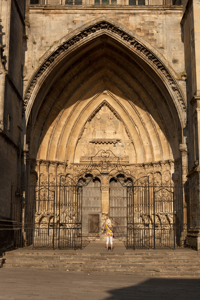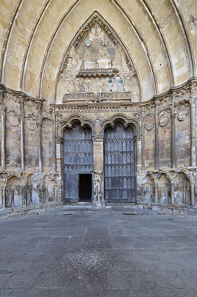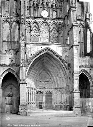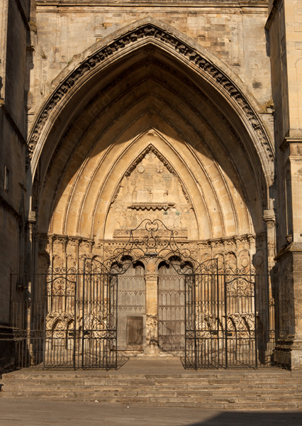 La cathédrale suit un plan en croix latine; la façade occidentale, encadrée par deux flèches, s'ouvre par trois portails dont le tympan central, aux sculptures détruites pendant la Révolution, représentait autrefois le Couronnement de la Vierge.