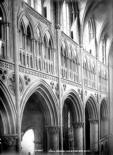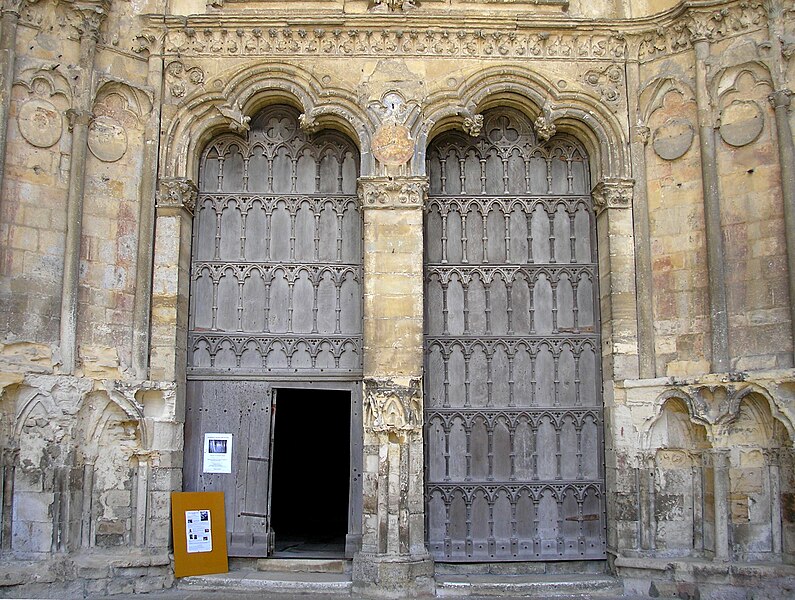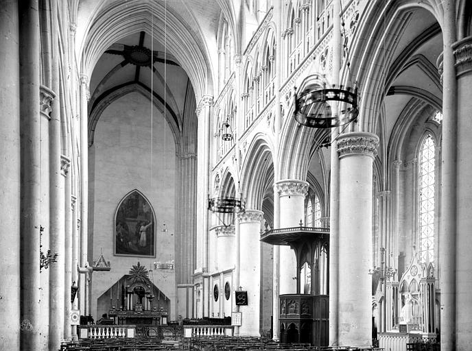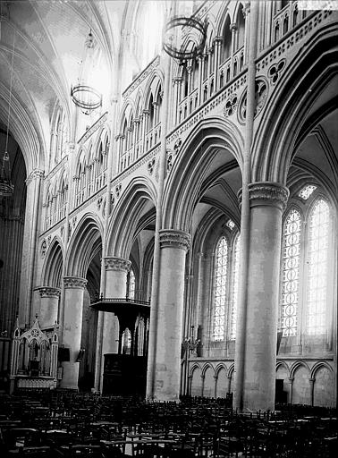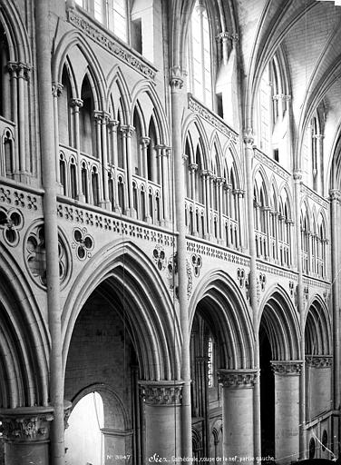 La nef, longue de six travées et accompagnée de bas‑côtés, adopte le vocabulaire de l'architecture normande avec trois niveaux — grandes arcades, triforium et fenêtres hautes — le triforium présentant un rang d'arcades trilobées et une frise de quatre‑feuilles.