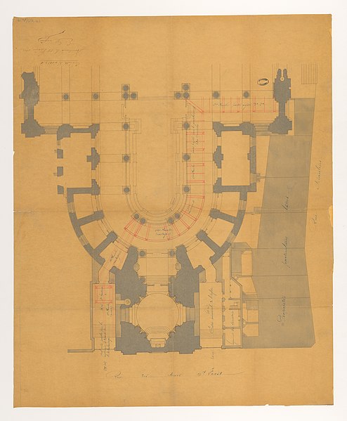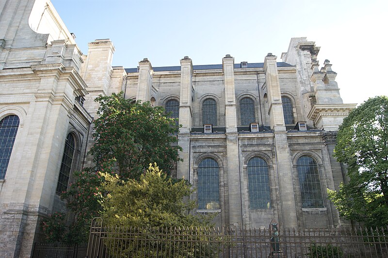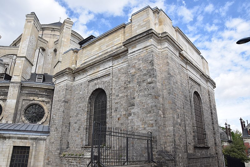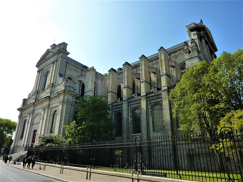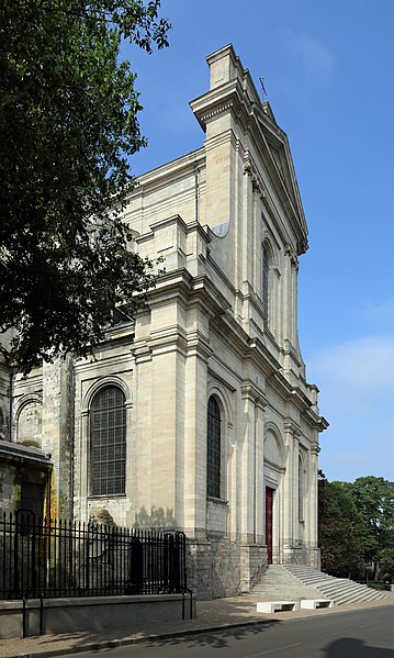 L'édifice suit un plan en croix latine : il forme un vaisseau long de 102 mètres pour la nef et présente, selon les relevés, une longueur totale de 116 mètres, un transept de 56 mètres sur 28 mètres, une largeur de nef et de chœur de 28 mètres, une hauteur sous voûte de 32 mètres et une hauteur de coupole à la croisée du transept de 38 mètres. L'intérieur, conçu pour accueillir la communauté monastique, se caractérise par une nef de six travées flanquée de collatéraux séparés par de grandes colonnes corinthiennes qui supportent un entablement et une claire‑voie très haute, assurant une grande luminosité grâce aux larges baies et aux vitraux en verre blanc. La voûte des vaisseaux centraux repose sur des pseudo‑coupoles et des arcs doubleaux, le chœur étant marqué par une petite coupole sur pendentifs à la croisée du transept ; les bas‑côtés sont couverts en berceau et le déambulatoire est percé d'oculi. À l'extérieur, un réseau apparent d'arcs‑boutants soutient les voûtes, illustrant la recherche, à la fin du XVIIIe siècle, d'une association entre la légèreté et la luminosité du gothique et l'esthétique classique, selon des principes attribués à Soufflot. La façade occidentale, restée telle qu'elle fut construite avant 1792, présente la superposition de deux ordres corinthiens et un fronton triangulaire ; un péristyle avait été prévu mais n'a pas été réalisé.