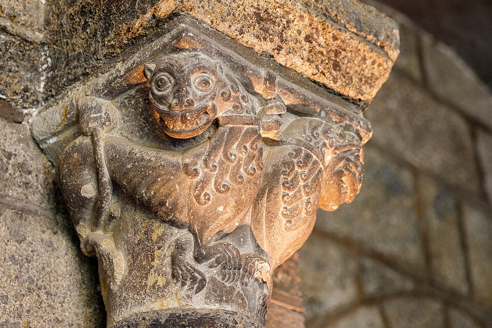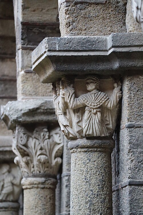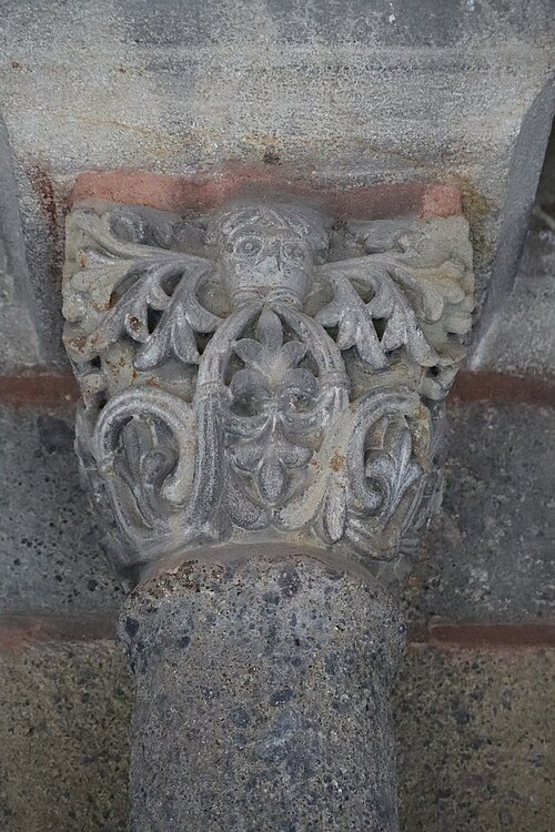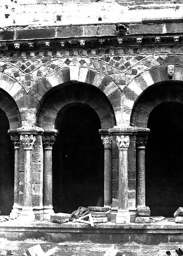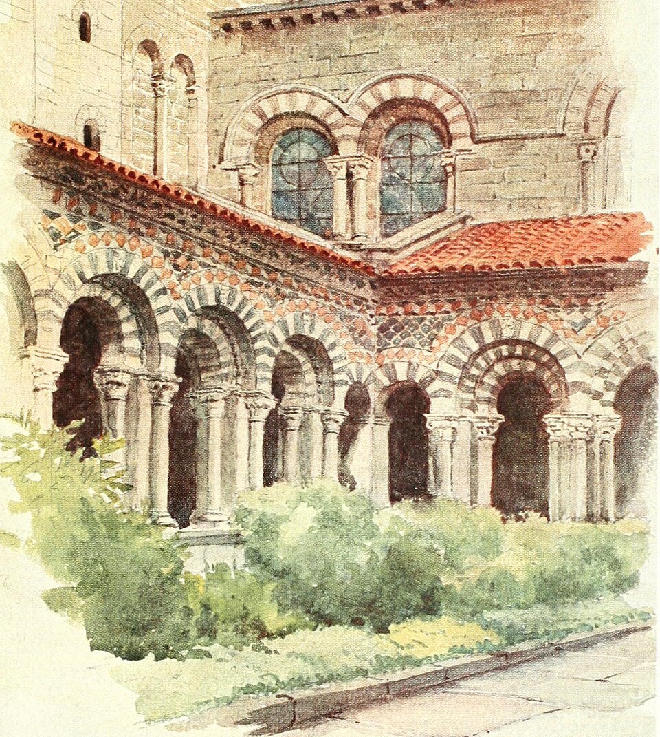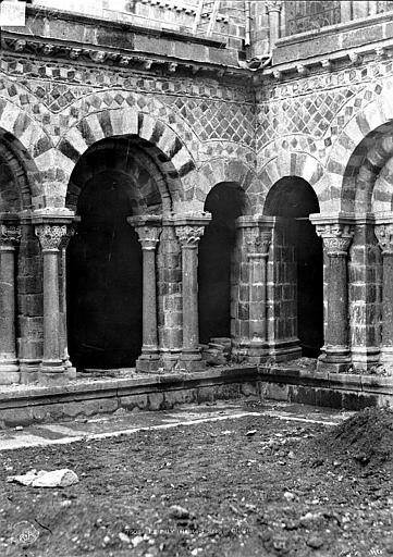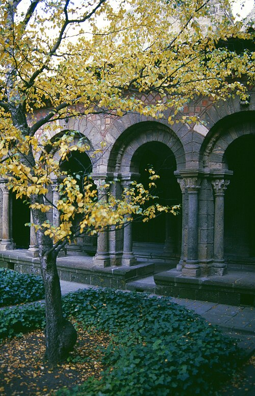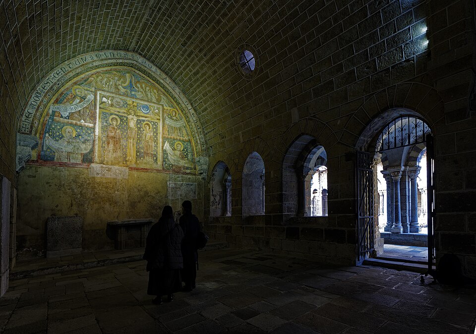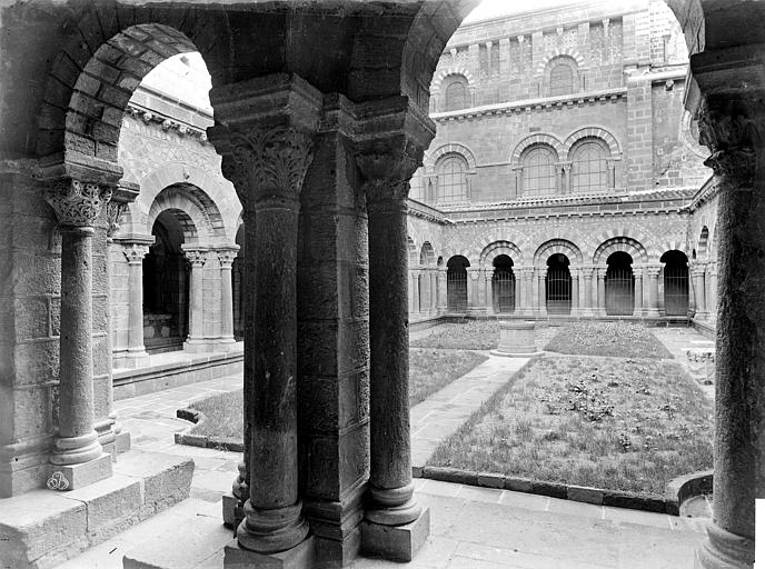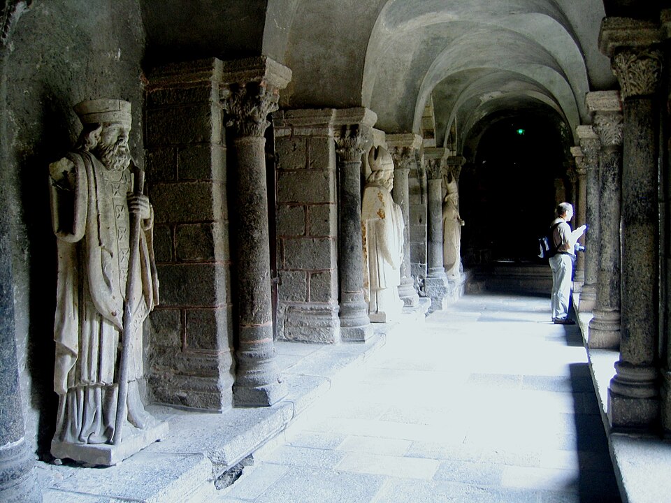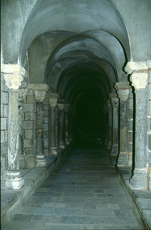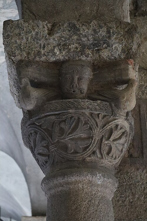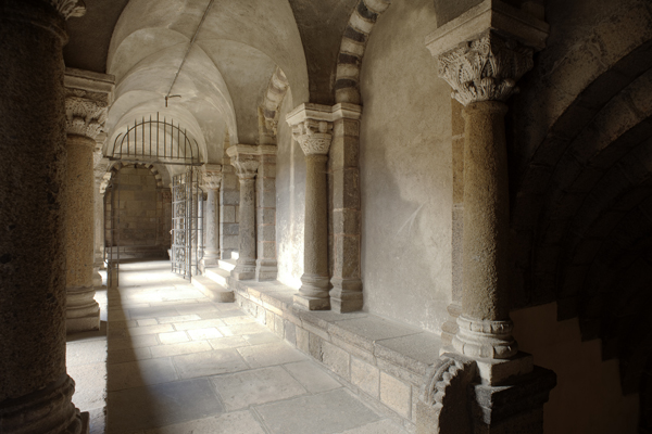 Adossé au mur nord de la cathédrale, le cloître rectangulaire, profondément remanié, conserve des galeries des XIe‑XIIe siècles ; la galerie méridionale a été démolie au XVIIIe siècle et la partie extérieure largement reconstruite, mais les autres galeries conservent des chapiteaux historiés et une corniche richement sculptée. Le cloître s'ouvre sur son préau par cinq arcades sur les deux côtés les plus courts et par dix sur les longs, et le mur surmontant les archivoltes est orné d'une mosaïque de losanges blancs, noirs et rouges. Le bâtiment des mâchicoulis, qui dominait autrefois le flanc ouest de l'enceinte et faisait fonction de structure défensive, abrite aujourd'hui la chapelle des reliques au rez‑de‑chaussée et un espace muséal au premier étage ; la salle capitulaire conserve une fresque de la Crucifixion de tradition byzantine.