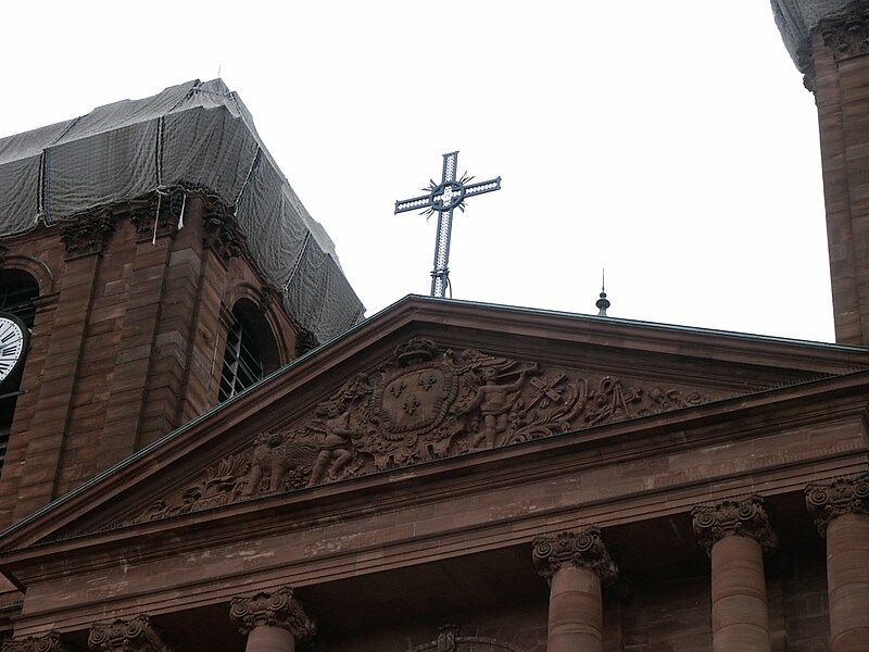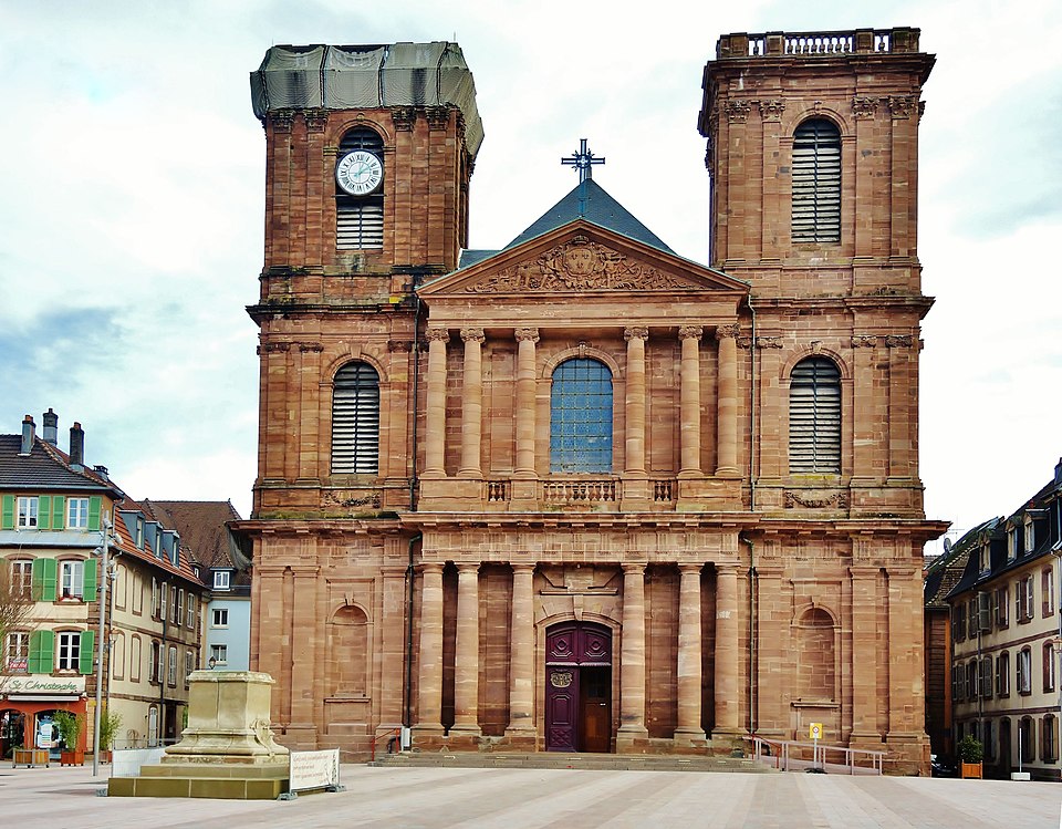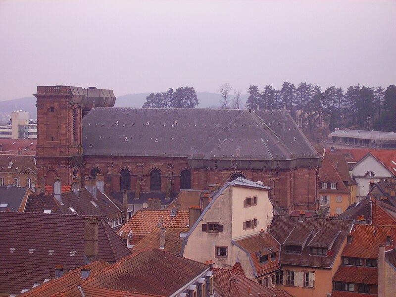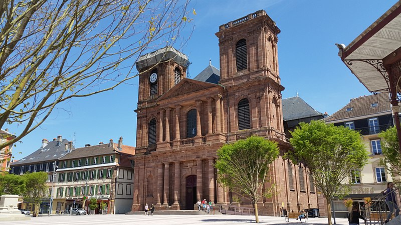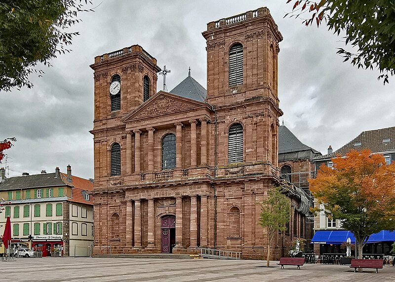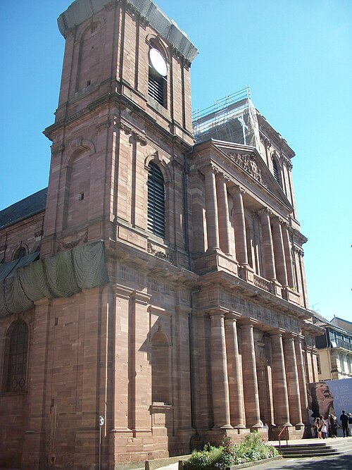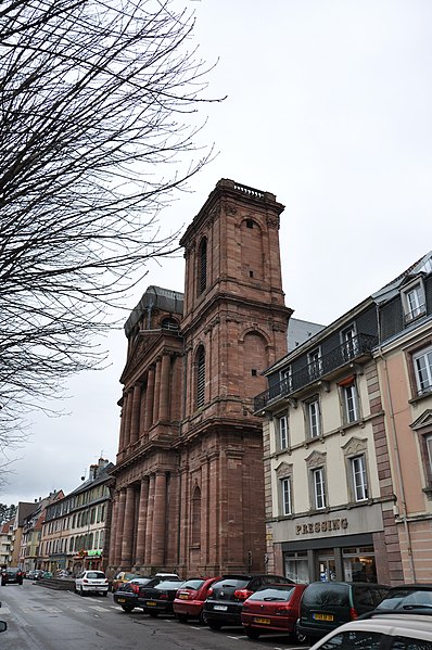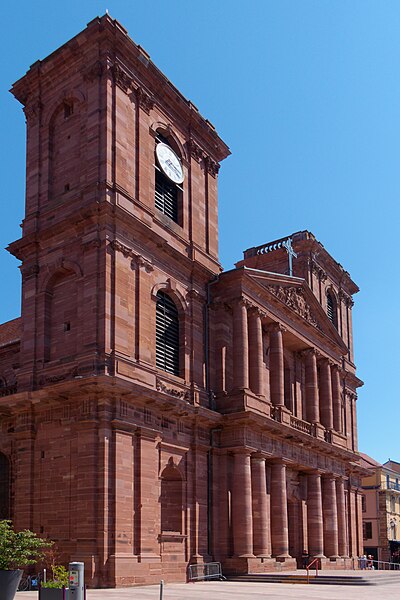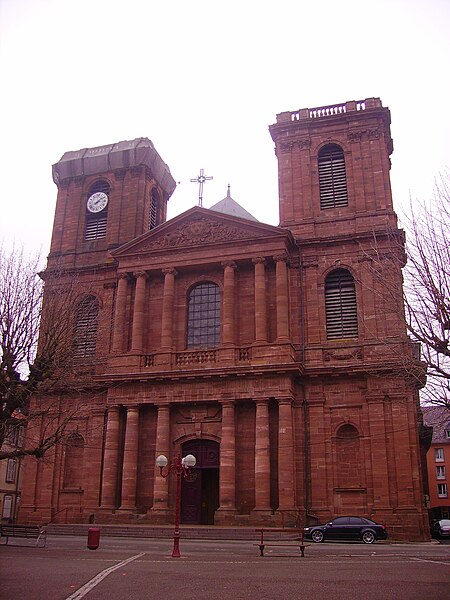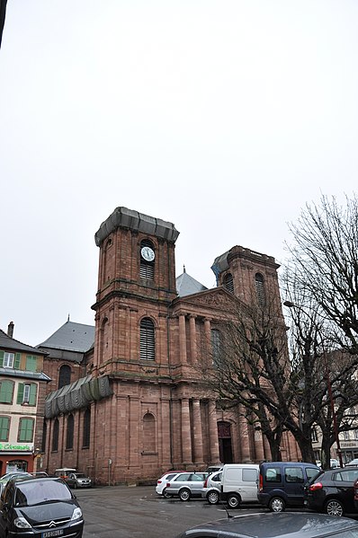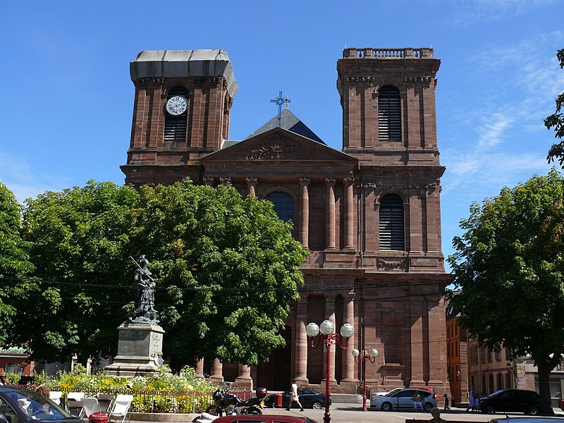 La cathédrale Saint‑Christophe, située à Belfort, est le siège du diocèse de Belfort‑Montbéliard. Elle a été construite comme église abbatiale de 1727 à 1750 par l'entrepreneur Henri Schuller d'après des plans de Jacques Philippe Mareschal, ingénieur ordinaire du roi à Strasbourg, qui ne put assurer lui‑même l'exécution. Le devis s'élevait à 146 334 livres. La pierre provient de la carrière de grès rose d'Offemont, à trois kilomètres de Belfort. L'adjudication des fondations eut lieu le 12 octobre 1727 et la bénédiction du terrain et de la première pierre fut célébrée le 16 octobre par le prévôt de la collégiale Jean‑Claude Noblat, délégué de son altesse de Grimaldi. Les fondations furent rapidement exécutées et Mareschal établit plusieurs plans au cours du chantier. L'abbatiale fut ouverte au culte en 1750, mais les travaux ne furent réellement achevés qu'en 1845, date de la construction de la tour sud. Le fils d'Henri Schuller fut abbé de cette église abbatiale. Le bâtiment a été classé au titre des monuments historiques en 1930. L'église a été érigée en cathédrale en 1979 lors de la création du diocèse de Belfort‑Montbéliard. Des travaux de restauration de la façade, des terrasses de la tour nord et de l'horloge ont été menés de 2016 à 2018. En septembre 2020, une restauration de la toiture a remplacé les ardoises par des tuiles et rénové gouttières et corniches. Après une défaillance grave du système de chauffage en 2023, des travaux ont été effectués et achevés le 15 mars 2024 ; pendant leur durée, les offices ont été assurés à l'église Saint‑Joseph de Belfort. La cathédrale est desservie par la paroisse Saint‑Jean‑Baptiste au sein du diocèse ; deux messes dominicales sont célébrées chaque semaine — une messe solennelle le matin et une messe en soirée destinée aux étudiants et jeunes professionnels — ainsi qu'une messe le premier vendredi du mois. Baptêmes, mariages et funérailles y sont également célébrés, et la cathédrale accueille occasionnellement des cérémonies diocésaines telles que ordinations, jubilés de prêtres ou messes chrismales. La façade principale se compose de trois parties verticales : un porche formant l'avant‑corps donnant accès à la grande nef, flanqué de deux tours. Le mobilier de l'édifice, protégé au titre des monuments historiques, rassemble des œuvres d'art d'artistes franc‑comtois. Les sculptures sont signées Antoine Cupillard et les tableaux sont dus au Belfortain Gustave Dauphin. La cathédrale possède deux orgues : l'orgue de tribune, réalisé par Jean‑Baptiste Waltrin et installé en 1752, a été rénové à plusieurs reprises et est classé monument historique, tandis que l'orgue de chœur est l'œuvre du facteur Henri Didier. Une restauration complète des orgues a été effectuée en 2012 : le relevage par Peter Meier, le nettoyage de la tuyauterie par Marco Venegoni et l'harmonisation par Jean‑Marie Tricoteaux. Les jeux des instruments comprennent de nombreux registres — bourdons, montres, flûtes, nazards, mixtures, jeux de fonds et jeux de cuivres — attestant de leur riche facture. Les titulaires de ces instruments sont Jean‑Charles Ablitzer (titulaire) et Emmanuel Georges (co‑titulaire). La cathédrale abrite huit cloches, fondues par Ferdinand Farnier à Robécourt en 1903, qui portent les noms Anne‑Charlotte, Élisabeth, Josepha‑Maria‑Paula, Julie, Eugénie, Marie‑Louise, Marie‑Thérèse et Bernadette. Ces cloches, réparties entre les tours nord et sud, vont de 220 kg à 4 425 kg et de 71,2 cm à 1,92 m de diamètre, avec des notes réparties sur plusieurs registres.