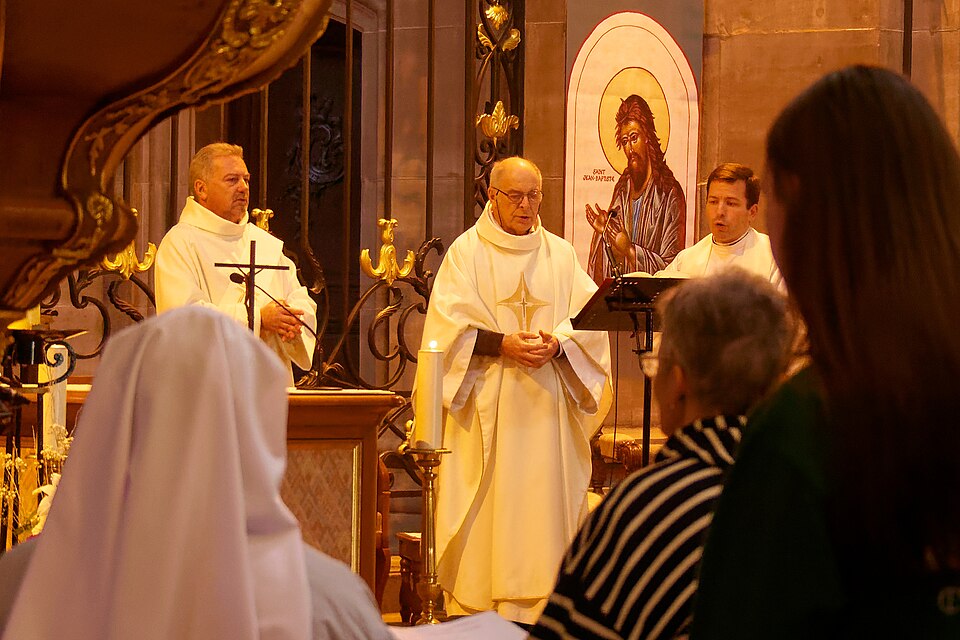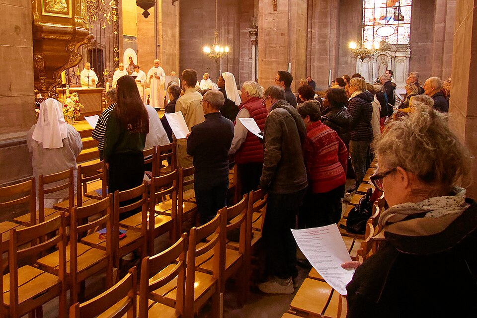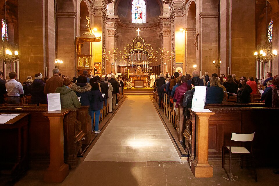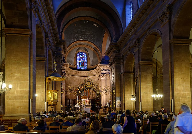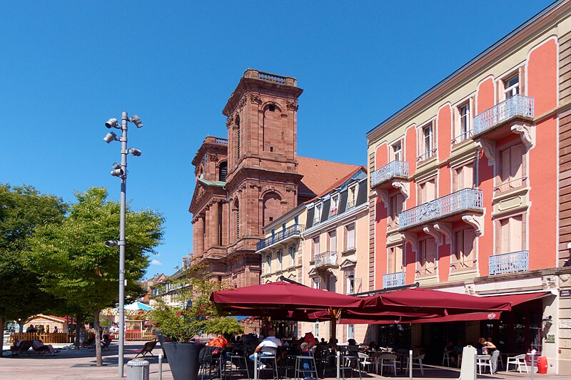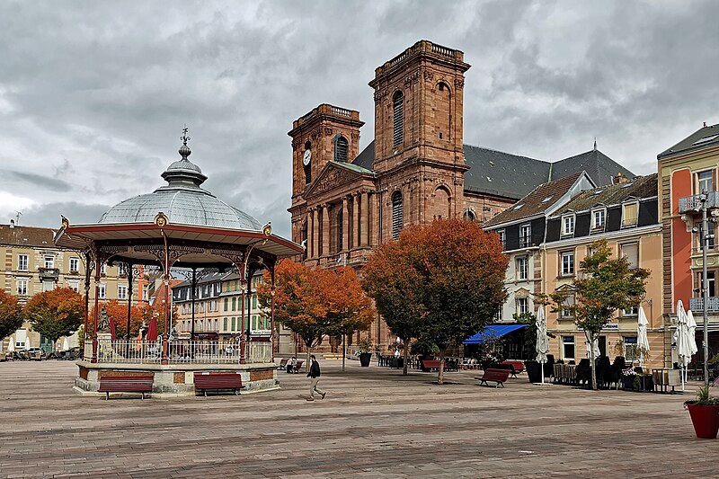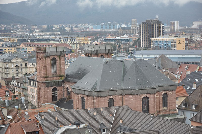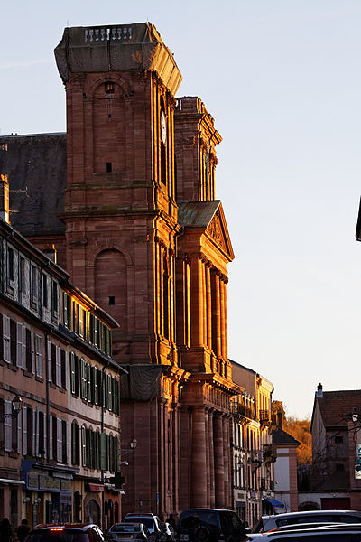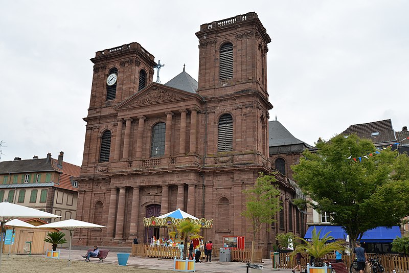 La cathédrale Saint‑Christophe, située à Belfort, est le siège du diocèse de Belfort‑Montbéliard. Elle a été construite comme église abbatiale de 1727 à 1750 par l'entrepreneur Henri Schuller d'après des plans de Jacques Philippe Mareschal, ingénieur ordinaire du roi à Strasbourg, qui ne put assurer lui‑même l'exécution. Le devis s'élevait à 146 334 livres. La pierre provient de la carrière de grès rose d'Offemont, à trois kilomètres de Belfort. L'adjudication des fondations eut lieu le 12 octobre 1727 et la bénédiction du terrain et de la première pierre fut célébrée le 16 octobre par le prévôt de la collégiale Jean‑Claude Noblat, délégué de son altesse de Grimaldi. Les fondations furent rapidement exécutées et Mareschal établit plusieurs plans au cours du chantier. L'abbatiale fut ouverte au culte en 1750, mais les travaux ne furent réellement achevés qu'en 1845, date de la construction de la tour sud. Le fils d'Henri Schuller fut abbé de cette église abbatiale. Le bâtiment a été classé au titre des monuments historiques en 1930. L'église a été érigée en cathédrale en 1979 lors de la création du diocèse de Belfort‑Montbéliard. Des travaux de restauration de la façade, des terrasses de la tour nord et de l'horloge ont été menés de 2016 à 2018. En septembre 2020, une restauration de la toiture a remplacé les ardoises par des tuiles et rénové gouttières et corniches. Après une défaillance grave du système de chauffage en 2023, des travaux ont été effectués et achevés le 15 mars 2024 ; pendant leur durée, les offices ont été assurés à l'église Saint‑Joseph de Belfort. La cathédrale est desservie par la paroisse Saint‑Jean‑Baptiste au sein du diocèse ; deux messes dominicales sont célébrées chaque semaine — une messe solennelle le matin et une messe en soirée destinée aux étudiants et jeunes professionnels — ainsi qu'une messe le premier vendredi du mois. Baptêmes, mariages et funérailles y sont également célébrés, et la cathédrale accueille occasionnellement des cérémonies diocésaines telles que ordinations, jubilés de prêtres ou messes chrismales. La façade principale se compose de trois parties verticales : un porche formant l'avant‑corps donnant accès à la grande nef, flanqué de deux tours. Le mobilier de l'édifice, protégé au titre des monuments historiques, rassemble des œuvres d'art d'artistes franc‑comtois. Les sculptures sont signées Antoine Cupillard et les tableaux sont dus au Belfortain Gustave Dauphin. La cathédrale possède deux orgues : l'orgue de tribune, réalisé par Jean‑Baptiste Waltrin et installé en 1752, a été rénové à plusieurs reprises et est classé monument historique, tandis que l'orgue de chœur est l'œuvre du facteur Henri Didier. Une restauration complète des orgues a été effectuée en 2012 : le relevage par Peter Meier, le nettoyage de la tuyauterie par Marco Venegoni et l'harmonisation par Jean‑Marie Tricoteaux. Les jeux des instruments comprennent de nombreux registres — bourdons, montres, flûtes, nazards, mixtures, jeux de fonds et jeux de cuivres — attestant de leur riche facture. Les titulaires de ces instruments sont Jean‑Charles Ablitzer (titulaire) et Emmanuel Georges (co‑titulaire). La cathédrale abrite huit cloches, fondues par Ferdinand Farnier à Robécourt en 1903, qui portent les noms Anne‑Charlotte, Élisabeth, Josepha‑Maria‑Paula, Julie, Eugénie, Marie‑Louise, Marie‑Thérèse et Bernadette. Ces cloches, réparties entre les tours nord et sud, vont de 220 kg à 4 425 kg et de 71,2 cm à 1,92 m de diamètre, avec des notes réparties sur plusieurs registres.