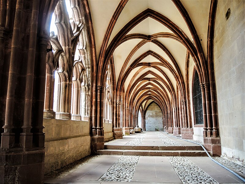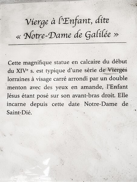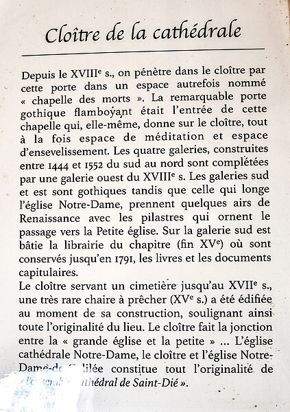 La cathédrale Saint‑Dié, l’église Notre‑Dame de Galilée et le cloître qui les relie forment un ensemble cathédral homogène par la couleur du grès rose des Vosges, malgré la diversité des apports stylistiques. L’église trouve son origine dans la fondation attribuée à saint Déodat, moine irlandais du VIIe siècle ; d’église abbatiale elle devint collégiale au cours du haut Moyen Âge. René II considérait l’édifice comme la quatrième « cathédrale » du duché de Lorraine et l’église fut érigée en évêché par la bulle du pape Pie VI en 1777. Classée monument historique en 1886, la cathédrale a connu plusieurs incendies et fut partiellement dynamitée en 1944, perdant l’ensemble de sa voûte ; elle a été reconstruite à l’identique, dotée d’un nouveau mobilier et consacrée à nouveau en septembre 1974. Des vitraux modernes non figuratifs, conçus par des artistes contemporains, ont été réalisés au milieu des années 1980.