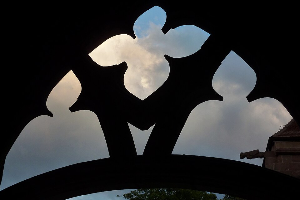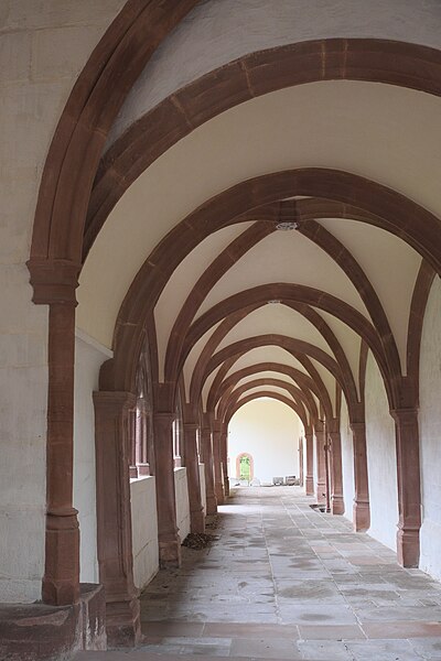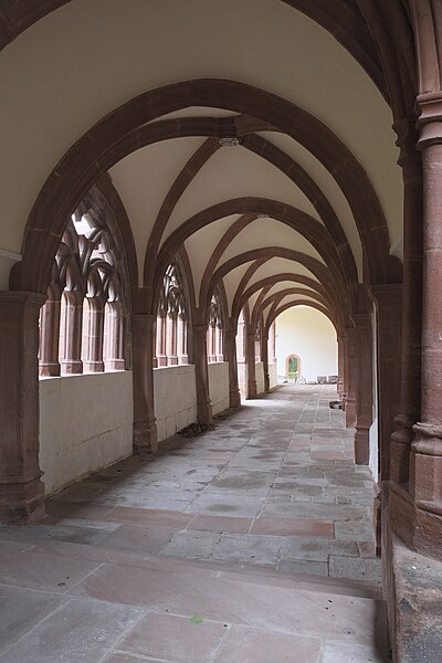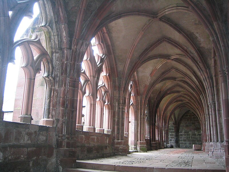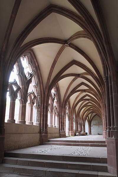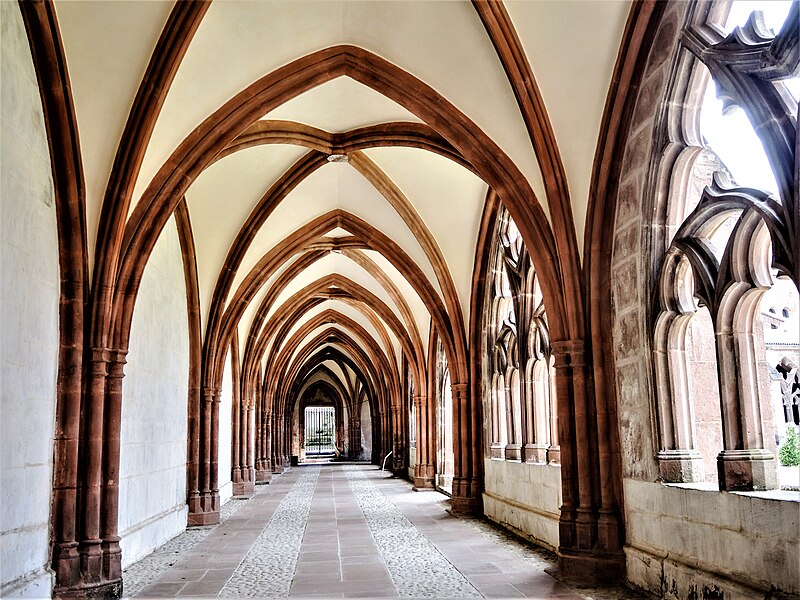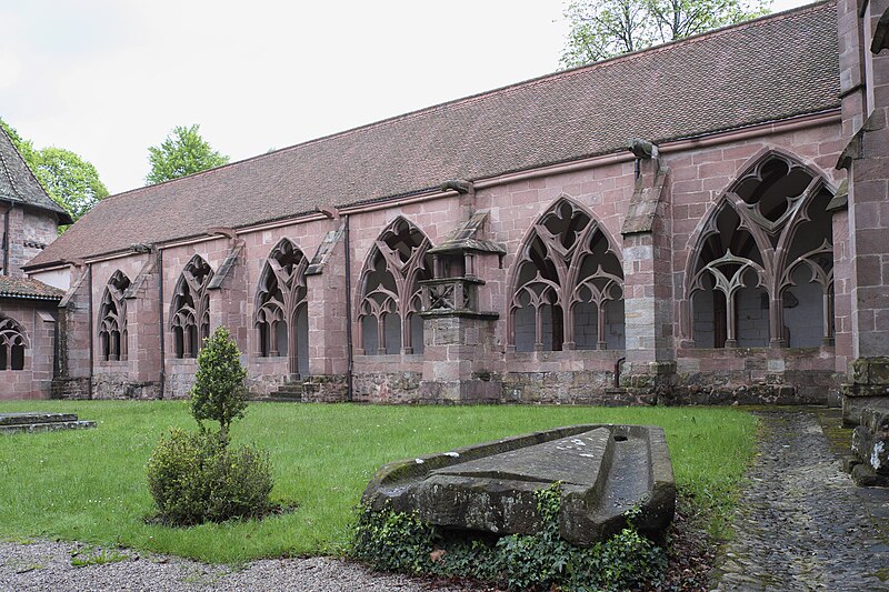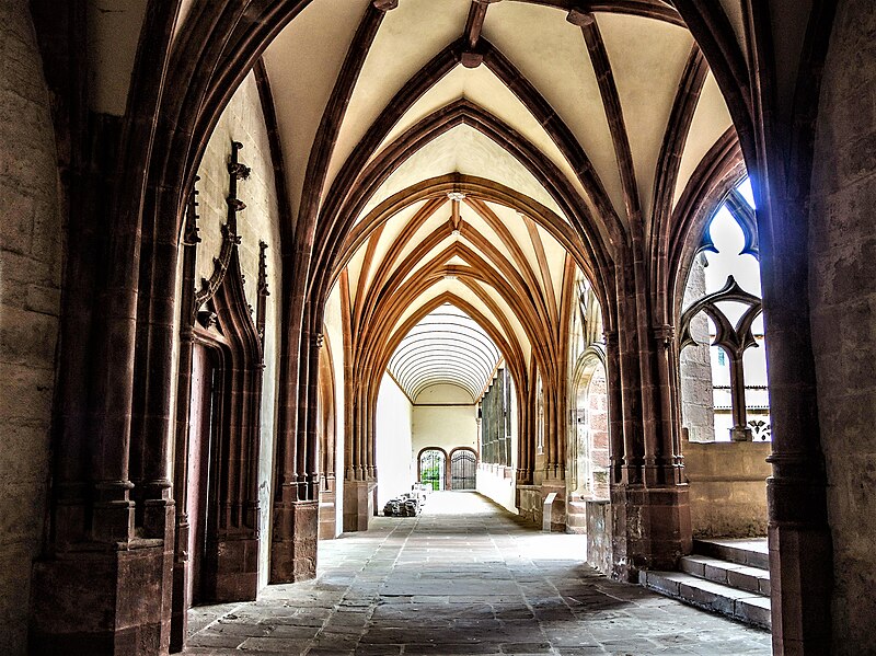 Le cloître gothique, vaste passage entre Notre‑Dame de Galilée et la cathédrale, présente des galeries des XVe‑XVIe siècles rémployant des formules gothiques et des pilastres à la Renaissance ; sa reconstruction avait été décidée en 1444 et l’édifice resta inachevé après un incendie en 1554. On y note un tympan avec vestiges d’une peinture commémorant une visite princière en 1547, une chaire extérieure et une tourelle d’escalier donnant accès à une salle de trois travées édifiée en 1445‑1446 qui abrita jusqu’en 1790 la librairie du chapitre ; certains manuscrits de cette collection figurent aujourd’hui dans les fonds anciens de la médiathèque locale. Une gargouille dite « Iroquoise », datant vraisemblablement de la fin du XVe siècle, a été restaurée et réinstallée dans le cloître après avoir été protégée au musée.