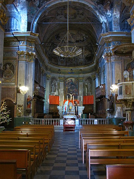 De plan en croix latine, l'église comprend une nef de trois travées — la travée centrale étant plus petite — des chapelles insérées entre les contreforts, un transept et un chœur aboutissant à une abside circulaire. L'ensemble est couvert de voûtes en berceau avec arcs doubleaux et lunettes, les travées étant séparées par des pilastres qui supportent un entablement de facture classique. Une coupole surmonte la croisée du transept ; elle est formée de deux voûtes en quart de sphère réunies par une voûte en berceau, repose sur quatre pendentifs circulaires peints et, à l'extérieur, s'élève sur un tambour orné de pilastres pour être couronnée d'un petit campanile aux arcs en plein cintre retombant sur des colonnes. La couverture du dôme reprend un système de type génois : des ardoises circulaires disposées selon les génératrices, de dimensions décroissantes vers le campanile. À l'extérieur se dresse en outre un clocher isolé dominant les maisons.