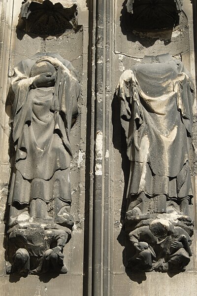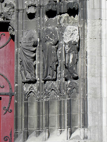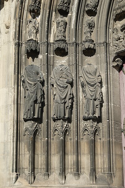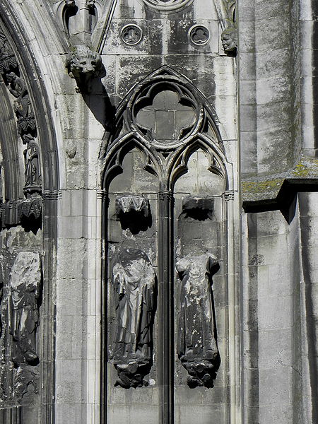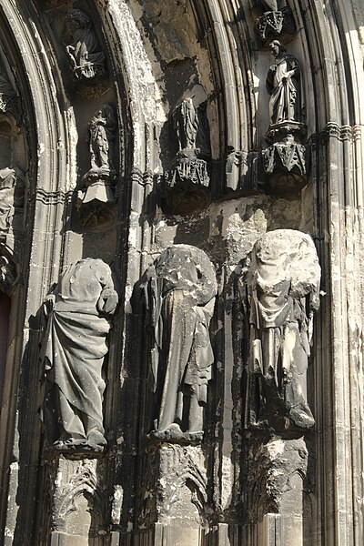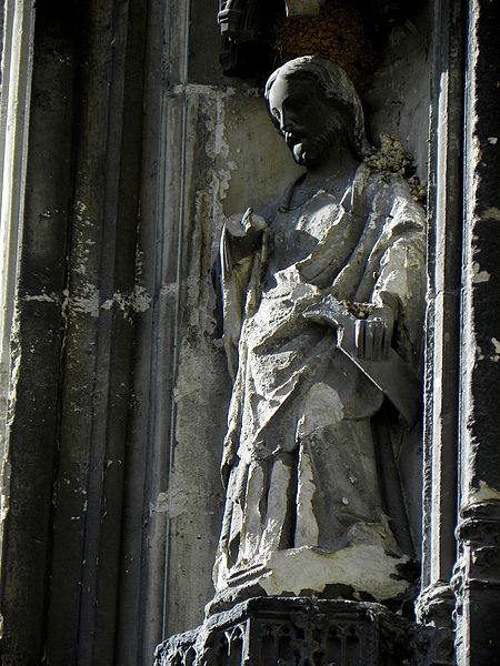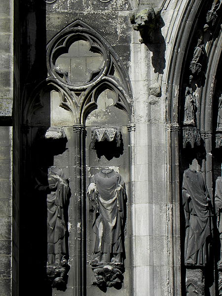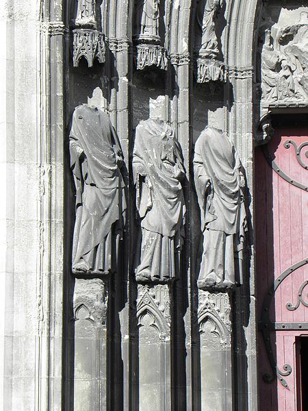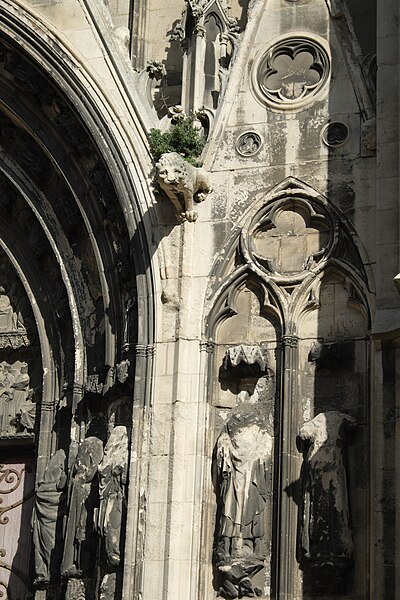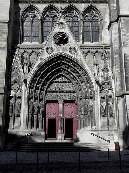 La façade ouest présente trois portails dont le portail central est consacré au Jugement dernier ; le tympan gauche relate la vie de saint Jean-Baptiste et le tympan droit la vie de la Vierge. La tour nord, haute de 60 mètres, est la seule tour achevée ; la tour sud, construite en bois pour abriter provisoirement les cloches, est restée en place et est appelée la « tour noire ». Une grande rosace flamboyante du XVe siècle orne la façade. Du côté sud, le portail Saint-Étienne ou portail des Merciers représente la vie du saint, tandis que le portail nord du transept, également dédié à saint Étienne, est aujourd'hui fermé et situé dans la cour de la cité épiscopale ; une porte dite « de Maugarni » ouvre sur le déambulatoire du chœur.