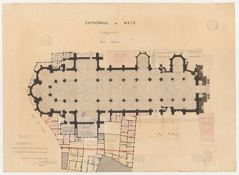 Aux XVIIe et XVIIIe siècles la cathédrale connaît des usages ecclésiastiques marquants — Jacques‑Bénigne Bossuet y commence sa carrière — et, au XVIIIe siècle, l'architecte Jacques‑François Blondel réalise un portail néoclassique et des arcades en relation avec un projet de place royale qui modifient les abords. Le goût romantique du XIXe siècle et les restaurations idéalisées conduites sous l'annexion allemande trouvent leur aboutissement dans la vaste campagne conduite par l'architecte Paul Tornow à partir de 1874 : un incendie de la toiture en 1877 entraîne la reconstruction du comble en fermes métalliques et en couverture de cuivre, la surélévation modifiant la volumétrie, et un portail néogothique est inauguré en 1903.