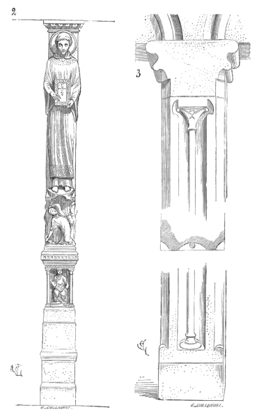 La façade principale présente trois portails dédiés, du nord au sud, à saint Jean‑Baptiste, à saint Étienne et à la Vierge ; les voussures sculptées au XIIe siècle témoignent d'une évolution notable de la statuaire médiévale et les tympans ont été mis en place ultérieurement. Le portail nord, lié à la tour dite de Plomb, montre des scènes de la vie de saint Jean‑Baptiste et des allégories tandis que le portail central, en grande partie rescapé de l'effondrement de 1268, articule le monde terrestre et le monde céleste autour des apôtres dont la plupart furent détruits à la Révolution. Le portail sud est consacré à la Vierge avec des scènes de la Dormition, de l'Assomption et du Couronnement.