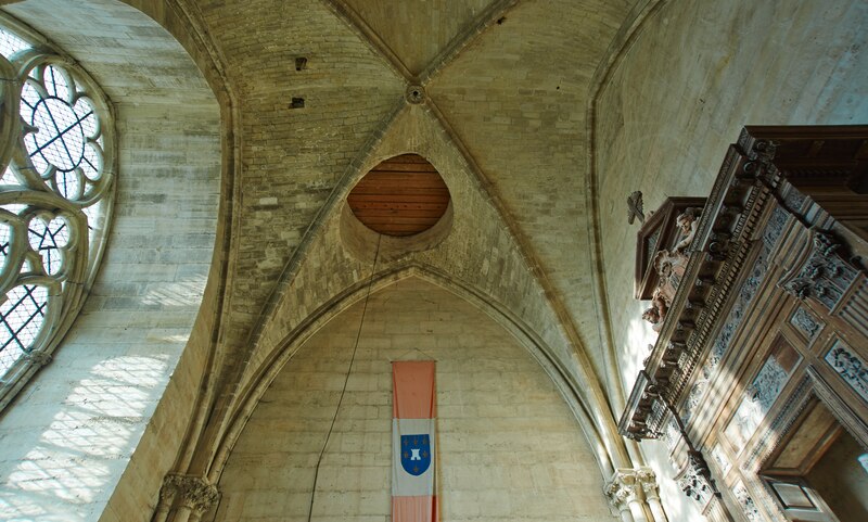 L'intérieur présente une nef large et lumineuse de 15,25 mètres de clair‑axe et de 24,4 mètres de hauteur, à élévation sur trois niveaux et voûtée en système sexpartite, avec l'alternance de piliers forts et faibles. La première travée a été modifiée après l'effondrement de la tour sud ; la chapelle Sainte‑Croix, située sous le clocher, est appelée « chapelle des cloches ». La nef abrite le monument funéraire des Salazar, œuvre achevée en 1516, composée d'un retable calcaire à la frise gothique tardive et d'un haut baldaquin en pierre bleue de Belgique assemblé à l'identique en 1943 après sa mise à bas révolutionnaire.