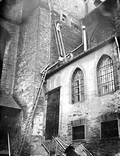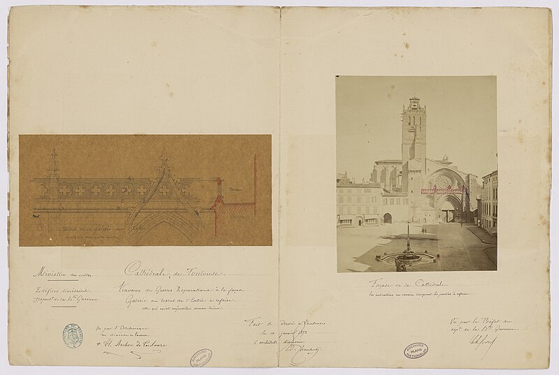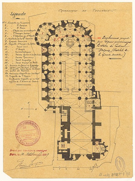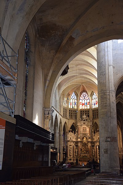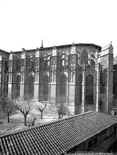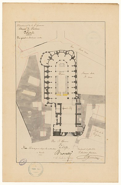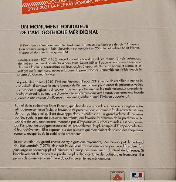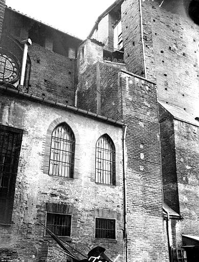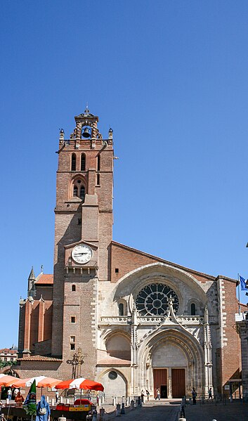 La cathédrale Saint-Étienne de Toulouse a fait l'objet de campagnes de construction du XIe au XXe siècle. Elle occupe le centre historique de Toulouse et jouxte l'ancien palais épiscopal, aujourd'hui préfecture. Ses origines sont difficiles à préciser : l'ouvrage repose sur les fondations d'une chapelle attribuée à saint Saturnin au IIIe siècle et reconstruite par saint Exupère quelque cent cinquante ans plus tard, et il apparaît dans les textes dès 844. Un premier édifice roman, lancé sous l'épiscopat d'Isarn à la fin du XIe siècle, aurait mesuré environ 20 m de largeur sur 85 m de longueur ; des vestiges de ce bâtiment subsistent dans le mur sud du chœur et les murs nord et sud de la nef actuelle. Au début du XIIIe siècle la cathédrale est rebâtie sur ces fondations : la nouvelle église, large de 19 m et haute de 20 m, conserve principalement la nef et constitue l'un des premiers exemples du gothique méridional. Sous l'épiscopat de Bertrand de l'Isle-Jourdain, un projet inspiré de la cathédrale de Narbonne est lancé et le chevet est commencé en 1272, mais les travaux s'arrêtent au niveau du triforium du chœur. Aux XVe et XVIe siècles, des remaniements importants sont entrepris : Pierre du Moulin fait remanier le portail occidental, Bernard de Rousergue raccorde le chœur à la nef et fait bâtir deux chapelles, et en 1518 le maître d'œuvre Jean Clari élève la grande sacristie au nord-est du chœur. Au début du XVIe siècle, le cardinal Jean d'Orléans fait élever un pilier monumental destiné à la construction d'un transept qui ne sera pas réalisé ; une chapelle du chœur et le clocher datent également de son épiscopat. Un incendie en 1609 détruit la toiture provisoire du chœur et une partie du mobilier ; l'architecte Pierre Levesville fait alors élever en urgence les voûtes d'ogives et leurs arcs-boutants. De nombreux projets visant à harmoniser chœur et nef se succèdent jusque dans la première moitié du XXe siècle : le plan de l'architecte en chef des Monuments historiques Saint-Anne de Louzier est adopté en 1911, mais seule la construction d'un portail monumental sur la façade nord sera réalisée. Au sud de la cathédrale se trouvaient un cloître, détruit à la Révolution, et l'église Saint-Jacques, probablement fondée au IXe siècle ; cette église, intégrée au groupe épiscopal, perdit peu à peu ses fonctions liturgiques au profit de Saint-Étienne avant d'être démolie en 1811 pour le prolongement de la rue Sainte-Anne et remplacée par la chapelle Sainte-Anne, dont l'achèvement est postérieur à 1830 selon Jules Chalande. Les bâtiments accolés à la cathédrale et ouverts sur l'impasse de la Préfecture abritent un logement et l'escalier de la bibliothèque du clergé, construite en 1775 à la demande de l'archevêque Loménie de Brienne par l'architecte Jean-Arnaud Raymond, inscription gravée dans la cage d'escalier; un long bâtiment sur la rue Sainte-Anne, élevé après 1830, a été récemment remanié. L'architecture de Saint-Étienne réunit des éléments romans, du gothique méridional et du gothique rayonnant, reflet d'interventions étalées sur plusieurs siècles et de projets souvent inachevés. Ce contraste se manifeste dans la nef « raimondine », vaste vaisseau d'une seule portée caractéristique du Midi, accolée à un chœur de style d'Île-de-France, plus large et plus lumineux, reliés entre eux au XVIe siècle. La cathédrale conserve des vestiges de la construction romane, comme des oculi à appareil alterné de brique et de pierre et des restes de la tour nord noyés à la base du grand clocher, visibles depuis le square du Cardinal Saliège. Les campagnes de restauration des XIXe et XXe siècles ont modifié certains aménagements intérieurs et extérieurs, et des interventions récentes ont visé la maçonnerie et le pignon devant la rosace. Classée au titre des monuments historiques en 1862, Saint-Étienne reste le siège de l'archevêché et une paroisse active au cœur du quartier qui porte son nom.