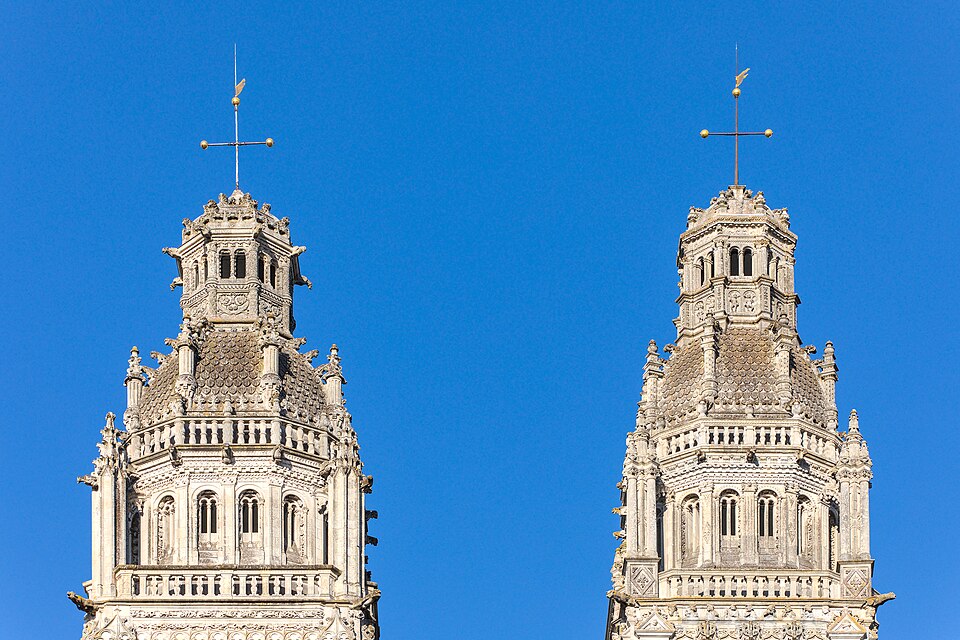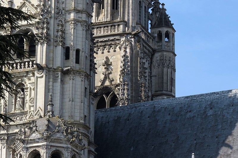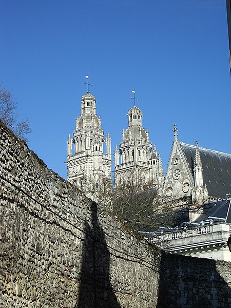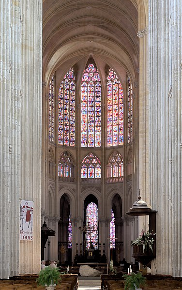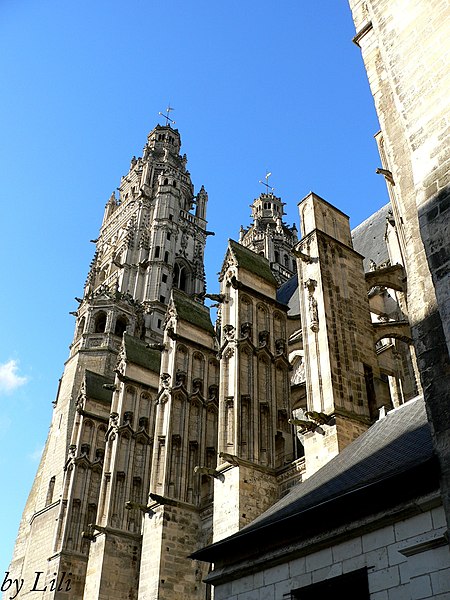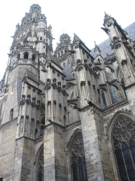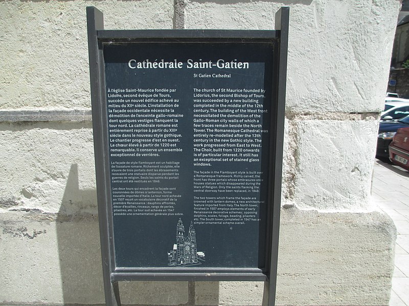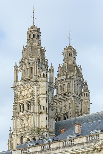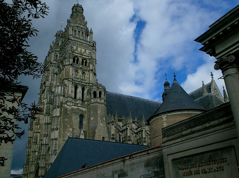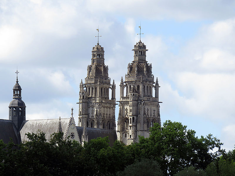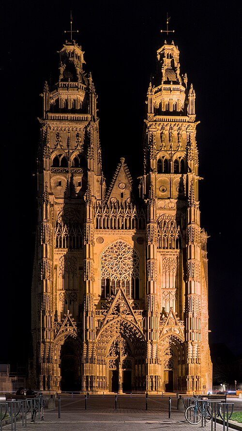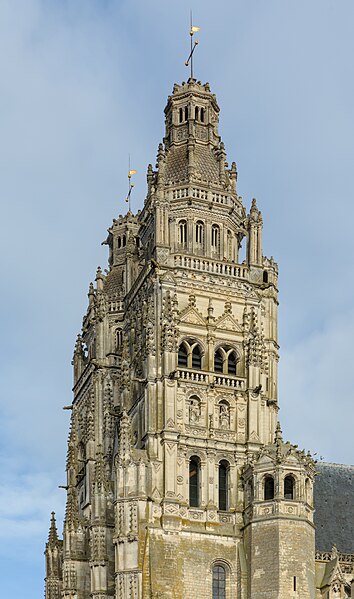 La cathédrale Saint‑Gatien de Tours, dédiée à saint Gatien, premier évêque de la cité, est le siège de l'archidiocèse de Tours et la cathédrale métropolitaine de sa province ecclésiastique ; elle est située dans le Vieux‑Tours et classée au titre des monuments historiques depuis la liste de 1862. Elle succède à la première cathédrale Saint‑Maurice, édifiée sous l'épiscopat de Lidoire (337‑371), incendiée en 561, restaurée par Grégoire de Tours et dédiée en 590. La construction de l'édifice actuel s'étend de 1170 à 1547 et remplace l'ancien bâtiment roman ; les travaux ont commencé par le croisillon sud et les tours dès 1170. Le chœur, daté traditionnellement entre 1236 et 1279, a fait l'objet d'études récentes proposant des parties basses vers 1220‑1230 et la pose de la charpente des vitraux du triforium vers 1245‑1255, contribuant à l'affirmation d'un style ligérien au sein du gothique. La nef, entamée par Simon du Mans après la reconstruction du transept, progresse lentement : six travées, bas‑côtés et chapelles datent du XIVe siècle, tandis que les deux premières travées remontent au XIIe siècle ; elle est achevée au XVe siècle grâce aux interventions d'architectes tels que Jean de Dammartin, Jean Papin et Jean Durand, soutenus par des libéralités royales et ducales. La façade monumentale, élevée du début du XVe au milieu du XVIe siècle, achève le grand projet de reconstruction ; elle se distingue par son parti élancé et l'opulence de sa sculpture, reflet du gothique flamboyant, et l'essentiel des choix architecturaux retenus entre 1430 et 1470 est dû à Jean de Dampmartin. De nombreuses statues des piédroits furent détruites lors des guerres de religion de 1562 ; les tours, quant à elles, sont élevées au début du XVIe siècle : la tour nord, attribuée à Pierre de Valence, date de 1507, et la tour sud, attribuée à Pierre Gadier, est datée de 1534‑1547. La cathédrale illustre un ensemble stylistique complet du XIIe au XVIe siècle : bases et contreforts des tours d'inspiration romane, ornementation gothique rayonnante et flamboyante, et sommets des tours dans un style de transition proche de la Renaissance. Ses dimensions sont imposantes : 100 m de longueur, 28 m de largeur, 46 m d'ouverture au transept, 29 m de hauteur sous les voûtes (11 m sous les bas‑côtés) ; les tours culminent à environ 68 et 69 m. L'ensemble vitré constitue un des trésors de la cathédrale : les vitraux du déambulatoire et les verrières hautes du chœur forment un ensemble de verrières à médaillons du XIIIe siècle parmi les plus complets et intacts d'Europe ; s'y ajoutent deux roses du transept (XIVe siècle), des verrières de la nef et de la façade (XVe siècle) et d'autres panneaux provenant d'églises disparues, acquis par le chapitre à la fin du XVIIIe et au début du XIXe siècle et aujourd'hui principalement présentés dans le déambulatoire. L'atelier Lobin a restauré et remonté ces vitraux entre 1841 et 1863 ; certains panneaux rejetés ont été vendus sur le marché de l'art, un ensemble sur la Création ayant été racheté en 1916 et replacé dans une chapelle latérale sud, tandis que d'autres morceaux ont été identifiés dans des musées américains. Lors de la restauration du bras nord du transept lancée en 2009, quatre grandes fenêtres furent dotées de verrières contemporaines à la suite d'un concours de 2011 ; le projet retenu, centré sur la thématique de saint Martin, a été réalisé par Gérard Collin‑Thiébaut et le maître‑verrier Pierre‑Alain Parot. Le mobilier conserve notamment le tombeau en marbre de Carrare de deux enfants de Charles VIII et d'Anne de Bretagne, attribué à l'école de Michel Colombe avec un soubassement de Girolamo Paciarotto ; ce monument provenait de la collégiale Saint‑Martin en 1506, fut démantelé à la Révolution, remonté à Saint‑Gatien en 1814 et restauré en 1834. La cathédrale possédait quatre tapisseries d'Aubusson du XVIIe siècle, classées en 1892 et volées dans la nuit du 27 au 28 mars 1903 par Alexandre Jacob. Depuis 2011, un grand tabernacle du XVIIe siècle en chêne plaqué d'ébène et d'ivoire, provenant d'une chartreuse puis d'un carmel et passé par le domaine de Chambord, a été transféré, rénové et installé dans une chapelle du déambulatoire avec soubassement et grille de protection. La polychromie murale a été révélée par la découverte de peintures dans la chapelle de la Vierge en 1873 et par des sondages archéologiques en 1993 : des couches successives attestent un fond en chaux blanche puis un fond ocre jaune à faux‑joints clairs, des filets noirs, des décors floraux rouge et vert à applications métalliques à la fin du Moyen Âge, puis des repeints modernes — notamment l'intervention de l'Italien Borrany en 1787 et un blanchissage en 1844 ; lors de la restauration du chœur en 1994, la volonté a été de restituer la polychromie la plus ancienne, à fond ocre et faux‑joints clairs. Le buffet d'orgues, traditionnellement attribué à un don de l'archevêque Martin de Beaune au XVIe siècle sans documentation, est placé sur une tribune en bois au fond du bras sud du transept ; il a été endommagé pendant les guerres de religion, restauré et en partie reconstruit autour de 1620, et son buffet actuel conserve le style de cette époque, tandis que le nombre exact de jeux et de tuyaux reste inconnu. La tour sud abrite une sonnerie de quatre cloches : Christus (Do3, 1 900 kg, fondu en 1749 par Nicolas Mutel et Nicolas Barret), Maurice (Ré3, 1 350 kg, fondu en 1864 par Bollée père et fils), Gatien (Mi3, 980 kg, fondu en 1864 par Bollée père et fils) et Martin (Si♭3, 310 kg, datée du XIVe siècle) ; la cloche Christus provient de l'abbaye Saint‑Paul de Cormery et, après des épisodes de résistance locale aux réquisitions révolutionnaires et un transfert, elle fut installé
