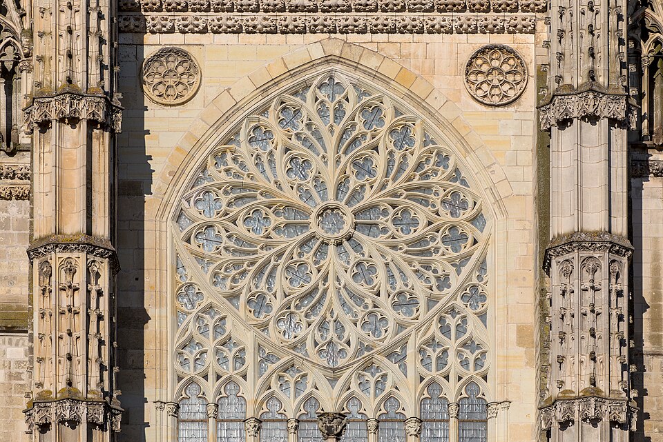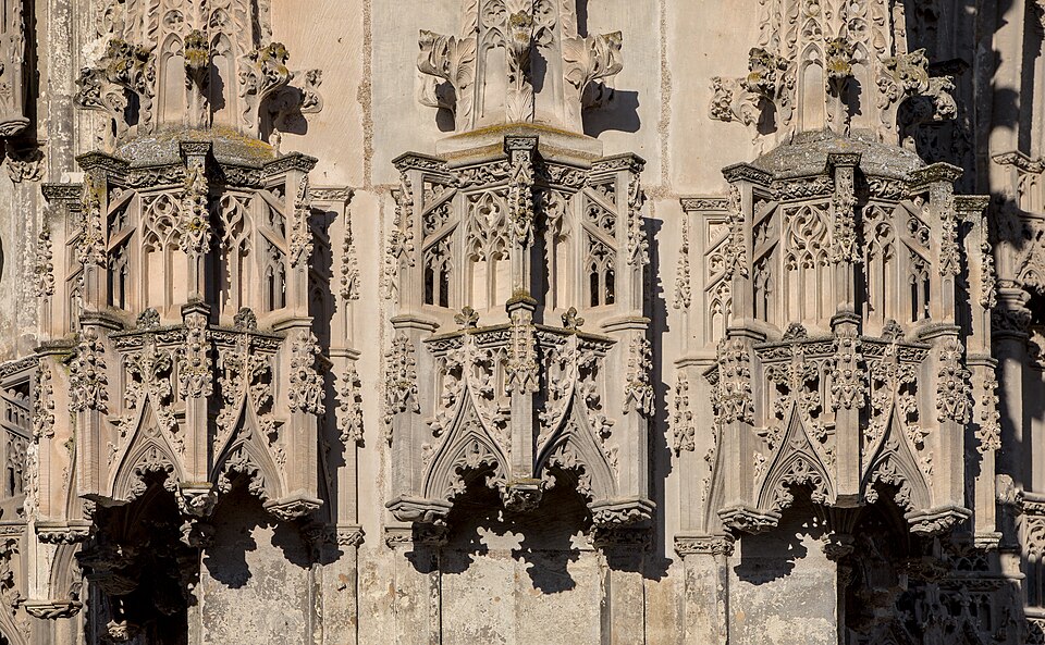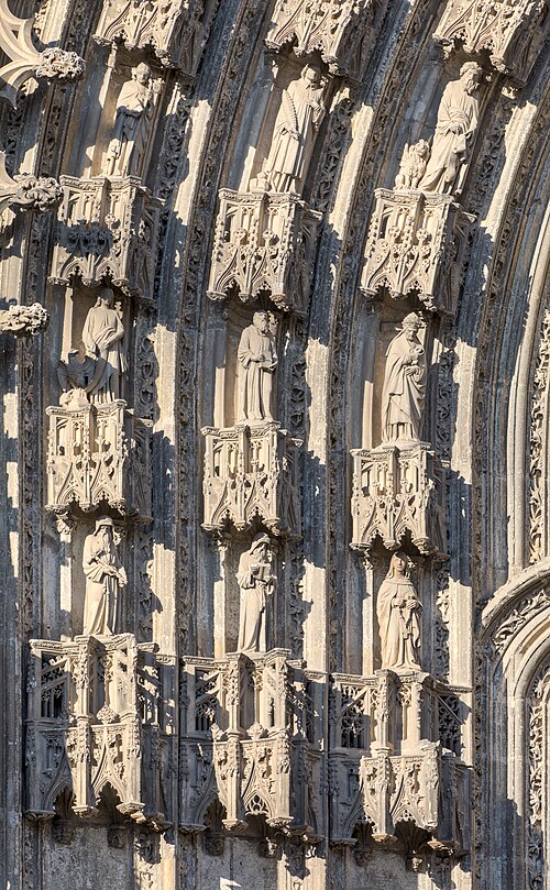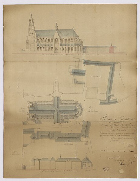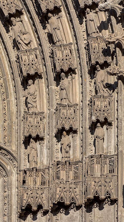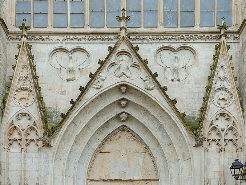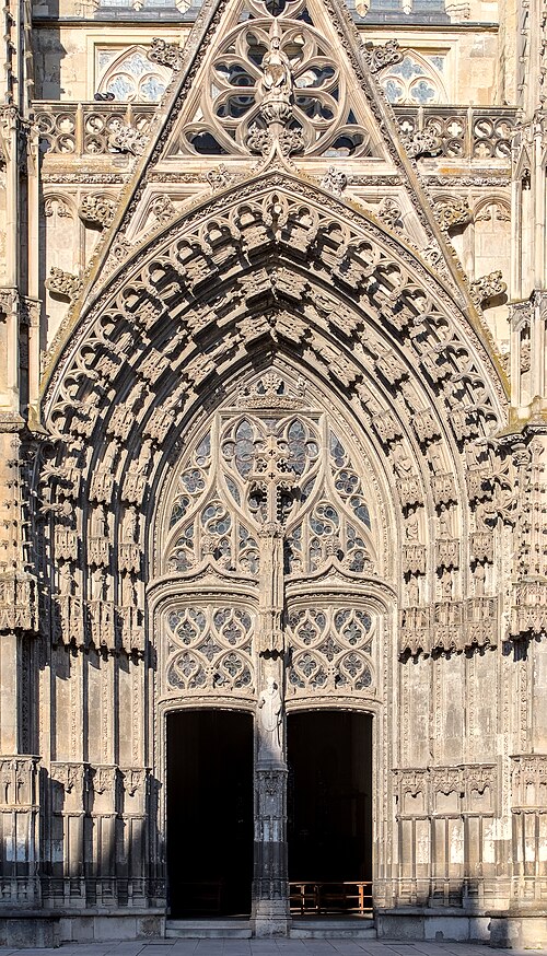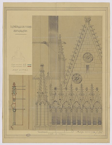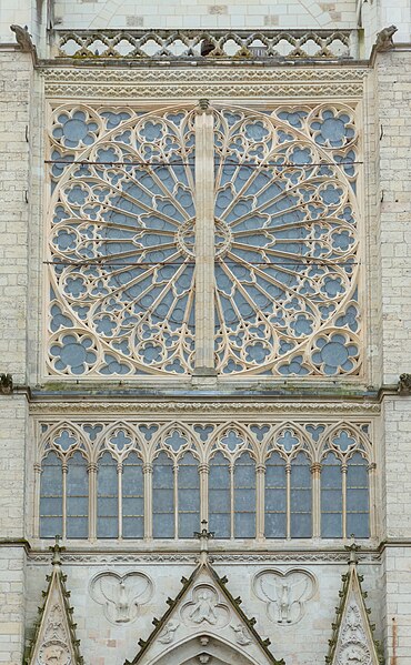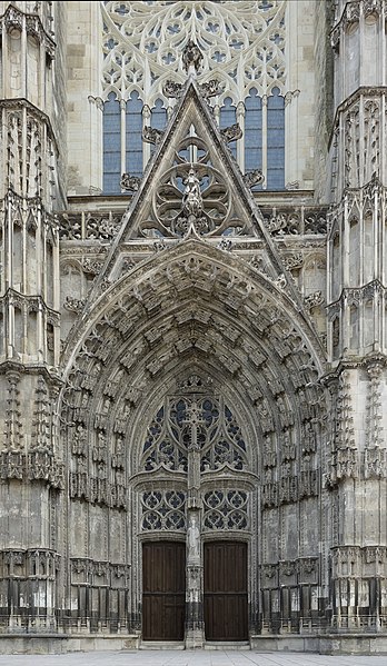 La cathédrale Saint‑Gatien de Tours, dédiée à saint Gatien, premier évêque de la cité, est le siège de l'archidiocèse de Tours et la cathédrale métropolitaine de sa province ecclésiastique ; elle est située dans le Vieux‑Tours et classée au titre des monuments historiques depuis la liste de 1862. Elle succède à la première cathédrale Saint‑Maurice, édifiée sous l'épiscopat de Lidoire (337‑371), incendiée en 561, restaurée par Grégoire de Tours et dédiée en 590. La construction de l'édifice actuel s'étend de 1170 à 1547 et remplace l'ancien bâtiment roman ; les travaux ont commencé par le croisillon sud et les tours dès 1170. Le chœur, daté traditionnellement entre 1236 et 1279, a fait l'objet d'études récentes proposant des parties basses vers 1220‑1230 et la pose de la charpente des vitraux du triforium vers 1245‑1255, contribuant à l'affirmation d'un style ligérien au sein du gothique. La nef, entamée par Simon du Mans après la reconstruction du transept, progresse lentement : six travées, bas‑côtés et chapelles datent du XIVe siècle, tandis que les deux premières travées remontent au XIIe siècle ; elle est achevée au XVe siècle grâce aux interventions d'architectes tels que Jean de Dammartin, Jean Papin et Jean Durand, soutenus par des libéralités royales et ducales. La façade monumentale, élevée du début du XVe au milieu du XVIe siècle, achève le grand projet de reconstruction ; elle se distingue par son parti élancé et l'opulence de sa sculpture, reflet du gothique flamboyant, et l'essentiel des choix architecturaux retenus entre 1430 et 1470 est dû à Jean de Dampmartin. De nombreuses statues des piédroits furent détruites lors des guerres de religion de 1562 ; les tours, quant à elles, sont élevées au début du XVIe siècle : la tour nord, attribuée à Pierre de Valence, date de 1507, et la tour sud, attribuée à Pierre Gadier, est datée de 1534‑1547. La cathédrale illustre un ensemble stylistique complet du XIIe au XVIe siècle : bases et contreforts des tours d'inspiration romane, ornementation gothique rayonnante et flamboyante, et sommets des tours dans un style de transition proche de la Renaissance. Ses dimensions sont imposantes : 100 m de longueur, 28 m de largeur, 46 m d'ouverture au transept, 29 m de hauteur sous les voûtes (11 m sous les bas‑côtés) ; les tours culminent à environ 68 et 69 m. L'ensemble vitré constitue un des trésors de la cathédrale : les vitraux du déambulatoire et les verrières hautes du chœur forment un ensemble de verrières à médaillons du XIIIe siècle parmi les plus complets et intacts d'Europe ; s'y ajoutent deux roses du transept (XIVe siècle), des verrières de la nef et de la façade (XVe siècle) et d'autres panneaux provenant d'églises disparues, acquis par le chapitre à la fin du XVIIIe et au début du XIXe siècle et aujourd'hui principalement présentés dans le déambulatoire. L'atelier Lobin a restauré et remonté ces vitraux entre 1841 et 1863 ; certains panneaux rejetés ont été vendus sur le marché de l'art, un ensemble sur la Création ayant été racheté en 1916 et replacé dans une chapelle latérale sud, tandis que d'autres morceaux ont été identifiés dans des musées américains. Lors de la restauration du bras nord du transept lancée en 2009, quatre grandes fenêtres furent dotées de verrières contemporaines à la suite d'un concours de 2011 ; le projet retenu, centré sur la thématique de saint Martin, a été réalisé par Gérard Collin‑Thiébaut et le maître‑verrier Pierre‑Alain Parot. Le mobilier conserve notamment le tombeau en marbre de Carrare de deux enfants de Charles VIII et d'Anne de Bretagne, attribué à l'école de Michel Colombe avec un soubassement de Girolamo Paciarotto ; ce monument provenait de la collégiale Saint‑Martin en 1506, fut démantelé à la Révolution, remonté à Saint‑Gatien en 1814 et restauré en 1834. La cathédrale possédait quatre tapisseries d'Aubusson du XVIIe siècle, classées en 1892 et volées dans la nuit du 27 au 28 mars 1903 par Alexandre Jacob. Depuis 2011, un grand tabernacle du XVIIe siècle en chêne plaqué d'ébène et d'ivoire, provenant d'une chartreuse puis d'un carmel et passé par le domaine de Chambord, a été transféré, rénové et installé dans une chapelle du déambulatoire avec soubassement et grille de protection. La polychromie murale a été révélée par la découverte de peintures dans la chapelle de la Vierge en 1873 et par des sondages archéologiques en 1993 : des couches successives attestent un fond en chaux blanche puis un fond ocre jaune à faux‑joints clairs, des filets noirs, des décors floraux rouge et vert à applications métalliques à la fin du Moyen Âge, puis des repeints modernes — notamment l'intervention de l'Italien Borrany en 1787 et un blanchissage en 1844 ; lors de la restauration du chœur en 1994, la volonté a été de restituer la polychromie la plus ancienne, à fond ocre et faux‑joints clairs. Le buffet d'orgues, traditionnellement attribué à un don de l'archevêque Martin de Beaune au XVIe siècle sans documentation, est placé sur une tribune en bois au fond du bras sud du transept ; il a été endommagé pendant les guerres de religion, restauré et en partie reconstruit autour de 1620, et son buffet actuel conserve le style de cette époque, tandis que le nombre exact de jeux et de tuyaux reste inconnu. La tour sud abrite une sonnerie de quatre cloches : Christus (Do3, 1 900 kg, fondu en 1749 par Nicolas Mutel et Nicolas Barret), Maurice (Ré3, 1 350 kg, fondu en 1864 par Bollée père et fils), Gatien (Mi3, 980 kg, fondu en 1864 par Bollée père et fils) et Martin (Si♭3, 310 kg, datée du XIVe siècle) ; la cloche Christus provient de l'abbaye Saint‑Paul de Cormery et, après des épisodes de résistance locale aux réquisitions révolutionnaires et un transfert, elle fut installé
