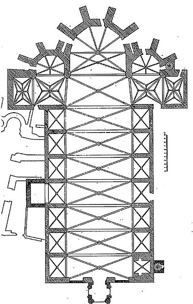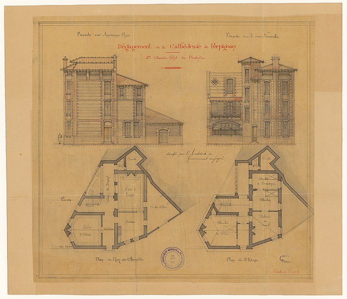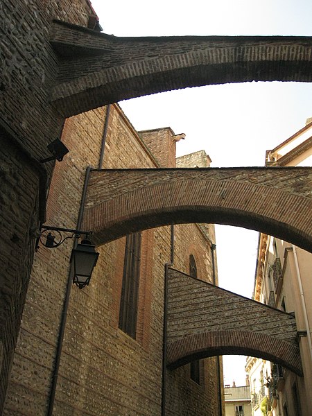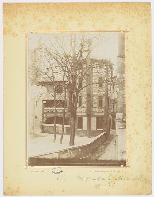 Les matériaux reposent sur l'emploi de petites pierres : le calcaire de Baixas sert pour les points d'appui et les nervures des voûtes, les galets de la Têt sont maçonnés au mortier de chaux et, par endroit, au ciment romain, tandis que la brique est massivement utilisée pour les murs porteurs, les voûtes, les murettes de toiture et les ébrasements des baies. De petits chéneaux en poterie vernissée verte et des décors en grès rouge complètent l'architecture, le calcaire de Baixas étant peu propice à la sculpture ; les remplages en mortier de ciment moulé, établis sur une armature de fer, datent de la fin du XVe siècle.