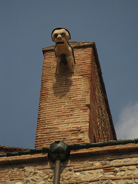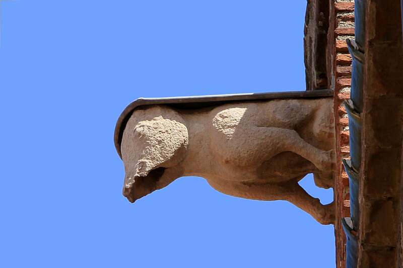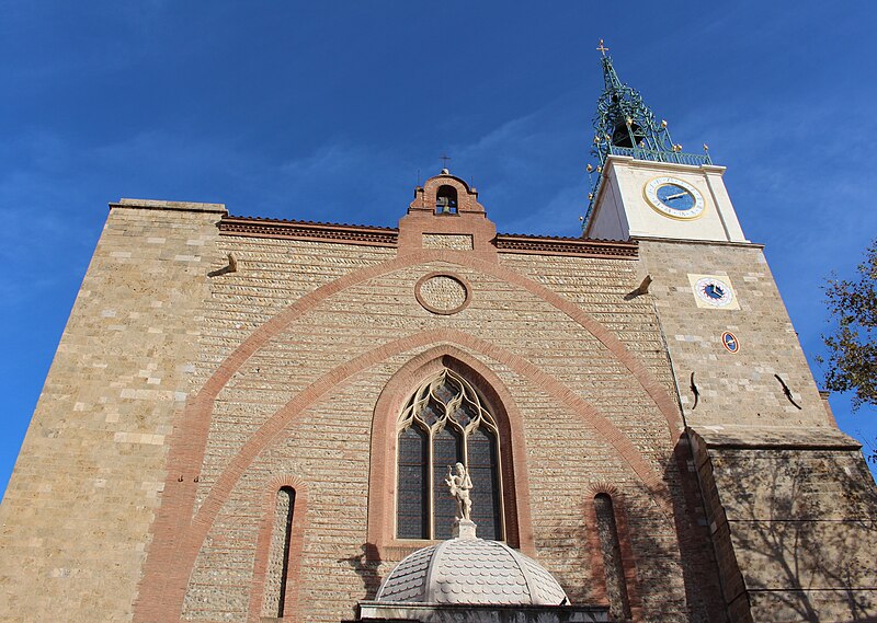 La façade occidentale montre l'alliance caractéristique du Roussillon entre brique, galets de rivière et pierre de taille : les galets piégés dans du mortier sont rythmiques et complétés par quatre arcs de décharge en brique encadrés par deux angles en pierre de taille servant de contreforts ; l'angle droit porte une horloge et un campanile construits en 1743 et la façade est surmontée d'un petit clocheton. Un porche en marbre blanc a été élevé au XVIIe siècle et des aménagements successifs aux XIXe et XXe siècles ont modifié l'ouverture principale pour y insérer une fenêtre de style gothique.