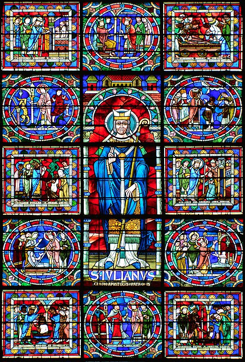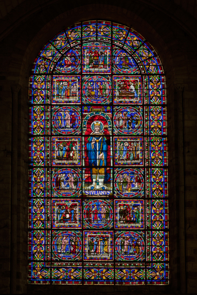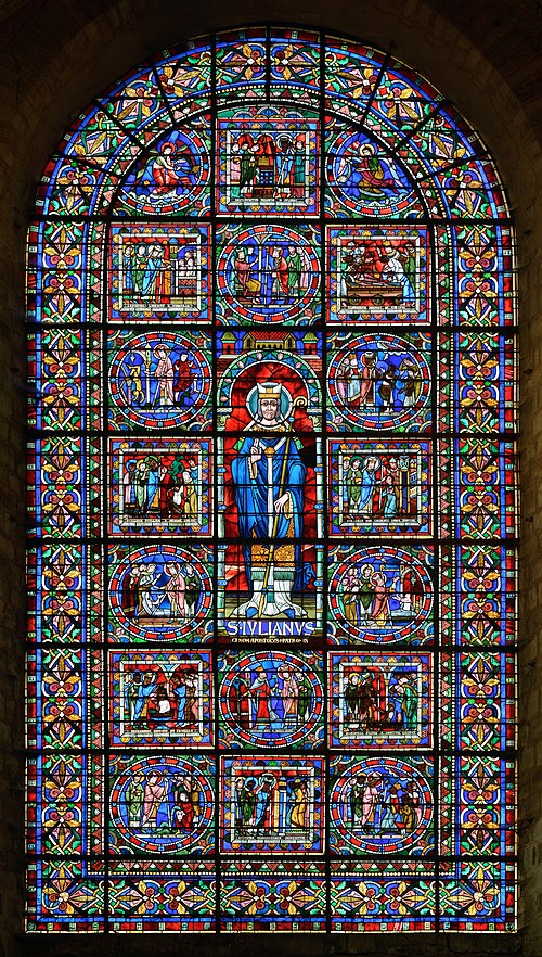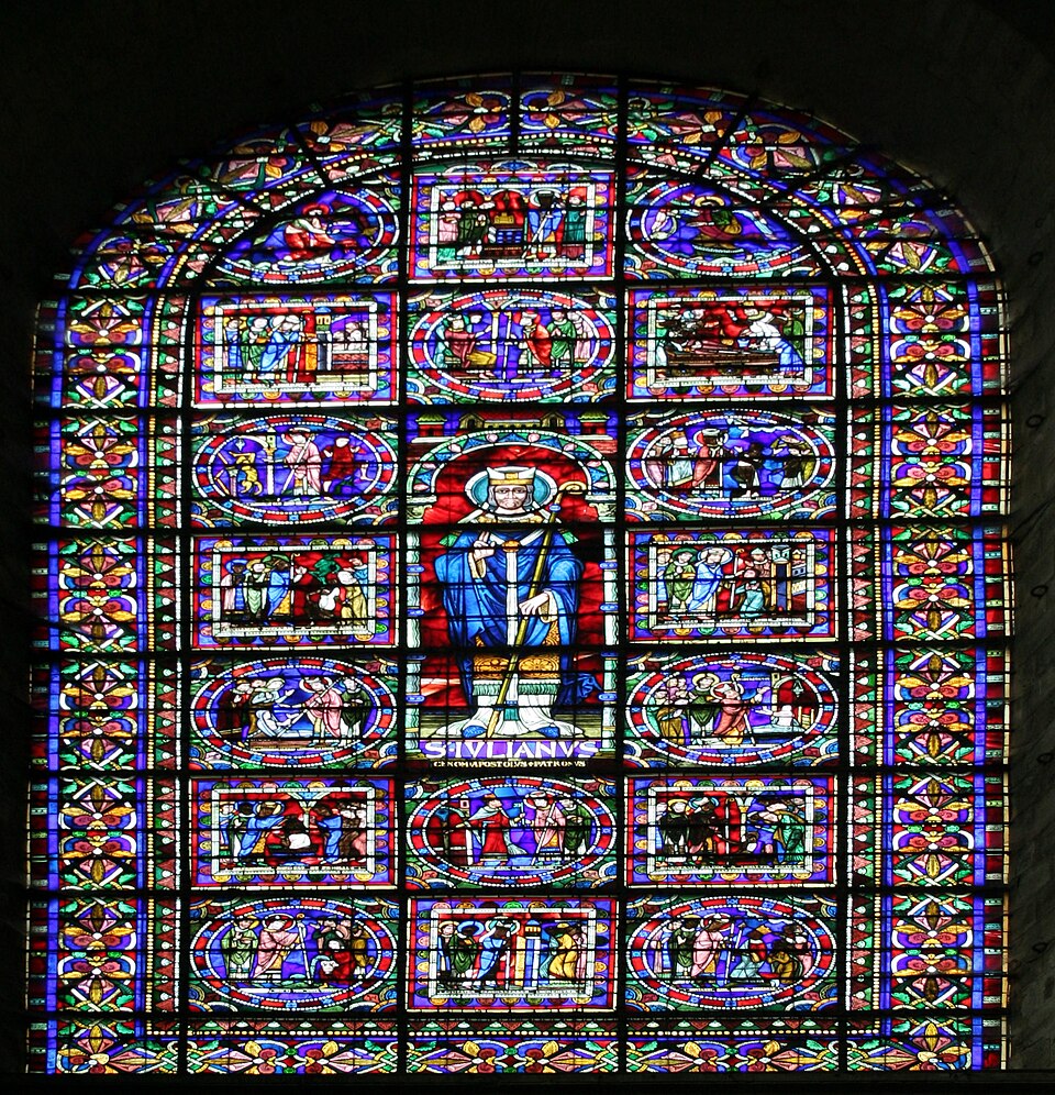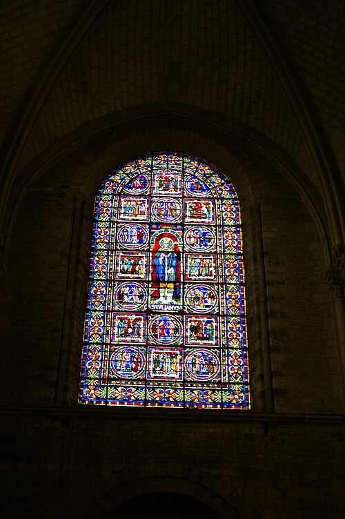 Architecturalement, la cathédrale associe la nef romane et le chœur et transept gothiques, tandis que ses vitraux constituent l’un des éléments les plus remarquables de cette jonction de styles. La nef conserve une vingtaine de verrières romanes, parmi les plus anciennes d’Europe, dont le vitrail de l’Ascension daté vers 1120, tandis que les verrières gothiques, surtout des XIIIe et XIVe siècles, ornent principalement le chœur et la chapelle de la Vierge. Entre 1230 et 1270, plusieurs vitraux furent financés par des corporations de métiers et figurent parfois leurs activités ; la grande rose du transept nord, création du XVe siècle, illustre le Credo.