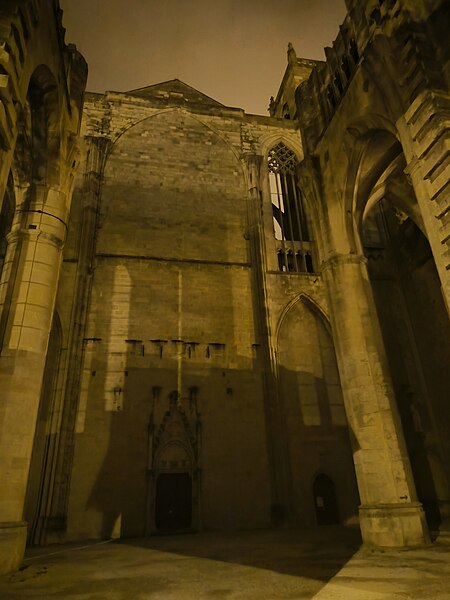 La cathédrale devait adopter la forme d'une croix latine, mais seul le chœur est terminé et le transept et la nef sont à peine amorcés. Plusieurs causes expliquent cet inachèvement : des ressources financières insuffisantes, l'hostilité déterminante des consuls de la ville, la reprise de la guerre de Cent Ans avec le siège de 1355 et les calamités du XIVe siècle (peste, chevauchées) ayant entraîné priorités défensives et réparations des murailles. Le projet butait sur la nécessité d'ouvrir une brèche dans l'ancien rempart, propriété que revendiquaient les consuls, ce qui provoqua un long conflit juridique. Une étude publiée en 1925 par l'abbé Sigal retrace en détail la lutte entre le chapitre et le consulat, commencée en 1345 et aboutissant à un accord en 1361 autorisant la construction du cloître mais laissant la cathédrale inachevée.