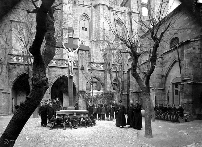 Le site a connu une basilique constantinienne édifiée peu après l'édit de 313, détruite par un incendie en 441, puis une basilique latine achevée le 29 novembre 445 par l'évêque Rustique. Une peinture d'inspiration orientale représentant un Christ imberbe, de tradition hellénistique, semble avoir existé dans l'église primitive avant de disparaître au VIe siècle, épisode évoqué par Grégoire de Tours. Des vestiges musulmans retrouvés dans l'atrium suggèrent l'implantation d'une mosquée durant la présence sarrasine entre 719 et 759. Vers 782, l'église est consacrée aux jeunes martyrs Just et Pasteur ; des éléments réemployés, comme deux colonnes romaines et un linteau dédicacé, témoignent des différentes étapes de réoccupation du lieu.