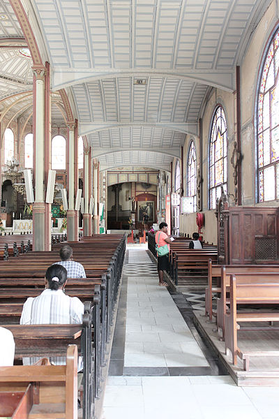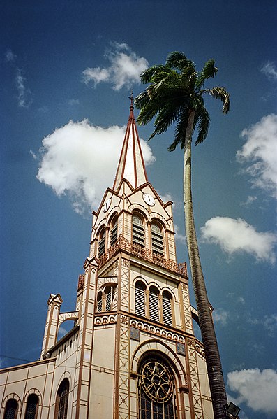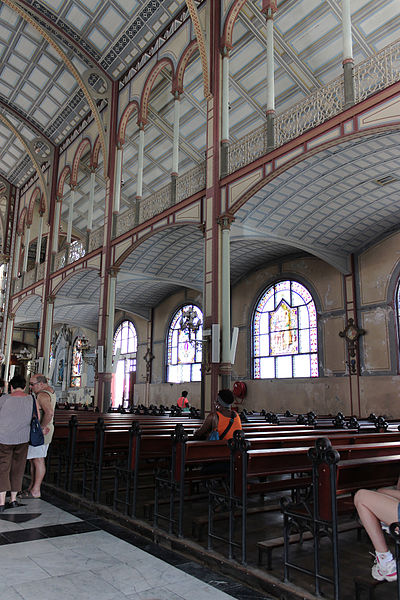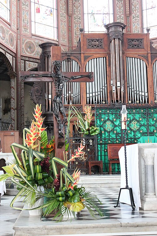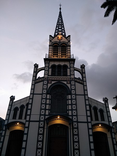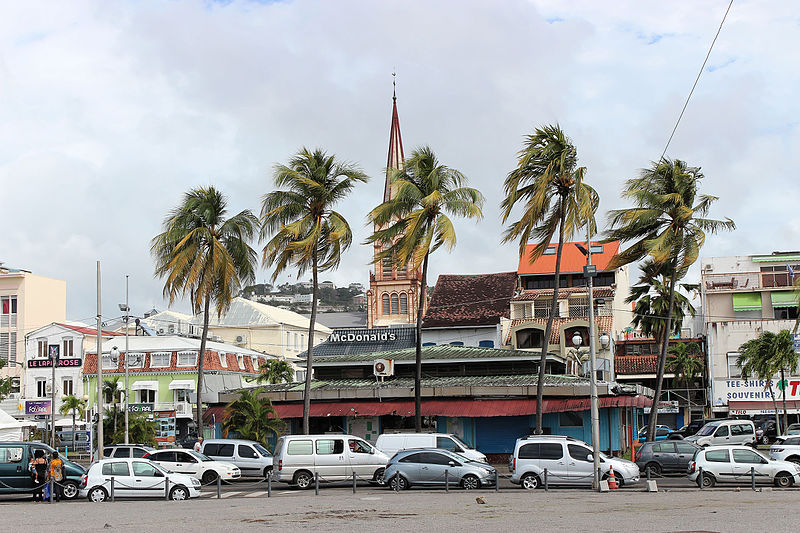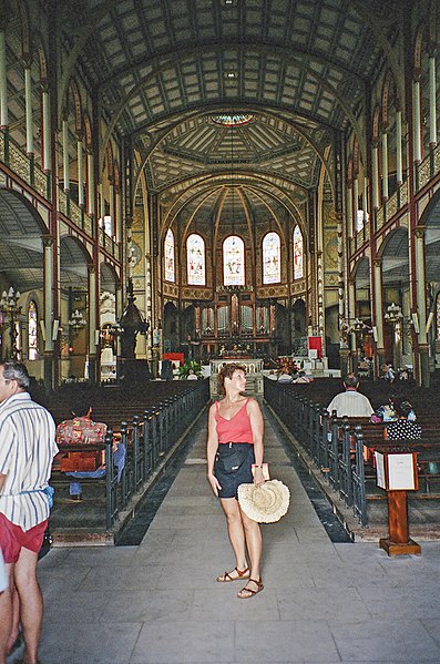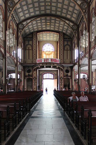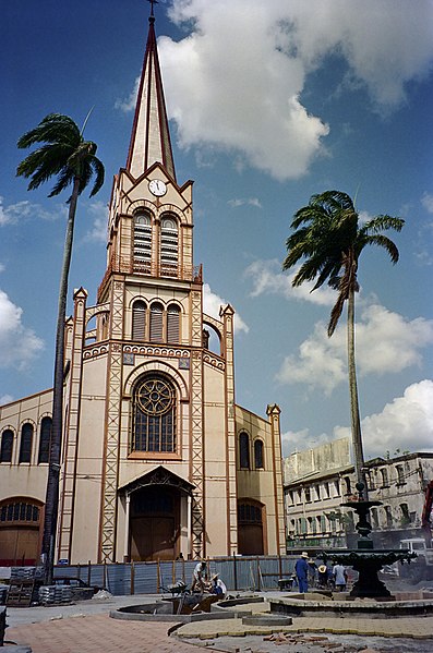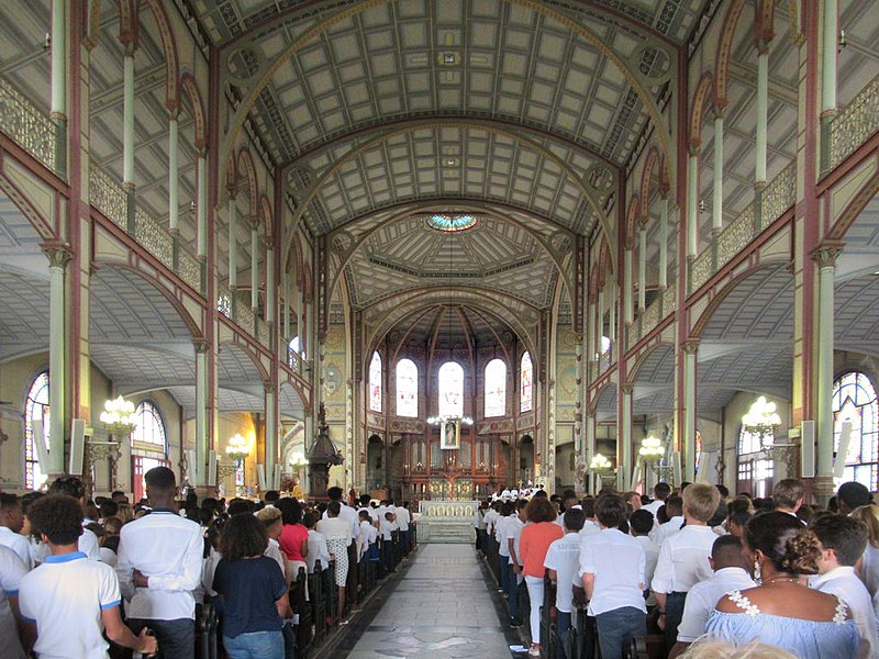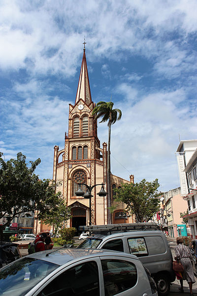 La cathédrale Saint-Louis de Fort-de-France, placée sous le patronage de saint Louis, est le siège de l'archidiocèse de Saint-Pierre et Fort-de-France et se situe à Fort-de-France, en Martinique. La présence d'un lieu de culte à Fort-Royal est mentionnée dès 1671, d'abord sous la forme d'un simple abri de paille. Après l'incendie causé par les Hollandais en 1674, le gouverneur Charles de Courbon-Blénac fit édifier une construction en dur entre 1678 et 1685, décrite par le Père Labat comme mesurant 130 pieds de long sur 30 de large et comportant deux chapelles. Ce bâtiment fut réparé en 1703, agrandi et doté de murs épais couverts de tuiles, puis légèrement endommagé par un raz-de-marée en 1766. En 1829 une tribune et de nouveaux bancs furent installés; des maisons proches du porche furent démolies en 1836 pour réduire les risques d'incendie, mais c'est le tremblement de terre de 1839 qui détériorera fortement l'édifice et entraînera sa fermeture au culte, les offices étant alors tenus dans la grande salle de l'hospice civil. Sur les bases de l'ancien édifice, un nouvel édifice conçu par l'architecte César Jolly vit sa première pierre posée en 1845 et fut inauguré comme cathédrale en 1854, devenant la plus vaste et la plus richement dotée de la colonie. Son toit en zinc fut remplacé par des tuiles en 1861; l'incendie du 22 juin 1890 détruisit la cathédrale et un toit provisoire permit un retour temporaire au culte avant que le cyclone de 1891 n'emporte à nouveau la couverture, obligeant les fidèles à se réunir dans un hangar sur la place de la Savane. L'édifice actuel a été élevé par l'architecte parisien Pierre-Henri Picq à partir de 1891 sur l'emplacement de la précédente cathédrale détruite par le cyclone. De style néogothique à l'extérieur et romano-byzantin à l'intérieur, il combine éléments gothiques et arcs en plein cintre avec une coupole octogonale; il mesure 66 mètres de long sur 24 mètres de large et repose sur une ossature entièrement métallique conçue pour résister aux séismes. Les pièces métalliques (poutrelles, chapiteaux, arcs) furent fabriquées par la société Moisant-Laurent-Savey en métropole, expédiées en Martinique et montées sur les fondations de l'ancienne cathédrale. La nouvelle cathédrale fut inaugurée le 2 juillet 1895 par Mgr Carméné. Le tremblement de terre de 1953 fragilisa la flèche, qui dut être démontée en 1971 avec une partie du clocher pour prévenir tout risque de chute. Propriétaire du bâtiment, la municipalité lança en 1976 une restauration confiée à l'ingénieur François Lubin; le clocher de 58,8 mètres fut alors renforcé et rehaussé pour recevoir une nouvelle flèche de 25 mètres recouverte de trois mille écailles d'aluminium de couleur bronze, et la cathédrale rénovée rouvrit ses portes le 15 décembre 1979 lors d'une messe célébrée par Mgr Maurice Marie‑Sainte. Classée au titre des monuments historiques le 9 octobre 1990, la cathédrale fait l'objet de travaux de restauration depuis cette date. Le bas-côté droit a été restauré à partir de 2002, le bas-côté gauche à partir de 2006, puis la restauration de la nef et du transept a débuté en octobre 2009. Après un arrêt des travaux, une nouvelle tranche de restauration a repris en 2015 pour le massif occidental, comprenant la dépose puis la repose de la flèche sous la direction d'Étienne Poncelet; la flèche a été déposée en octobre 2015 et la nouvelle posée en mars 2016. L'intérieur comprend une grande nef et deux berceaux collatéraux; la nef compte quatre travées soutenues par des piliers à colonnettes métalliques qui portent des arceaux métalliques, tandis que les bas-côtés, assez larges, sont surmontés de vastes tribunes aux garde-corps en fer forgé. La croisée du transept est couverte par une coupole octogonale aplatie laissant entrer la lumière à sa base. Le décor floral qui orne de nombreux espaces intérieurs est protégé par le classement aux monuments historiques du 9 octobre 1990. Parmi le mobilier ancien se trouvent une chaire à prêcher en bois sculptée de la fin du XIXe siècle, classée à l'inventaire des monuments historiques en 1995, des grilles en fer forgé aux armes de Saint-Louis entourant le chœur, des bancs en bois et une partie de l'autel de marbre. Dix-neuf vitraux, œuvre du peintre-verrier Néret et datant de la fin du XIXe siècle, représentent personnages et épisodes religieux; cinq d'entre eux, dans l'abside, sont consacrés à la vie de saint Louis, tandis que sept autres portent symboles religieux ou armoiries et devises d'évêques tels que Mgr Le Herpeur, Porchez, Fava et Carméné, et sont bordés d'éléments de flore tropicale ou d'attributs religieux.