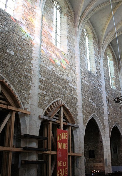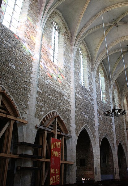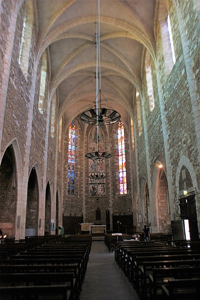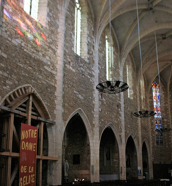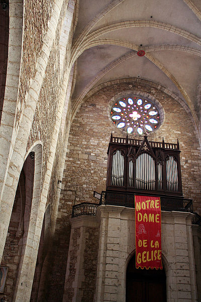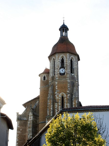 L'église Saint-Luperc, ancienne cathédrale d'Eauze dans le Gers, constitue un exemple significatif du gothique méridional. Elusa, ancien nom de la cité, fut siège métropolitain de la Novempopulanie et envoya un évêque au concile d'Arles en 314. Après les invasions et destructions du haut Moyen Âge, le titre métropolitain fut transféré à l'évêque d'Auch et le diocèse d'Eauze disparut au IXe siècle ; en 1865 l'archevêque d'Auch lui a redonné le titre de cathédrale. La construction de l'édifice actuel débute en 1464 à l'initiative du prieur Jean Marre et s'achève vers 1500, même si d'autres sources indiquent des fourchettes voisines. L'église adopte un plan languedocien : une nef unique à sept travées, bordée de chapelles basses, se termine par un chœur à abside à pans coupés de même hauteur et de même largeur que la nef. La nef, relativement étroite (10,70 m) par rapport à sa hauteur (21,65 m), pourrait s'expliquer par la construction sur l'emplacement d'une église antérieure à trois nefs. Treize chapelles sont aménagées entre les contreforts et les clés de voûte présentent des figures sculptées et peintes. De chaque côté du chœur se trouvent des vitraux dont certains fragments sont datés autour de 1520 et pourraient être attribués à Arnaud de Moles ou à Laurens d'Agen, tandis que des verrières modernes ont été remaniées par le maître-verrier Jean-Baptiste Anglade. La grande porte d'entrée comporte une baie à arc surbaissé et plusieurs archivoltes d'arcs brisés concentriques, dont l'une est sculptée en forme de cep de vigne ornée de contrecourbes, crochets et fleurons, le tout encadré par des pinacles finement travaillés. Au revers de la porte s'ouvre un petit porche en tambour, vraisemblablement établi au début du XIXe siècle. Le clocher est une tour carrée à sa base, devenue octogonale en partie haute ; le comble à l'impériale couronné d'un clocheton remonte au début du XVIIIe siècle. L'édifice a subi des destructions pendant les guerres de religion, principalement en 1569, et les bâtiments du prieuré bénédictin ont été relevés au XVIIIe siècle, le cloître étant ensuite intégré aux constructions du collège. Une importante campagne de restauration a eu lieu entre 1860 et 1878, avec notamment la réfection de l'enduit intérieur, une modification de la toiture et une reprise substantielle des vitraux par Anglade. En 1972, l'enlèvement de l'enduit intérieur a mis au jour les tonalités chaudes des pierres et des briques ainsi que le réemploi massif de moellons provenant des ruines de la cité antique d'Elusa. Les vestiges et les découvertes épigraphiques attestent une longue occupation romaine : une stèle dédiée à saint Luperc, découverte en 1880, et d'autres inscriptions témoignent d'une présence coloniale dès les Ier–IIe siècles et d'un culte local au Ve siècle. La christianisation a souvent réutilisé sites et matériaux des cultes antiques, qui à Eauze incluaient des cultes orientaux et solaires attestés par le musée archéologique. La vie institutionnelle médiévale comprend la fondation d'un monastère bénédictin sur la colline après l'an 960, initialement dédié à Gervais et Protais, puis consacré à saint Luperc au XIe siècle lors du transfert des reliques ; ce prieuré fut rattaché à l'abbaye de Cluny en 1088 et subsista jusqu'à la Révolution. Au centre de l'abside sont peintes neuf vignettes : huit illustrent des scènes de la vie de Jésus et la neuvième représente le Christ pantocrator, tandis que les verrières latérales figurent des prophètes, des apôtres et des saints. Le mobilier comprend plusieurs tableaux, statues et fonts baptismaux référencés dans la base Palissy. L'église est inscrite à l'inventaire des monuments historiques depuis 1945.
