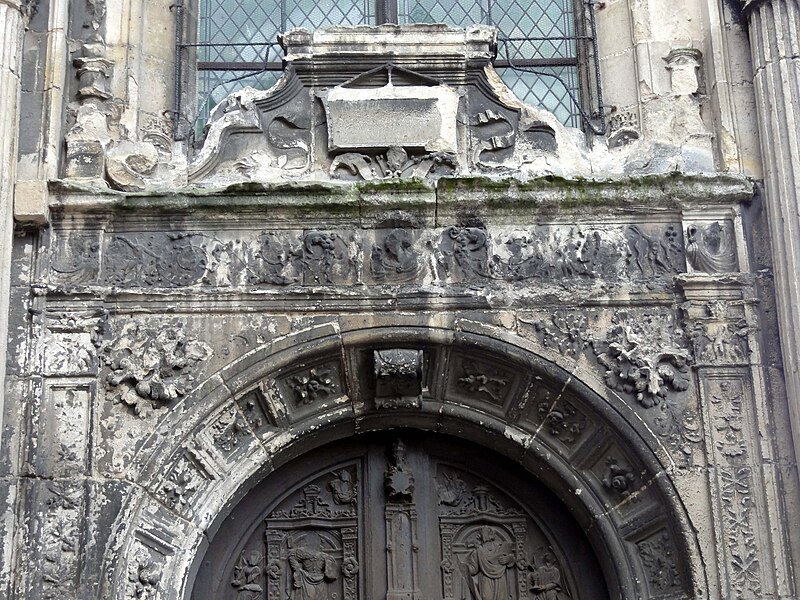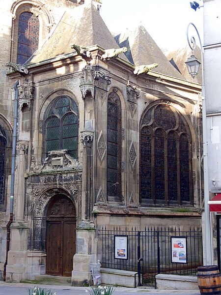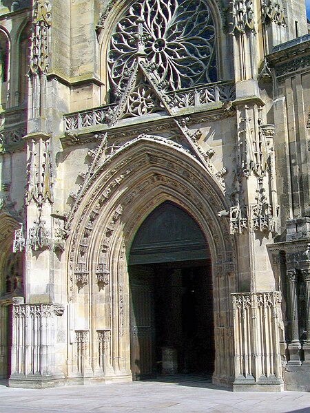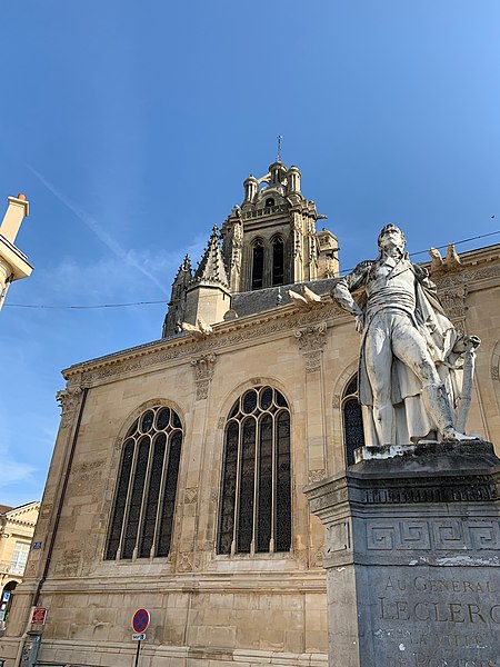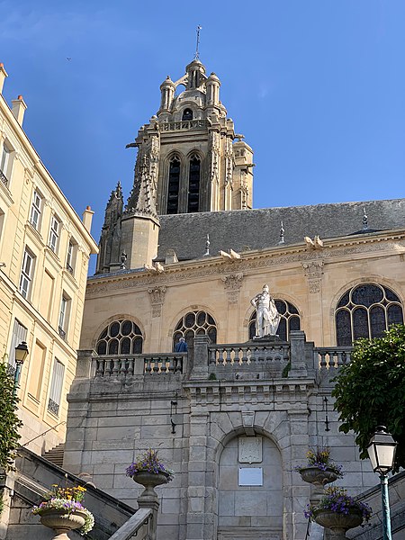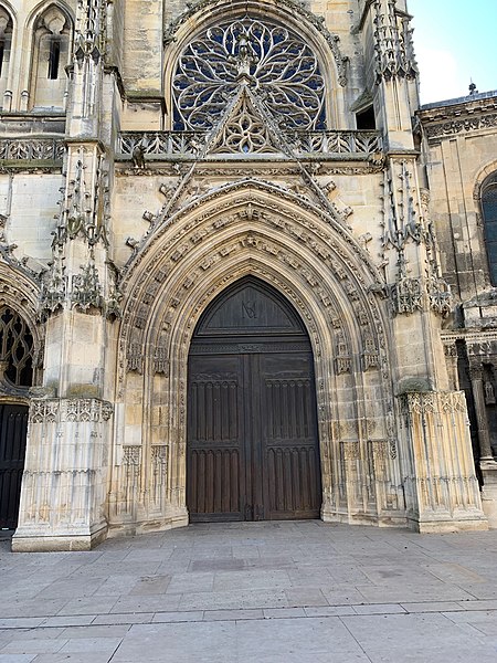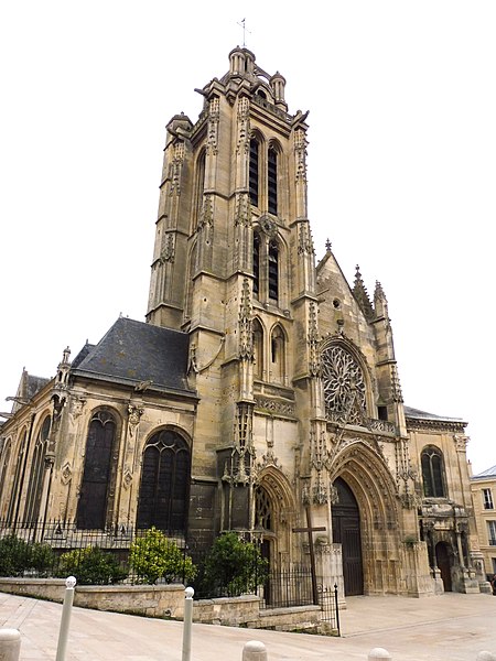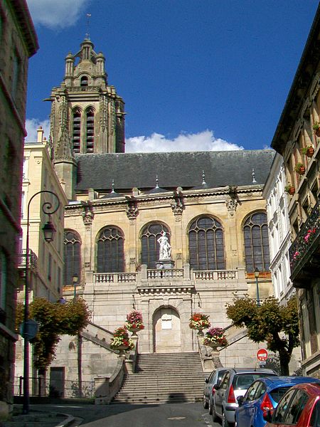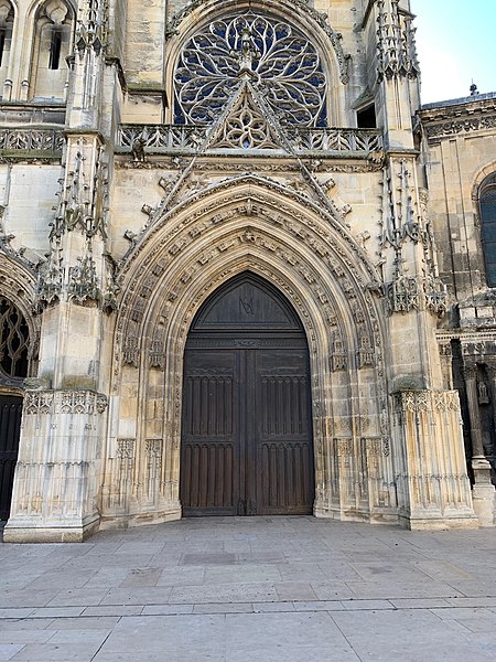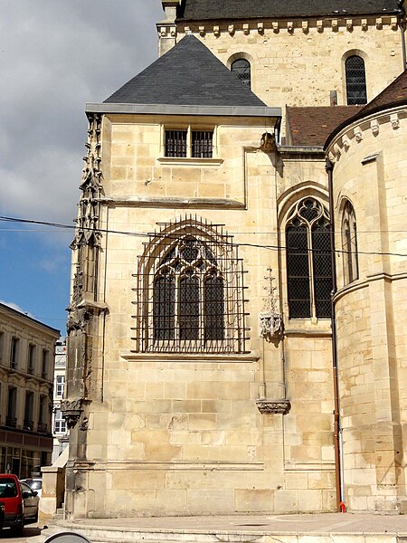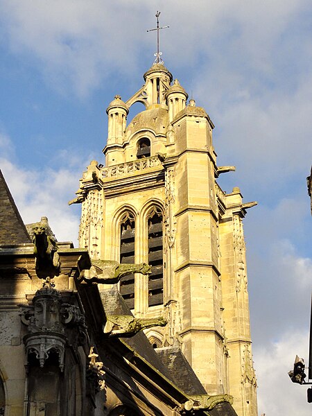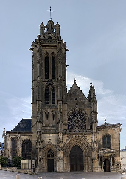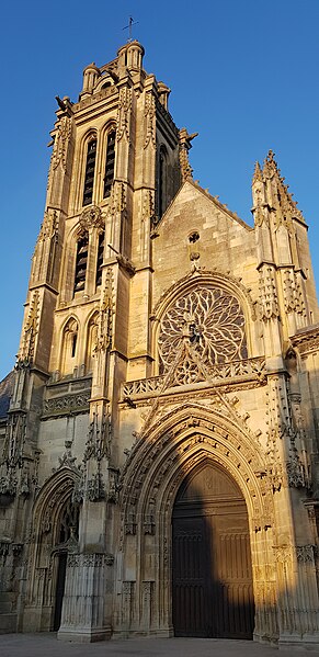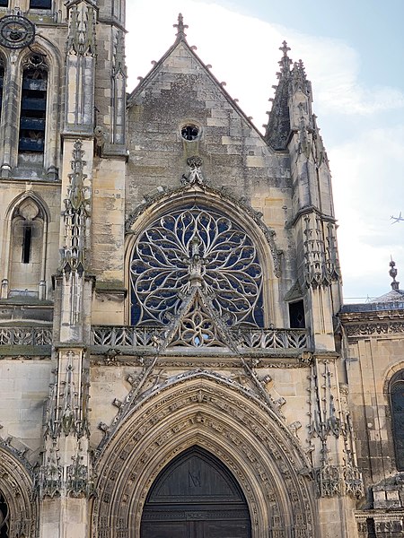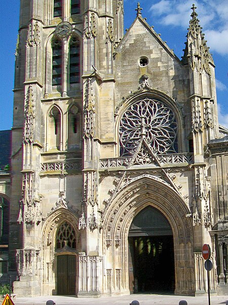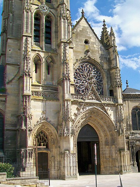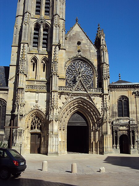 La façade occidentale, dissymétrique, assemble des éléments des XVe et XVIe siècles autour d'une grande rosace reconstituée au XIXe siècle et d'un portail flamboyant richement mouluré dont les statuettes furent mutilées à la Révolution ; le clocher occidental, élevé en plusieurs étages et coiffé d'un dôme octogonal de style Renaissance, culmine à 45 m et accueille aujourd'hui trois cloches, dont le bourdon Louise (1735) et la cloche Henry (1554) qui sert à marquer les heures, la cloche Eloy (1543) étant hors d'usage. Les élévations latérales montrent un vocabulaire essentiellement Renaissance sur les chapelles nord et sud, tandis que l'abside et la plupart des fenêtres orientales conservent l'apparence qu'elles avaient à la fin du Moyen Âge, excepté la sacristie aménagée vers 1477.