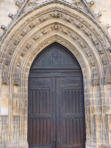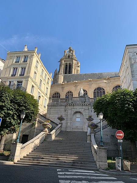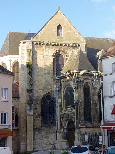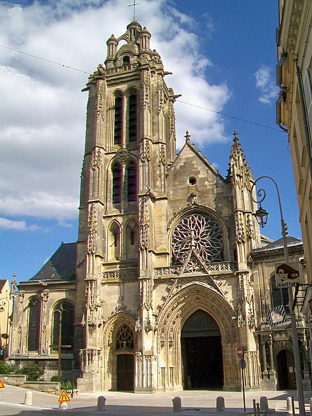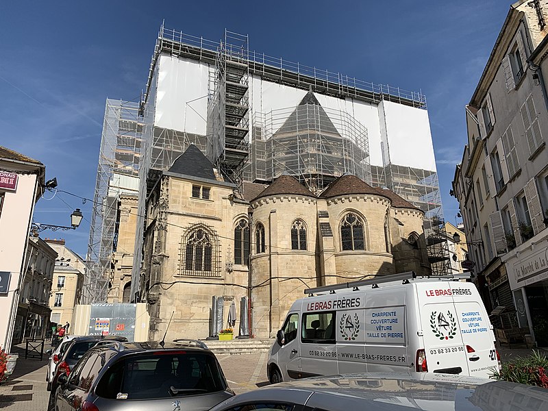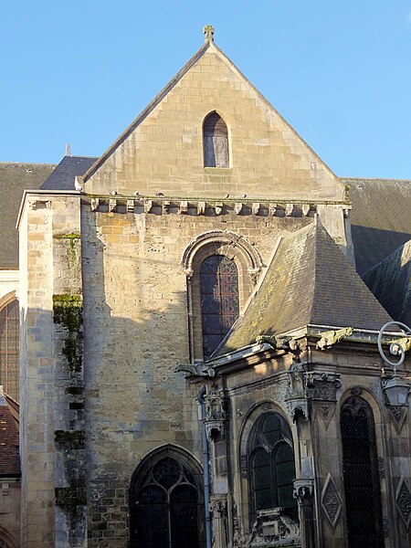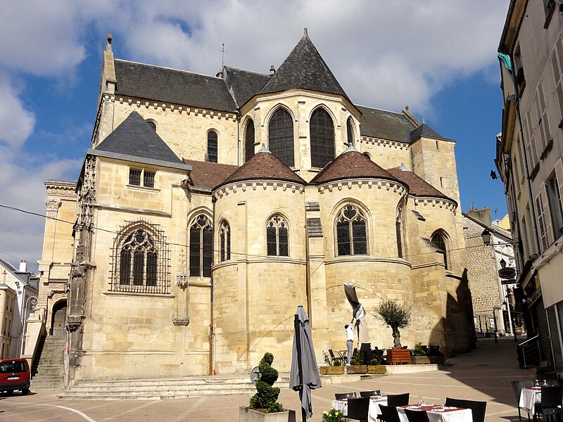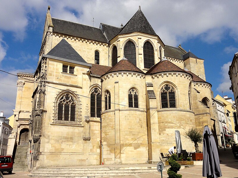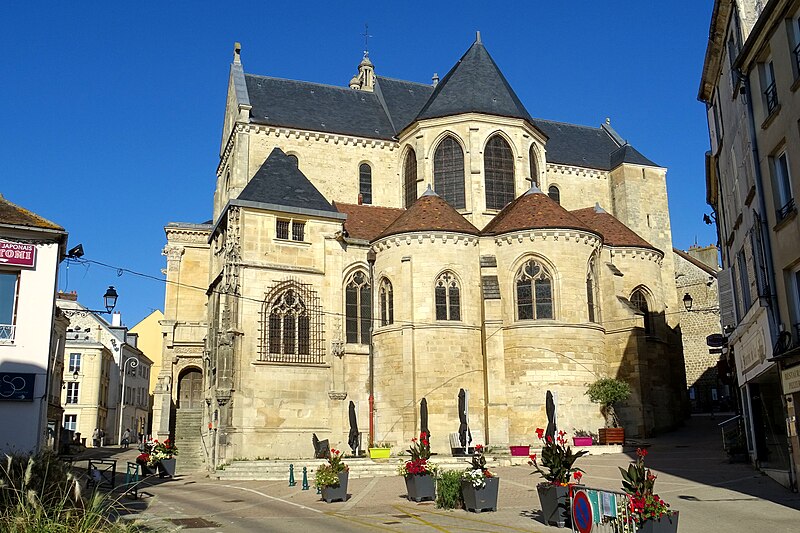 La cathédrale Saint‑Maclou de Pontoise, située dans le Val‑d'Oise en Île‑de‑France, est l'église catholique qui sert de siège au diocèse de Pontoise ; elle a été élevée à la dignité de cathédrale par le pape Paul VI en 1966 et est classée monument historique depuis 1840. L'édifice, implanté dans la haute ville de Pontoise, présente ses façades sur la place du Petit‑Martroy, la rue de la Coutellerie, la rue Thiers, la rue de l'Hôtel‑de‑Ville et la place du Grand‑Martroy ; il comporte des portails secondaires accessibles par des escaliers flanquants du chevet. Construite à l'origine comme église paroissiale au milieu du XIIe siècle, elle est attestée par la présence d'un curé nommé Robert en 1165 et par l'existence d'une paroisse attestée en 1213, dotée d'une double cure jusqu'en 1736. L'église primitive, d'un plan cruciforme, comprenait une nef de cinq travées, deux bas‑côtés, un transept saillant, un clocher central et un chœur en hémicycle entouré d'un déambulatoire à cinq chapelles rayonnantes ; certains éléments de cette période subsistent, notamment le chœur, le déambulatoire et des portions des croisillons. Le clocher central fut renversé par un ouragan le 30 octobre 1309, provoquant l'effondrement d'une partie de la nef ; la réparation de la nef, financée par les bouchers de la ville, s'acheva en 1325. À partir du milieu du XIVe siècle et surtout au XVIe siècle, l'église fut agrandie et remaniée : adjonction de travées occidentales, élévation d'une nouvelle façade, construction d'un clocher occidental et transformation du bas‑côté nord en double collatéral flanqué de chapelles, opérations qui expliquent la coexistence d'éléments romans et de voûtes plus récentes. Des campagnes de chantier importantes se déroulèrent au cours du XVIe siècle — construction d'un portail nord achevé en 1540, édification de la chapelle de la Passion datée de 1545, interventions de maîtres‑maçons attestées en 1541, et reconstructions de voûtes et d'éléments décoratifs dans le style renaissant jusqu'à la fin du siècle. Aux XVIIe et XVIIIe siècles, des modifications d'aménagement et des restaurations partielles se succédèrent, tandis que la Révolution entraîna la destruction de statues, la fonte de cloches et la transformation provisoire de l'église en Temple de la Raison puis en halle aux grains. Le XIXe siècle vit des travaux de sauvegarde et de restauration sous la direction d'architectes comme Henri Blondel et Alphonse Simil : la chapelle de la Passion et celle de la Vierge furent restaurées, la rosace de la façade reconstituée et le chevet dégagé des constructions accolées au début du XXe siècle. Plus récemment, la toiture et certaines voûtes ont fait l'objet d'une restauration entre octobre 2018 et début 2021, financée par la ville de Pontoise, et des restaurations intérieures sont encore prévues.