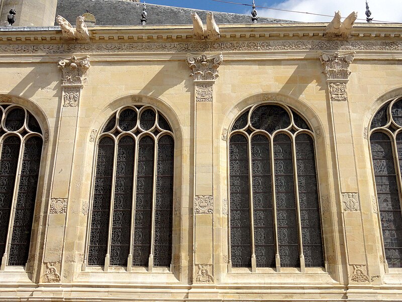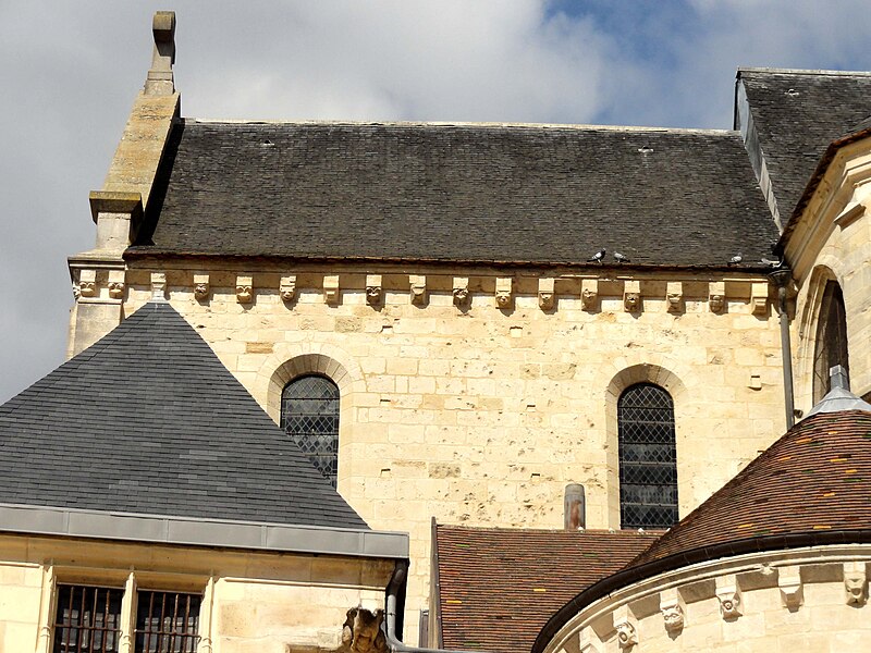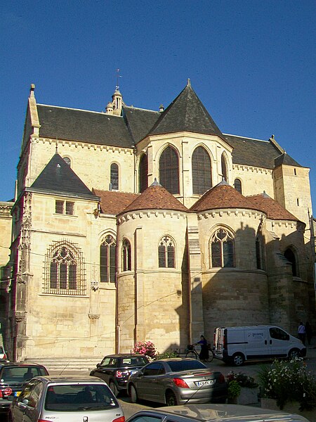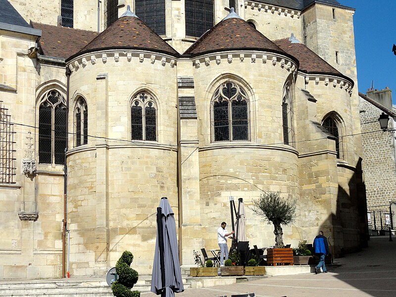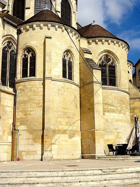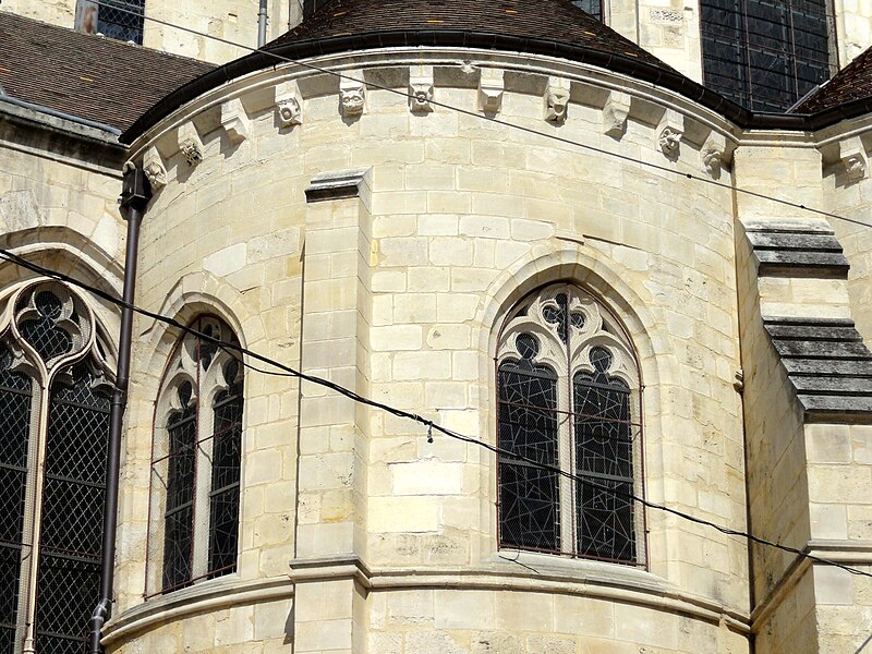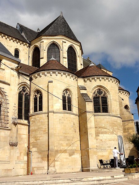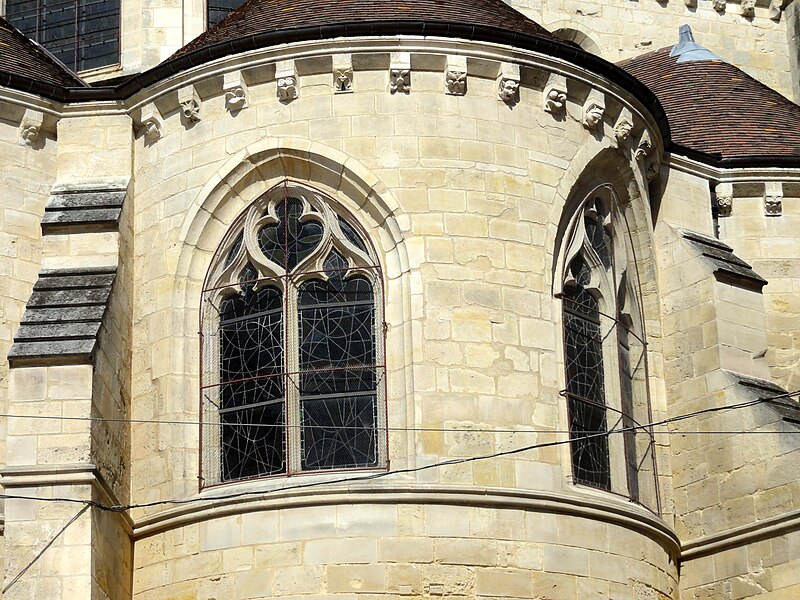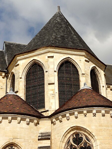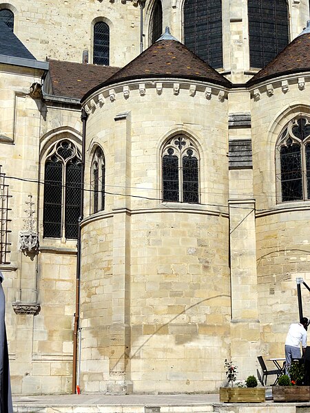 Le chœur en hémicycle conserve une voûte à six nervures et cinq grandes fenêtres en tiers‑point percées à la fin du XVe siècle ; quatre colonnes isolées du milieu du XIIe siècle séparent le sanctuaire du déambulatoire, dont les chapiteaux conservent des motifs romans tels que harpies, dragons, entrelacs et feuilles d'acanthe. Le déambulatoire, proche par son organisation de celui de la basilique de Saint‑Denis, se distingue par l'absence d'arcs séparant les chapelles et par l'emploi d'une nervure centrale qui permet l'ouverture des travées.