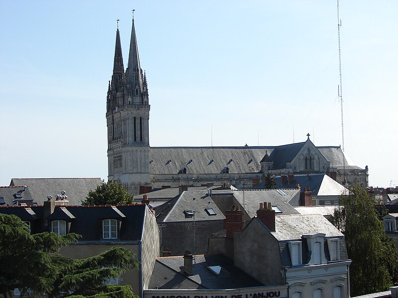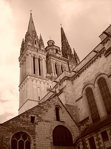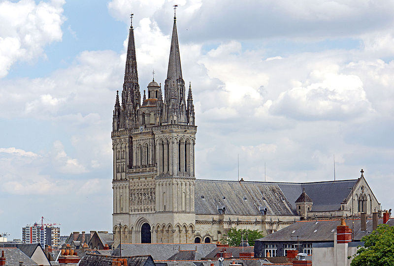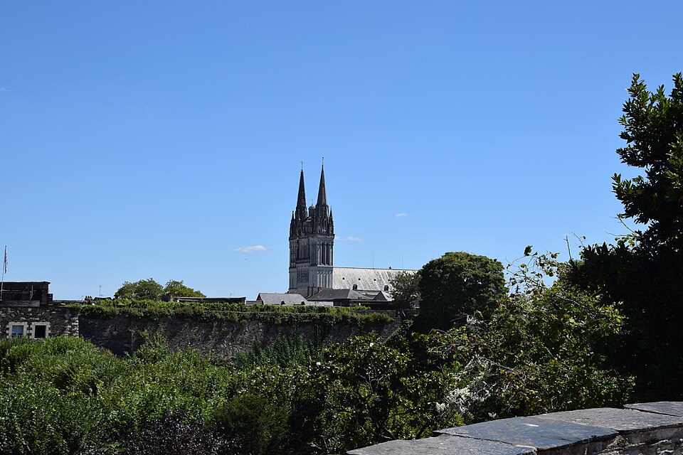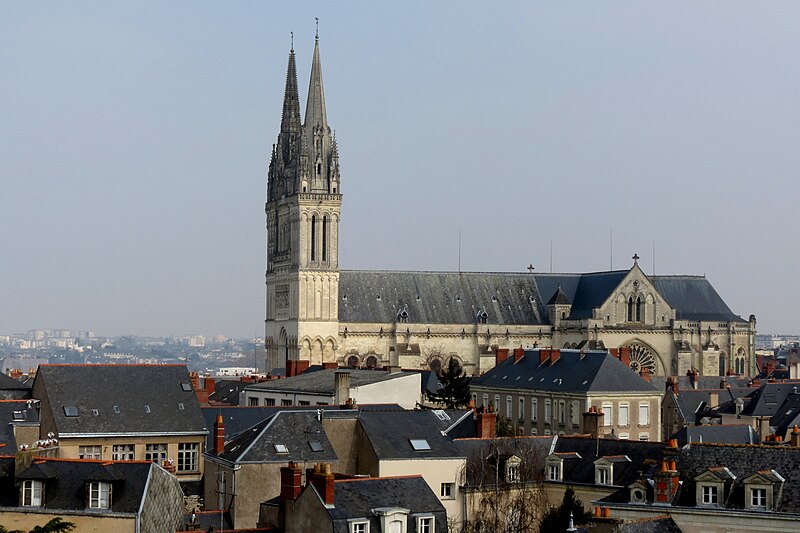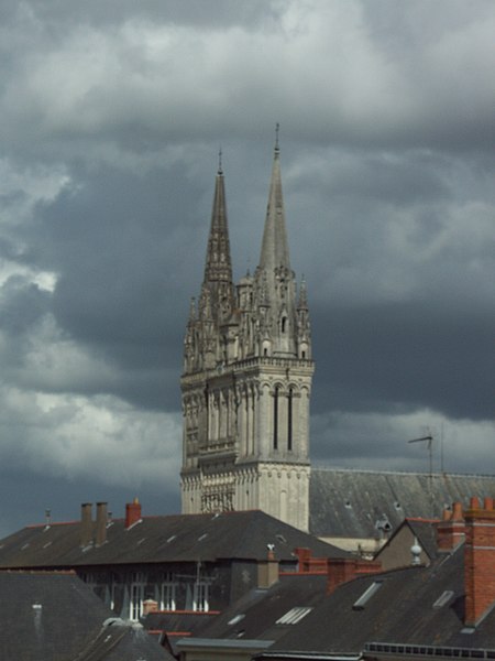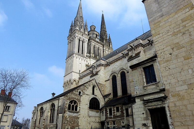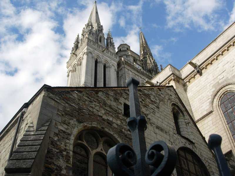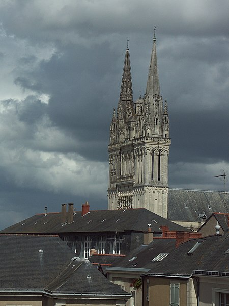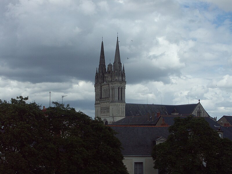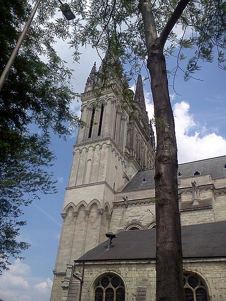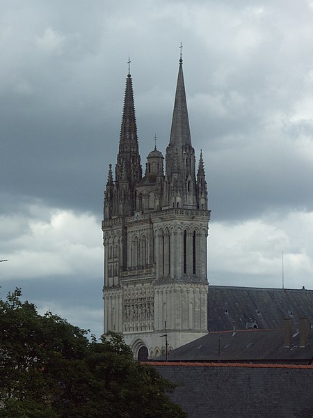 La cathédrale Saint-Maurice d'Angers, siège du diocèse d'Angers, illustre la transition entre les styles roman et gothique et constitue un témoignage majeur du gothique angevin. Mentionnée pour la première fois en 470 lors d'un incendie attribué aux Francs, elle est primitivement dédiée à saint Maurice, avec des patronymes liés à la Vierge au IXe siècle et à saint Maurille au Xe siècle. Une église reconstruite et dédiée en 1025 par l'évêque Hubert de Vendôme a laissé la partie inférieure des murs de la nef. L'édifice actuel, principalement des XIIe et XIIIe siècles, résulte de plusieurs campagnes de construction : la nef a été édifiée entre 1140 et 1160 sous les évêques Ulger et Normand de Doué, la façade entre 1170 et 1180, précédée vers 1200 d'un porche d'entrée. La croisée, la travée droite du chœur et le bras sud du transept datent du premier tiers du XIIIe siècle sous Guillaume de Beaumont, tandis que le bras nord du transept est achevé à partir de 1236 ; les travées d'absides sont réalisées entre 1239 et 1255 sous Michel de Villoiseau et la sacristie au cours du deuxième quart du XIIIe siècle. La chapelle Saint-Jean est élevée entre 1386 et 1390 ; le cloître est construit entre 1437 et 1458 par le maître-maçon Bonju, l'étage de la bibliothèque sur l'aile orientale étant achevé en 1467, et la chapelle Sainte-Anne est élevée entre 1466 et 1469. Les flèches latérales sont reconstruites entre 1519 et 1525, la flèche nord par Mathurin Georges, et le clocher central réédifié entre 1534 et 1540 par l'architecte Jean Delespine. Un calvaire extérieur est érigé en 1751 et une crypte pour le caveau des chanoines est creusée en 1763 par Joseph Desnoyers. La paroisse Saint-Maurice est signalée en 1040 ; sa chapelle dite du Crucifix est bâtie entre 1190 et 1220, agrandie au XVIe siècle par l'adjonction d'un vaisseau sud par Nicolas Viriot puis partiellement amputée à l'ouest à la fin du XVIIIe siècle. De nombreuses mutilations et restaurations affectent l'édifice aux XVIIIe et XIXe siècles : la chapelle Saint-Jean transformée en logement en 1770, la destruction du porche en 1807, la quasi-destruction du cloître vers 1812 sauf trois arcades et les baies correspondantes de la bibliothèque, la reconstruction des flèches et du clocher central après l'incendie de 1831, une restauration générale surtout des parties hautes entre 1870 et 1914, et des interventions ponctuelles après les bombardements de 1944. La cathédrale est classée au titre des monuments historiques dès la liste de 1862. Les vitraux, du XIIe au XXe siècle, les tapisseries, le trésor et des peintures murales du XIVe et XVe siècle constituent une riche décoration intérieure. Parmi les œuvres remarquables figurent un décor peint du XIIIe siècle dédié à la vie de saint Maurille, une verrière de la vie de saint Julien dans le transept considérée comme un chef-d’œuvre du XIIIe siècle et des rosaces du transept réalisées par André Robin en 1451; certains vitraux ont par ailleurs été rénovés au XXe siècle par Jacques Le Chevallier. Le maître-autel à baldaquin en bois doré date de 1758, la chaire du milieu du XIXe siècle, de style néogothique, illustre des thèmes bibliques et apocalyptiques, et la cathédrale conserve des stalles, des monuments funéraires et des peintures notables dont un retable attribué au Maître du Retable Beaussant. Le grand orgue a fait l'objet de multiples reconstructions depuis le XVe siècle ; la tribune et le buffet actuels datent du XVIIIe siècle et sont classés depuis 1977 ; l'instrument, restitué et électrifié au milieu du XXe siècle, comprend aujourd'hui trois claviers, un pédalier et soixante-cinq jeux, et a été remis en service en 2025. L'édifice présente des dimensions importantes : longueur totale 90,47 mètres, largeur de la façade 23 mètres, hauteur de la voûte de la nef 24,7 mètres, largeur de la nef 16,4 mètres et tours culminant à 75 mètres. Le clocher abrite neuf cloches, dont la plus lourde, « Maurice » fondue par Besson (6 700 kg), est fissurée et ne sonne plus ; les autres portent des noms et notes variés. La cathédrale reste un ensemble architectural et artistique riche, fruit de plusieurs siècles d'extensions, de destructions et de restaurations.