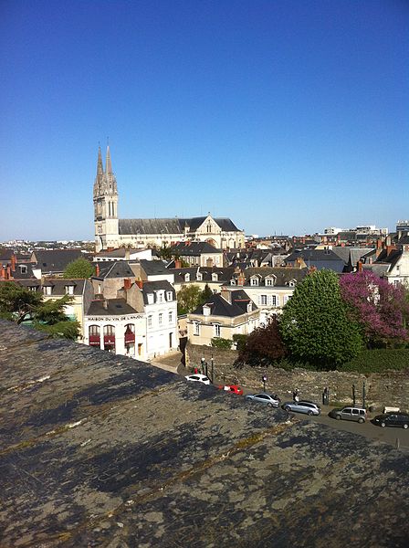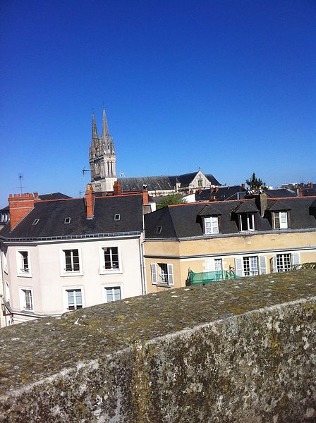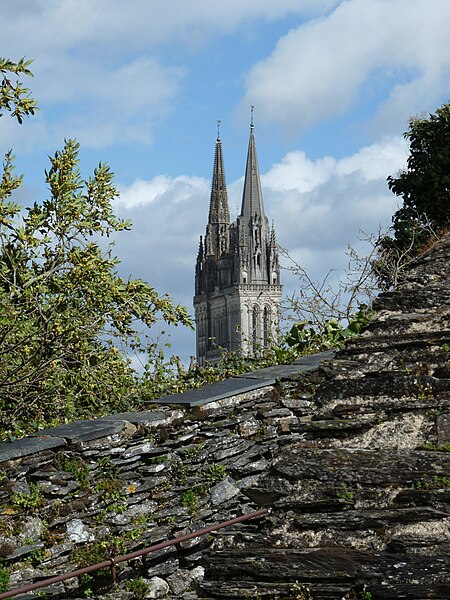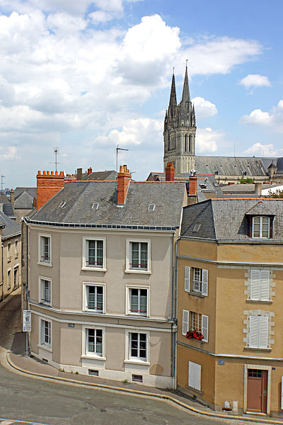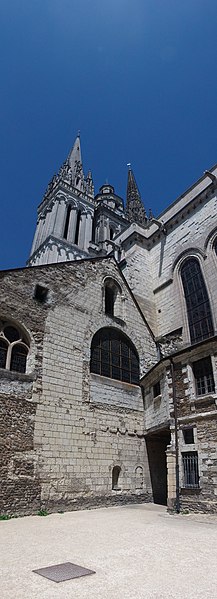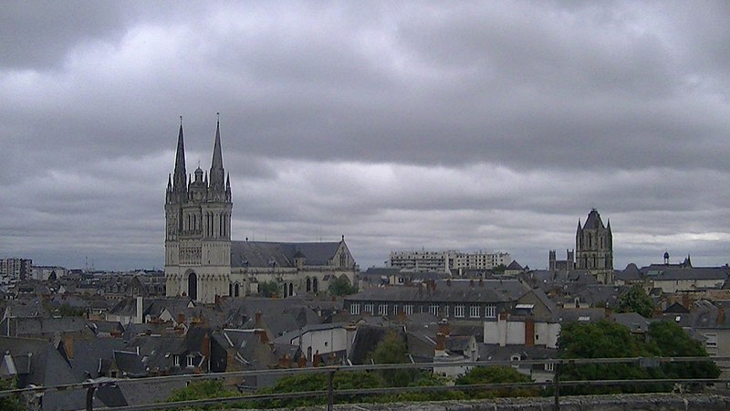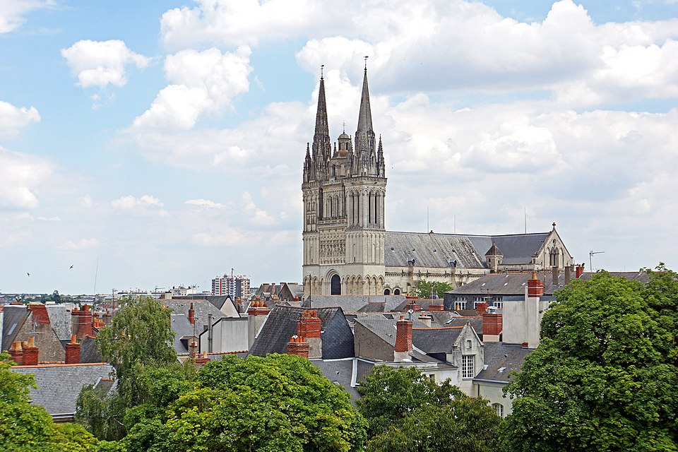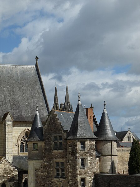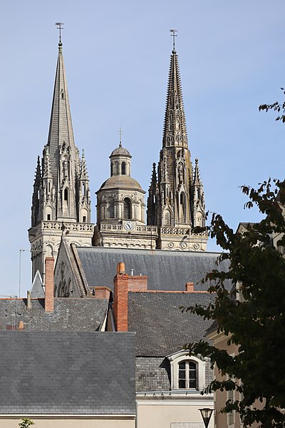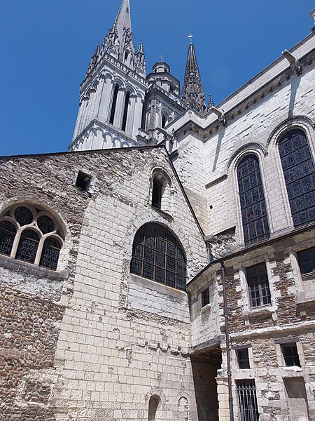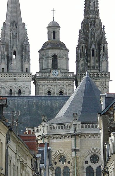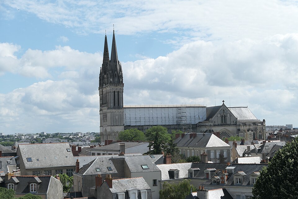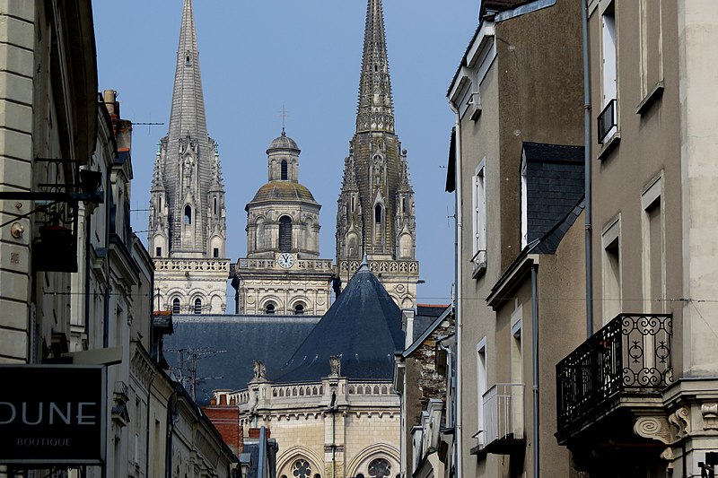 La cathédrale Saint-Maurice d'Angers, siège du diocèse d'Angers, illustre la transition entre les styles roman et gothique et constitue un témoignage majeur du gothique angevin. Mentionnée pour la première fois en 470 lors d'un incendie attribué aux Francs, elle est primitivement dédiée à saint Maurice, avec des patronymes liés à la Vierge au IXe siècle et à saint Maurille au Xe siècle. Une église reconstruite et dédiée en 1025 par l'évêque Hubert de Vendôme a laissé la partie inférieure des murs de la nef. L'édifice actuel, principalement des XIIe et XIIIe siècles, résulte de plusieurs campagnes de construction : la nef a été édifiée entre 1140 et 1160 sous les évêques Ulger et Normand de Doué, la façade entre 1170 et 1180, précédée vers 1200 d'un porche d'entrée. La croisée, la travée droite du chœur et le bras sud du transept datent du premier tiers du XIIIe siècle sous Guillaume de Beaumont, tandis que le bras nord du transept est achevé à partir de 1236 ; les travées d'absides sont réalisées entre 1239 et 1255 sous Michel de Villoiseau et la sacristie au cours du deuxième quart du XIIIe siècle. La chapelle Saint-Jean est élevée entre 1386 et 1390 ; le cloître est construit entre 1437 et 1458 par le maître-maçon Bonju, l'étage de la bibliothèque sur l'aile orientale étant achevé en 1467, et la chapelle Sainte-Anne est élevée entre 1466 et 1469. Les flèches latérales sont reconstruites entre 1519 et 1525, la flèche nord par Mathurin Georges, et le clocher central réédifié entre 1534 et 1540 par l'architecte Jean Delespine. Un calvaire extérieur est érigé en 1751 et une crypte pour le caveau des chanoines est creusée en 1763 par Joseph Desnoyers. La paroisse Saint-Maurice est signalée en 1040 ; sa chapelle dite du Crucifix est bâtie entre 1190 et 1220, agrandie au XVIe siècle par l'adjonction d'un vaisseau sud par Nicolas Viriot puis partiellement amputée à l'ouest à la fin du XVIIIe siècle. De nombreuses mutilations et restaurations affectent l'édifice aux XVIIIe et XIXe siècles : la chapelle Saint-Jean transformée en logement en 1770, la destruction du porche en 1807, la quasi-destruction du cloître vers 1812 sauf trois arcades et les baies correspondantes de la bibliothèque, la reconstruction des flèches et du clocher central après l'incendie de 1831, une restauration générale surtout des parties hautes entre 1870 et 1914, et des interventions ponctuelles après les bombardements de 1944. La cathédrale est classée au titre des monuments historiques dès la liste de 1862. Les vitraux, du XIIe au XXe siècle, les tapisseries, le trésor et des peintures murales du XIVe et XVe siècle constituent une riche décoration intérieure. Parmi les œuvres remarquables figurent un décor peint du XIIIe siècle dédié à la vie de saint Maurille, une verrière de la vie de saint Julien dans le transept considérée comme un chef-d’œuvre du XIIIe siècle et des rosaces du transept réalisées par André Robin en 1451; certains vitraux ont par ailleurs été rénovés au XXe siècle par Jacques Le Chevallier. Le maître-autel à baldaquin en bois doré date de 1758, la chaire du milieu du XIXe siècle, de style néogothique, illustre des thèmes bibliques et apocalyptiques, et la cathédrale conserve des stalles, des monuments funéraires et des peintures notables dont un retable attribué au Maître du Retable Beaussant. Le grand orgue a fait l'objet de multiples reconstructions depuis le XVe siècle ; la tribune et le buffet actuels datent du XVIIIe siècle et sont classés depuis 1977 ; l'instrument, restitué et électrifié au milieu du XXe siècle, comprend aujourd'hui trois claviers, un pédalier et soixante-cinq jeux, et a été remis en service en 2025. L'édifice présente des dimensions importantes : longueur totale 90,47 mètres, largeur de la façade 23 mètres, hauteur de la voûte de la nef 24,7 mètres, largeur de la nef 16,4 mètres et tours culminant à 75 mètres. Le clocher abrite neuf cloches, dont la plus lourde, « Maurice » fondue par Besson (6 700 kg), est fissurée et ne sonne plus ; les autres portent des noms et notes variés. La cathédrale reste un ensemble architectural et artistique riche, fruit de plusieurs siècles d'extensions, de destructions et de restaurations.