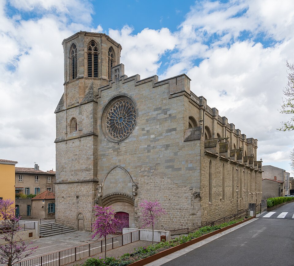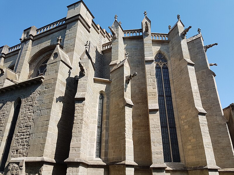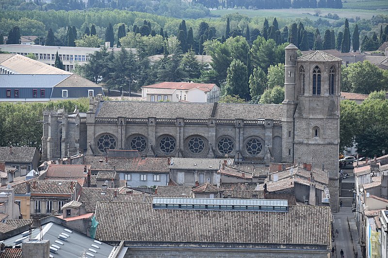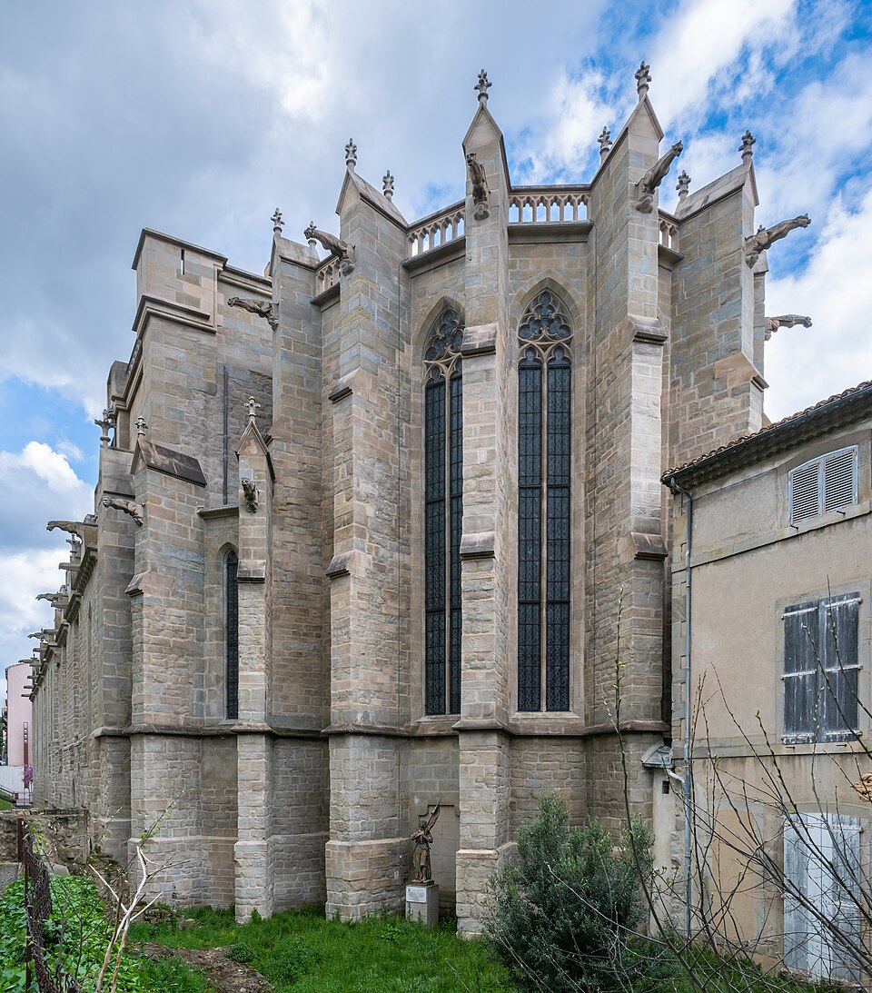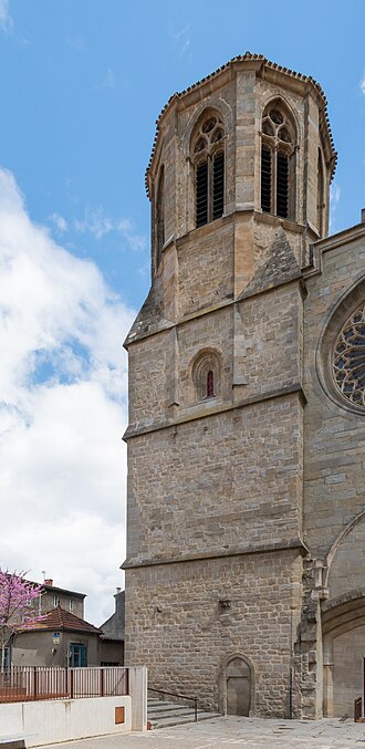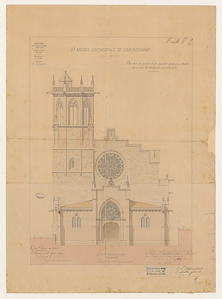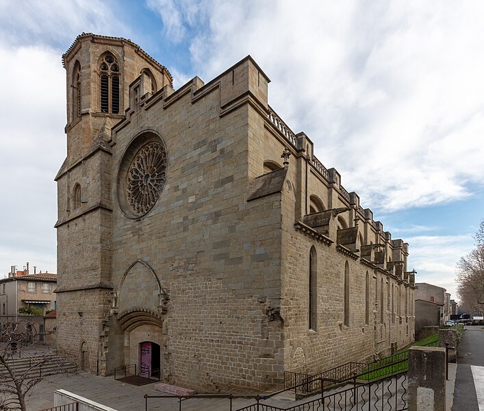 La cathédrale Saint-Michel de Carcassonne, située dans la bastide Saint-Louis au pied de la Cité, remplace la cathédrale Saint-Nazaire-et-Saint-Celse comme siège épiscopal en 1803. Un premier édifice paroissial, implanté dans ce faubourg, fut détruit au début du XIIIe siècle et reconstruit au cours du siècle suivant lors de l'urbanisation de la Ville Basse. La reconstruction et les agrandissements se poursuivirent au XIIIe siècle, notamment après qu'en août 1283 le roi Philippe le Hardi autorisa le recteur à acquérir neuf maisons pour l'extension de l'église. Après l'incursion du Prince Noir, l'église fut endommagée puis intégrée aux nouvelles fortifications du bourg; des traces de ces aménagements subsistent près de l'abside, où se distingue une tour cylindrique d'aspect militaire. Des fossés larges d'environ dix mètres furent creusés autour de l'édifice avant d'être comblés et remplacés au XIXe siècle par une promenade publique. En 1657 on posa des voûtes d'ogives sur la nef, et lors de la nomination de Saint-Michel comme cathédrale en 1803 des aménagements intérieurs furent entrepris pour l'adapter à sa nouvelle fonction. Un incendie qui ravagea le chœur dans la nuit du 4 au 5 novembre 1849 interrompit ces travaux, puis une vaste campagne de restauration dirigée à partir de 1857 par Eugène Viollet-le-Duc transforma l'édifice et en fait un exemple notable de ses restaurations. Viollet-le-Duc remit notamment en place des ouvertures de la nef sous la forme de roses, restaura culots, verrières, clés de voûte et bases en s'inspirant du style de l'ancienne cathédrale de la Cité, releva la partie supérieure du clocher et de la tourelle d'escalier selon un modèle simplifié, et remania la façade occidentale en édifiant un nouveau portail. Le plan de l'édifice reste simple : une nef unique de huit travées, bordée de chapelles latérales et surmontée de roses ajoutées par Viollet-le-Duc, conduit à un chœur composé d'une abside à sept pans flanquée de deux absidioles. Le chœur et les grandes baies ogivales abritent des vitraux du XIVe siècle qui furent restaurés après l'incendie par le maître-verrier Alfred Gérente. Les voûtes ogivales de la nef, posées entre 1657 et 1752, remplacèrent une charpente apparente, tandis que les voûtes du chœur remontent au XIIIe siècle. La façade, sobre, est animée par une rosace de huit mètres de diamètre; le clocher, massif, présente une base rectangulaire sur trois niveaux avant de passer à un couronnement octogonal et renferme une sonnerie de huit cloches. Six des cloches principales furent fondues en 1969 par la fonderie Bollée d’Orléans et les deux plus petites, nommées André et Pierre, en 1995 par la fonderie Cornille-Havard; la cloche majeure porte le nom de Saint-Michel Archange et les autres noms et caractéristiques sont conservés dans l'inventaire. L'orgue de tribune, construit par Aristide Cavaillé-Coll en 1860 pour remplacer un instrument de 1687, fut inauguré par Louis James Alfred Lefébure-Wély ; son buffet en chêne, dessiné par Viollet-le-Duc, adopte un style néo-gothique et est orné de treize statues grandeur nature; l'instrument compte 44 jeux sur trois claviers et pédalier, avec transmissions mécaniques, et a fait l'objet de restaurations successives jusqu'à une remise en état complète en 1998. La cathédrale est classée monument historique depuis le 12 juillet 1886 et ses abords depuis le 2 août 1926, et de nombreux objets y sont répertoriés dans la base Palissy. Une campagne de rénovations d'envergure est en cours depuis 2009 dans le cadre du plan de relance de l'État. La cathédrale abrite les sépultures des évêques Arnaud-Ferdinand de La Porte, Joseph-Julien de Gualy de Saint-Rome, Félix-Arsène Billard, Jean-Joseph Pays et Pierre-Marie Puech. La liste des prêtres responsables de la cathédrale est documentée de 1803 à nos jours, le dernier recteur mentionné étant Georges Rieu (2023).