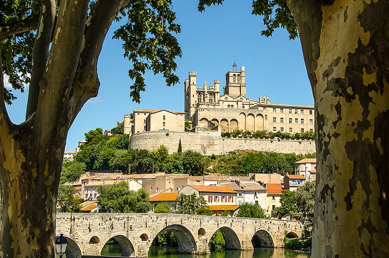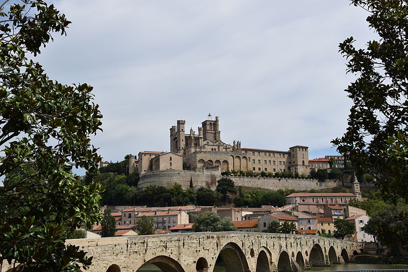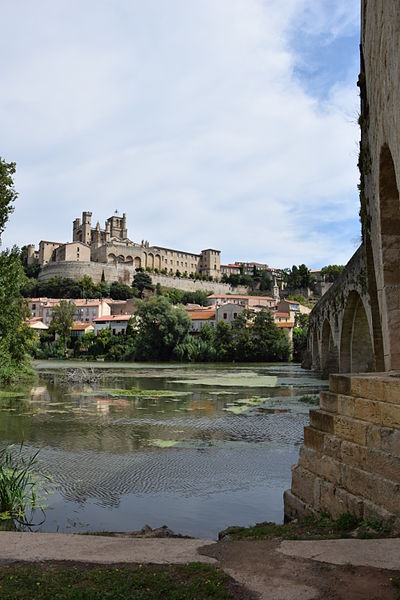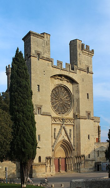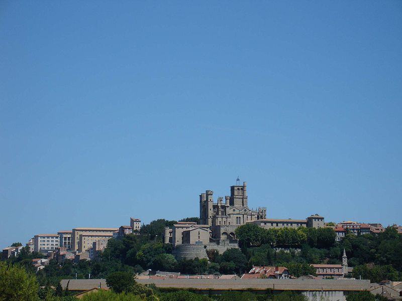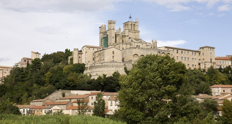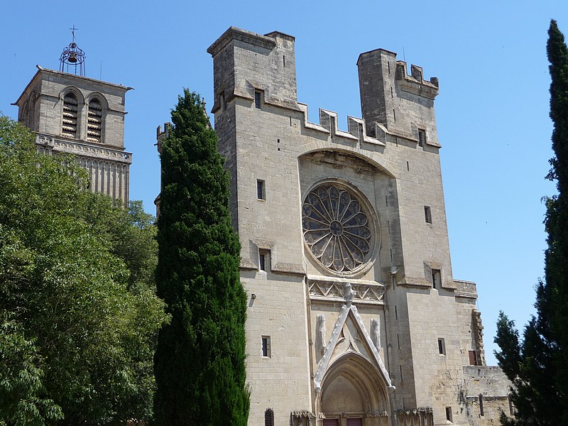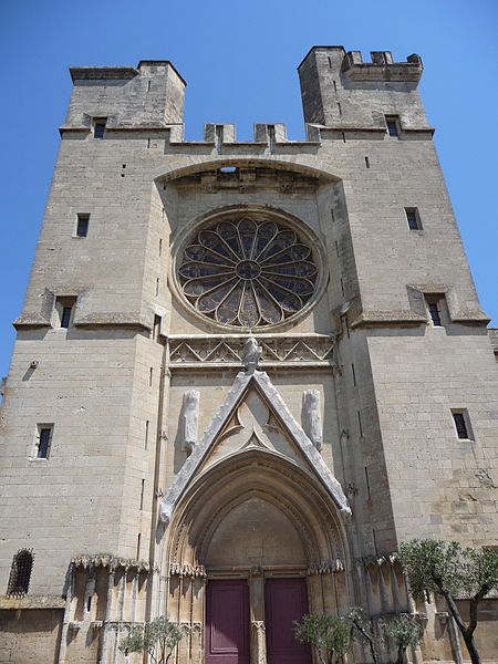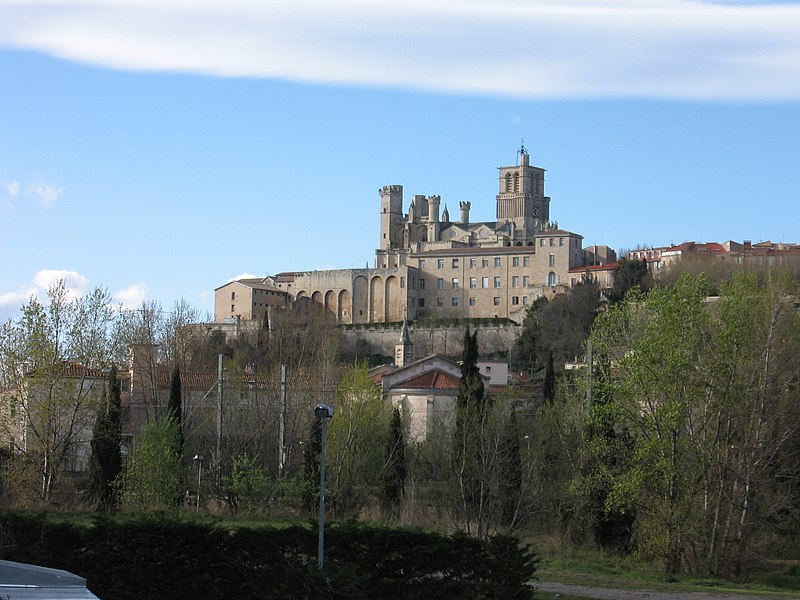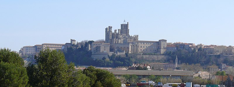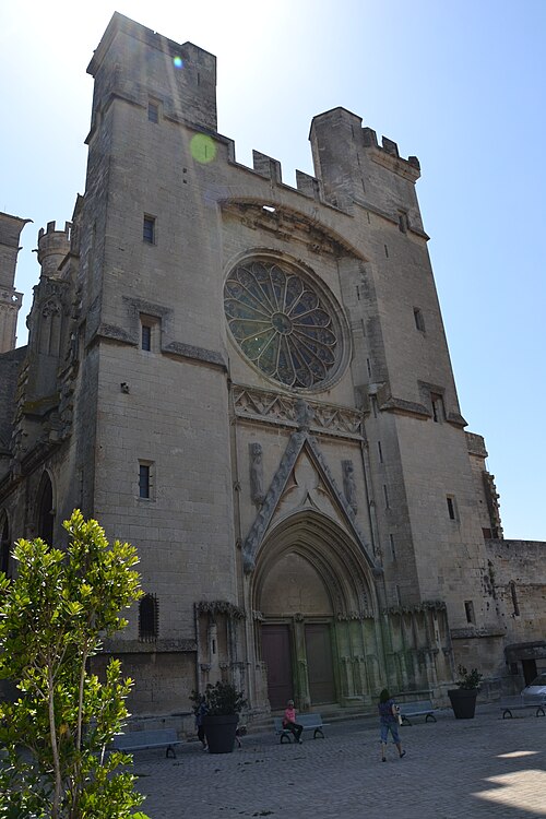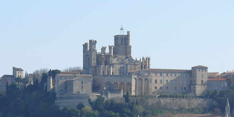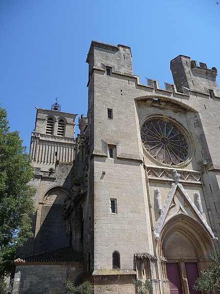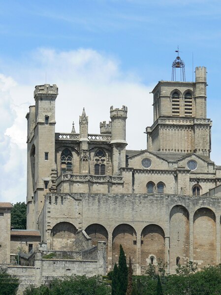 La cathédrale Saint-Nazaire-et-Saint-Celse, de style gothique, se dresse à Béziers, dans l'Hérault, sur un large promontoire dominant la plaine de l'Orb et les contreforts des anciens remparts de la cité médiévale ; son emplacement offre une vue qui va jusqu'aux massifs de la Montagne Noire, du Caroux et, à l'horizon, des Pyrénées. Classée au titre des monuments historiques dès la liste de 1840, elle est dédiée aux saints Nazaire et Celse et repose sur un site ecclésial ancien où s'élevaient une église romane, un cimetière et, auparavant, un temple romain consacré à Auguste et Livie. Un texte signale la présence d'un édifice dès le VIIIe siècle ; l'église romane, attribuée à Maître Gervais, fut entièrement détruite par un incendie lors du sac de Béziers le 22 juillet 1209, et la reconstruction gothique commence au milieu du XIIIe siècle, conservant toutefois quelques vestiges romans visibles à l'intérieur. L'édifice, implanté dans la partie ouest de la ville, associe abside, sacristie et tour-clocher ; la façade occidentale présente un portail à double porte aujourd'hui inutilisé, tandis que l'on distingue le mur nord de la nef, la façade sud donnant sur l'autre rive de l'Orb et le Pont Vieux. Une tour carrée de 48 mètres, surmontée d'une tourelle abritant un campanile en fer, domine la cathédrale ; la partie supérieure, du XVe siècle, est ornée de colonnes dont les bases représentent des visages humains. Le clocher renferme le bourdon Marie, fondu par François Granier et d'environ quatre tonnes, qui est, par son importance, le deuxième de la région après celui de la cathédrale de Montpellier ; de nombreuses gargouilles ornent les murs et des grilles de ferronnerie du XIVe siècle protègent les vitraux du chœur. La sacristie, attenante à l'abside, est plus basse et remonte au XVe siècle sous l'épiscopat de Guillaume de Montjoie ; elle possède une balustrade et des grilles en fer forgé attribuées au XIIIe siècle. La façade est se compose de deux tours et d'un ensemble crénelé, avec une tour ronde en retrait servant de tour de guet ; elle est percée d'une grande rosace de dix mètres de diamètre et son portail, aujourd'hui fermé, est surmonté d'un mâchicoulis ; la plupart des sculptures architecturales ont été détruites, à l'exception de deux statues représentant la Synagogue et l'Église. La porte du nord du transept, créée au XVIIe siècle, est surmontée d'un linteau de bois évoquant le martyre des saints Nazaire et Celse. L'intérieur, en forme de croix grecque, mesure environ cinquante mètres de longueur ; la nef fait quatorze mètres de large, le transept trente-trois mètres et la voûte de la nef s'élève jusqu'à trente-deux mètres. On y trouve des colonnes et chapiteaux romans, vestiges de l'ancienne cathédrale, la majorité des colonnes étant de style gothique et les arcs doubleaux datant du XIVe siècle ; les appuis des tribunes près du chœur portent des frises à triglyphes et métopes, imitations d'un style gallo-romain reprises à l'époque romane. Le chœur conserve d'anciens vitraux gothiques mais a été profondément remanié au XVIIIe siècle dans un style baroque avec une colonnade de marbre rouge encadrant les statues des quatre évangélistes, une gloire en staff et un autel en marbre polychrome ; au-dessus des stalles figurent six grands tableaux, trois signés Thierry sur la vie de Moïse et trois de Raoux représentant Constantin et sainte Hélène. Les murs portent des fresques anciennes, datées des XIVe et XVe siècles, restaurées en 1917 après des dégradations survenues pendant les guerres de Religion ; la cathédrale abrite également une crypte du début du XIIIe siècle accessible par un escalier dans le bas-côté gauche et plusieurs stations du chemin de croix. Le cloître jouxte la cathédrale au sud mais demeure inachevé, sans galerie supérieure ; ses sculptures de voûtes datent du XIVe siècle et sa fontaine occupe aujourd'hui la place de la Révolution ; il conserve une collection lapidaire partiellement transférée au Musée du Biterrois, ainsi qu'un buste romain posé au sol, des statues d'art sacré, des éléments d'épigraphie médiévale et moderne, des pierres tombales scellées et deux fragments de sarcophage tardo-antique d'ateliers aquitains. En contrebas du cloître, le jardin de l'Évêché offre un panorama sur la plaine de l'Orb, les ponts — dont le Pont-Vieux —, le pont-canal et les écluses de Fonserannes. Le cloître a servi de lieu d'inhumation, notamment le 11 juillet 1769 pour Barbe Marguerite d'Igny de Risaucourt. Le grand orgue, installé sur une tribune à l'extrémité de la nef, présente un buffet de style Louis XIII réalisé par Guillaume Martois au XVIIe siècle ; sa partie instrumentale provient de diverses campagnes des XVIIe et XVIIIe siècles (Guillaume Poncher, Jean de Joyeuse, Joseph Isnard), complétées au XIXe siècle par une reconstruction en 1868 par Théodore Puget qui a modifié l'harmonisation, et l'instrument a été restauré en 1993. Le clocher contient au total six cloches : une cloche de tintement fondue en 1788 par Claude Brenel, logée dans un campanile en fer sur le toit, et cinq cloches battantes installées dans un beffroi métallique à l'intérieur du clocher ; parmi elles, quatre sont en volée rétrograde et une, dite Bernadette, en lancé-franc. La cathédrale possède aussi une cloche des heures fondue par Claude Brenel en 1788 dans un campanile séparé ; sont encore nommées Marie, bourdon fondu en 1939 par Granier (masse 3 958 kg, note la#2), Alexandrine (Burdin-Aîné 1892, 1 885 kg, do#3), Gabrielle (Burdin-Aîné 1893, 752 kg, fa#3), Isabelle (Burdin-Aîné 1893, 411 kg, la#3), Bernadette (Granier 1939, 193 kg, do#4) et la cloche Marie-Espérance, fondue en 2025 et consacrée lors des célébrations du millésime, le 28 septembre 2025.
