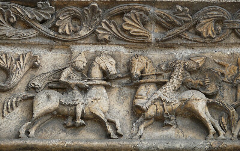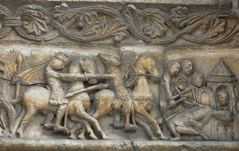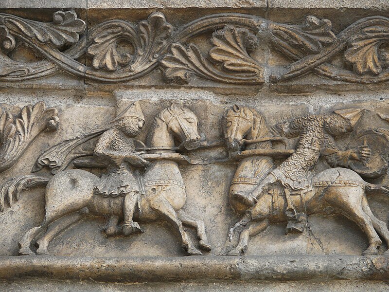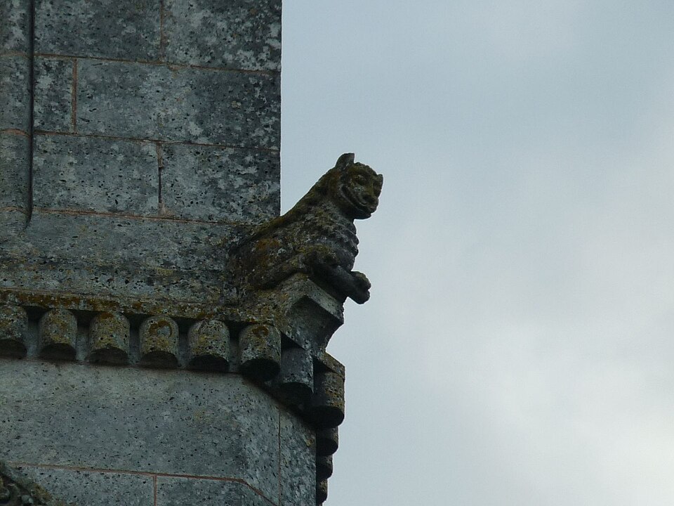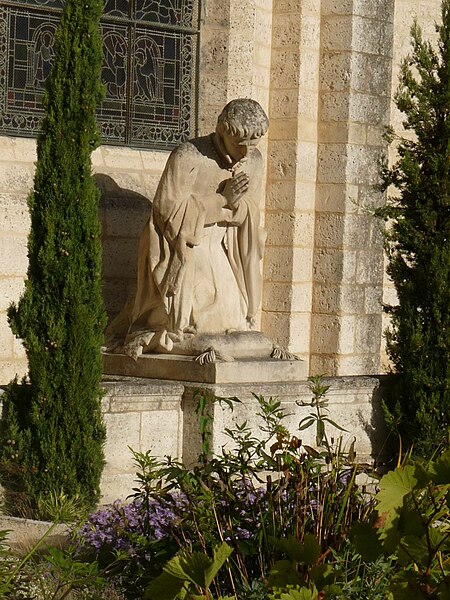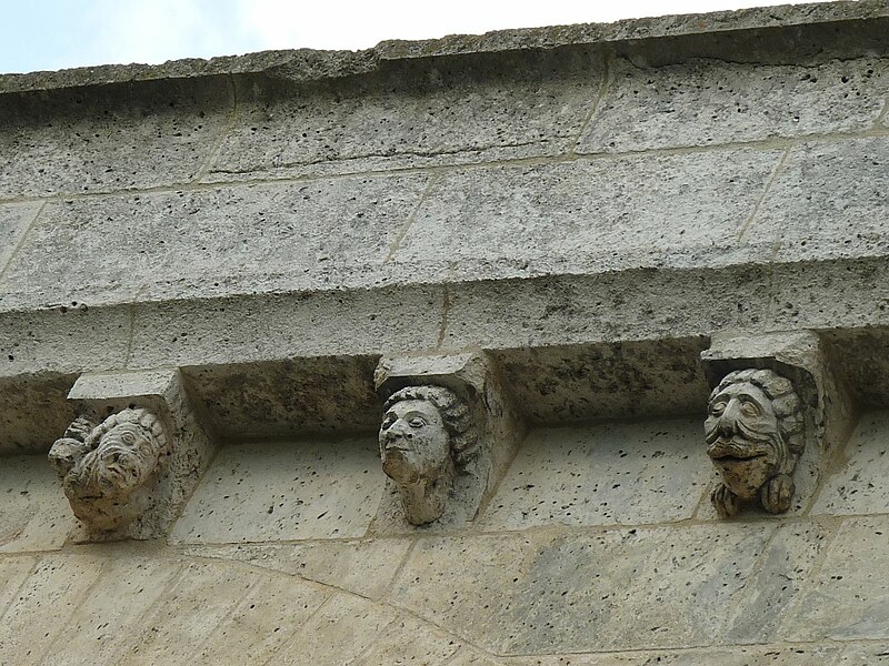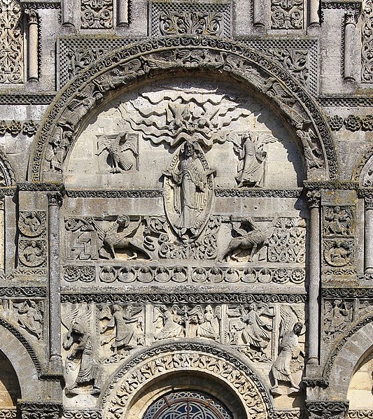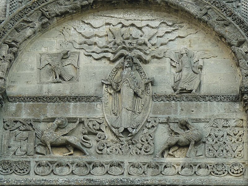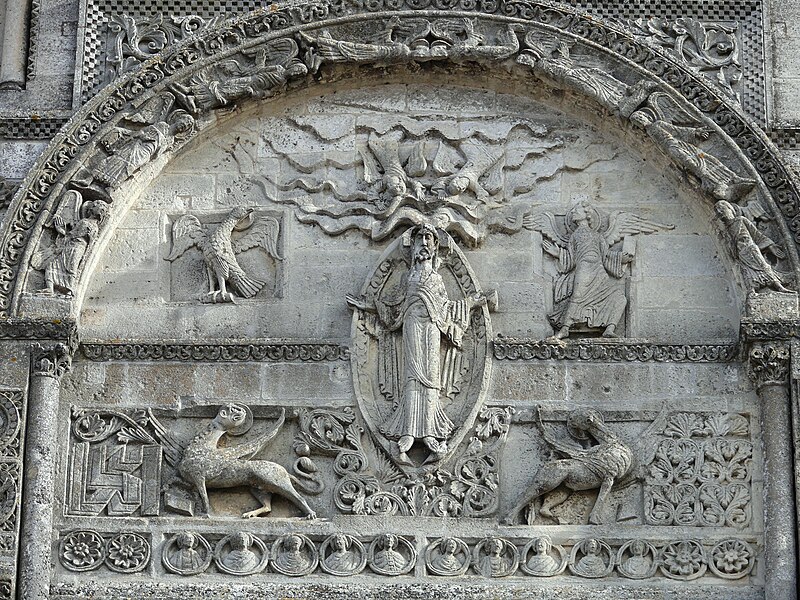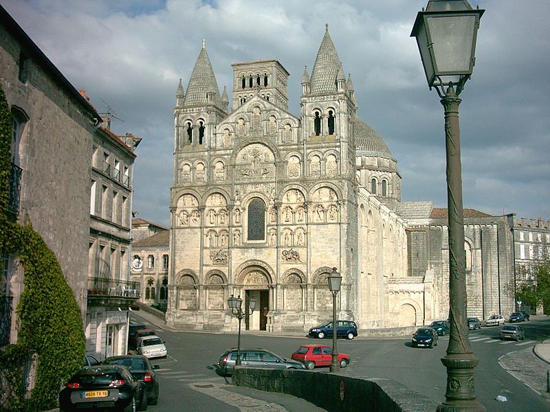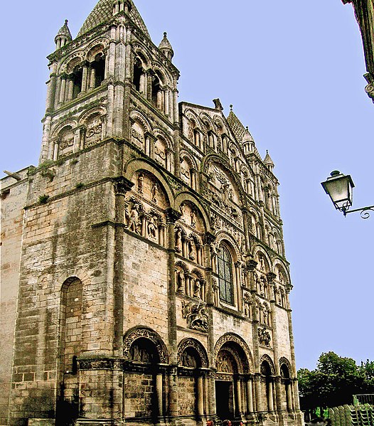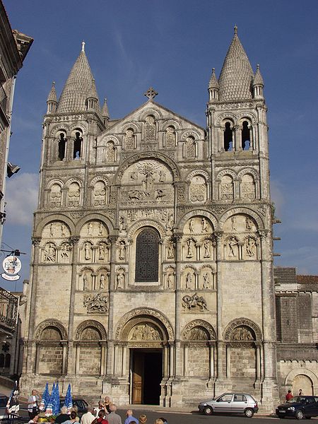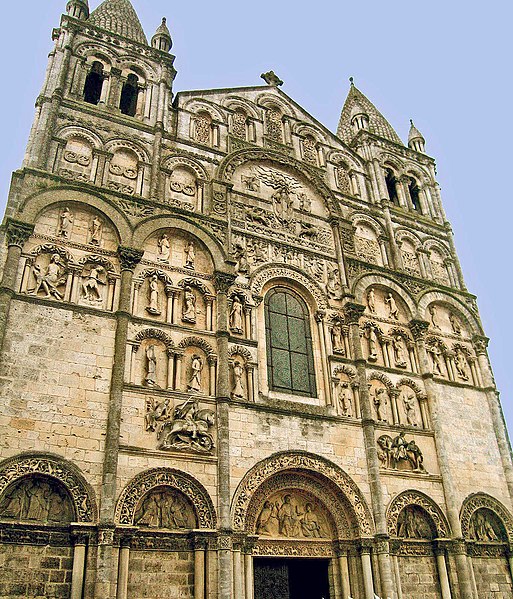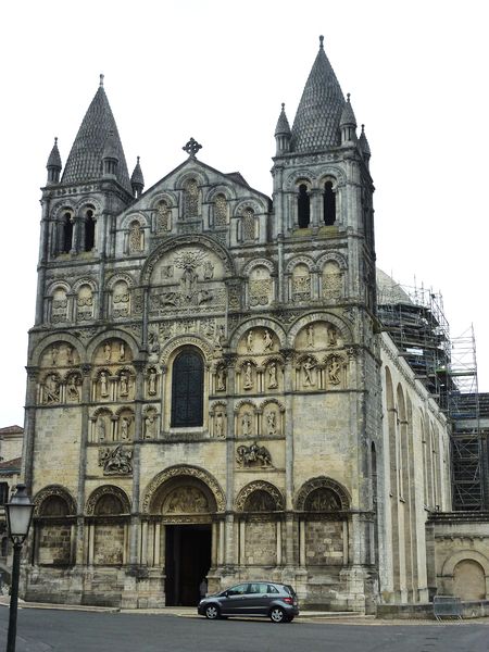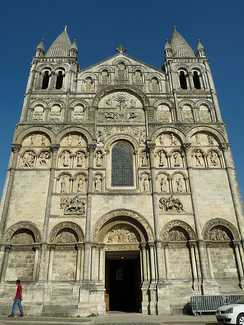 La façade occidentale, organisée en quatre registres superposés peuplés d'arcades plaquées et centrée par une arcade surhaussée, est couronnée d'un pignon triangulaire et de deux clochetons ajoutés par Abadie ; son programme iconographique développe les thèmes de l'Ascension et du Jugement dernier. Au sommet apparaît le Christ en gloire dans une mandorle entouré des figures du tétramorphe ; au registre supérieur figurent anges et élus tournés vers le Sauveur, au registre intermédiaire se trouvent apôtres et figures des élus et des réprouvés, et au niveau du portail le tympan représente le Christ bénissant et présentant les Évangiles, encadré d'apôtres dans les arcades latérales. Au‑dessus court une frise sculptée de scènes de chasse et de guerre, réalisée vers 1118‑1119 et illustrant notamment la reprise de Saragosse et des épisodes de la Chanson de Roland, tels que le combat du « Turpin » contre le géant Abisme et la poursuite de Marsile par Roland. Des reliefs de chevaliers ajoutés au XIXe siècle représentent saint Martin partageant son manteau et saint Georges terrassant le dragon, alors que d'anciens reliefs de cavaliers ont disparu lors d'aménagements en 1808. Le style des sculptures romanes, influencé par les ateliers de Saint‑Sernin de Toulouse, se reconnaît dans l'emploi de plis en virgule, tandis que les chapiteaux à feuilles grasses s'inspirent de la tradition poitevine.