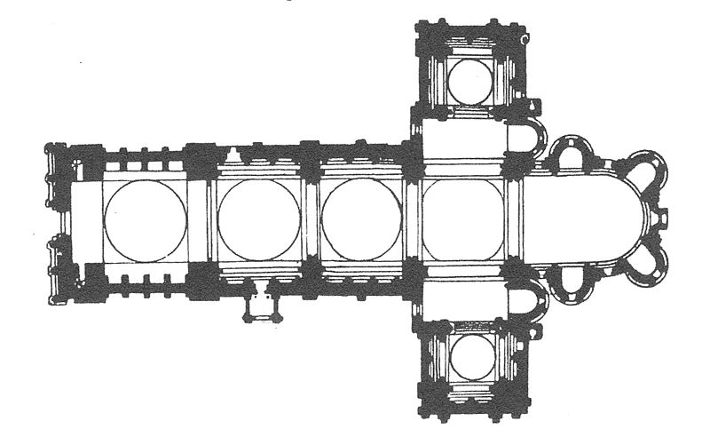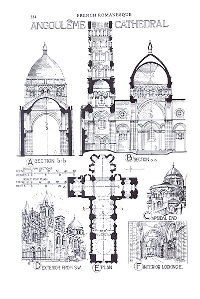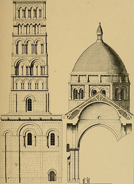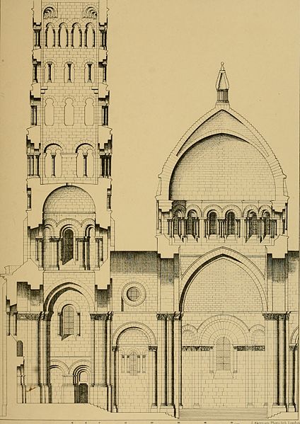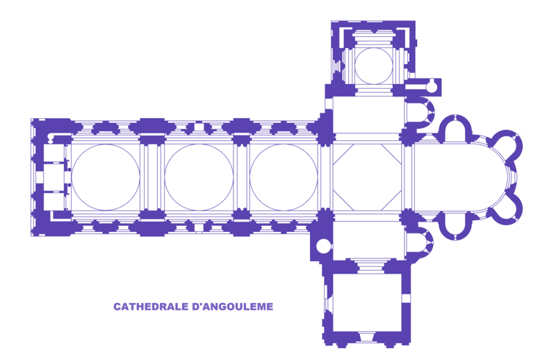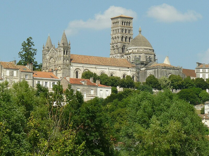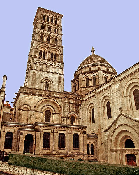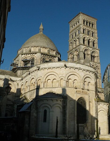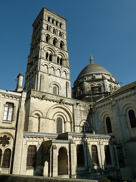 Construite en petit et moyen appareil de calcaire turonien, la cathédrale présente une nef unique de trois travées carrées, large d'environ 20 m, surmontées de coupoles sur pendentifs, suivie d'un transept aux bras courts flanqués d'absidioles semi‑circulaires et d'un chœur profond terminé en hémicycle autour duquel s'articulent quatre absidioles rayonnantes ; du chevet, seule l'abside et l'absidiole sud sont d'origine. La croisée du transept est couverte par une coupole octogonale dont le tambour, initialement animé d'arcades aveugles, fut percé au XVIIe siècle puis élevé et recomposé par Abadie au XIXe siècle pour augmenter l'éclairage ; la coupole elle‑même a été reconstruite au XIXe siècle dans un style néo‑byzantin. Les bras du transept sont éclairés à l'est par des oculi et couverts en berceau ; le soubassement du clocher nord est d'origine tandis que le clocher sud a été reconstruit après sa destruction. Plusieurs portails latéraux ont été ajoutés contre les travées de nef.