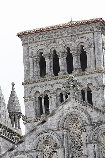 Le clocher nord s'élève à 59 m et comporte six étages, la plupart ayant été entièrement reconstruits au XIXe siècle ; avant cette restauration une flèche à pans couverts d'ardoise couronnait la tour, visible sur des photos de 1851. La tour abrite une sonnerie de cinq cloches fondues par la fonderie Guillaume père et fils à Angers en 1863, baptisées le 23 octobre 1863 par l'évêque Antoine‑Charles Cousseau : Pierre et Paul (bourdon) 4 120 kg, Marie 1 600 kg, Caroline 1 150 kg, Marguerite 810 kg et Henriette 622 kg. La coupole de la croisée, reconstruite au XIXe siècle dans un style néo‑byzantin, évoque les restaurations et constructions contemporaines comme celles de Saint‑Front de Périgueux et, ultérieurement, du Sacré‑Cœur de Paris.