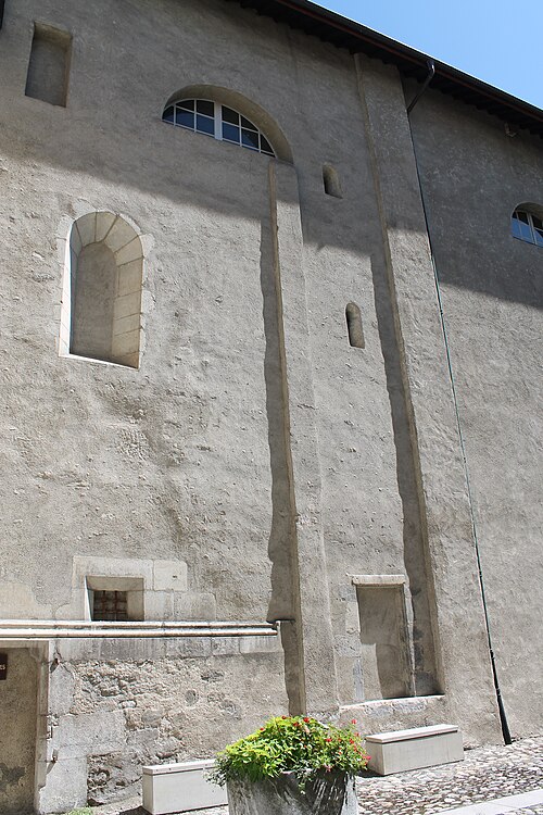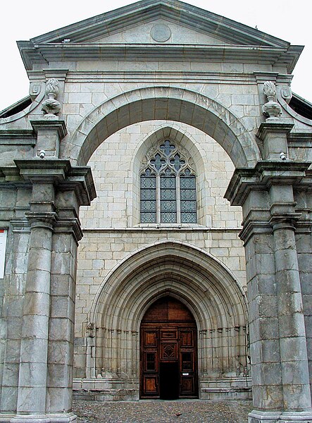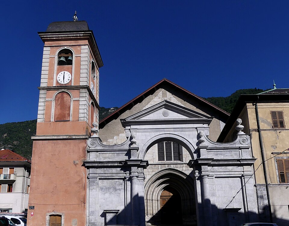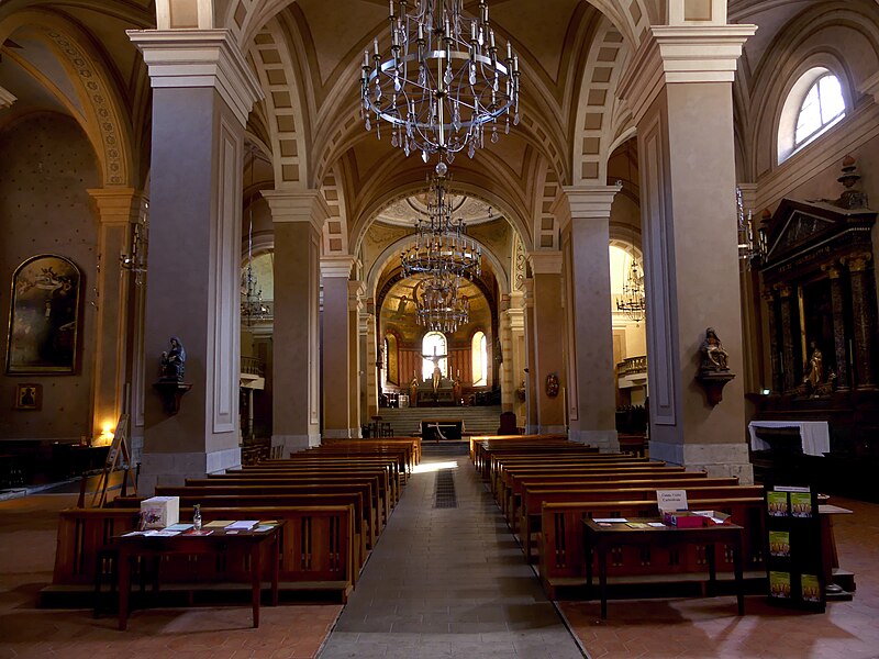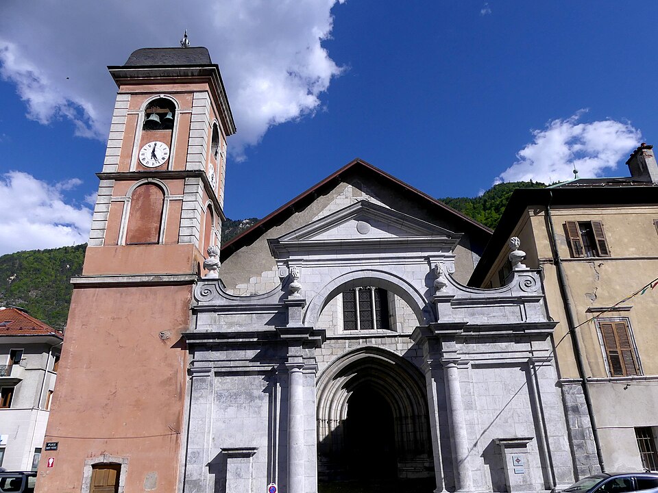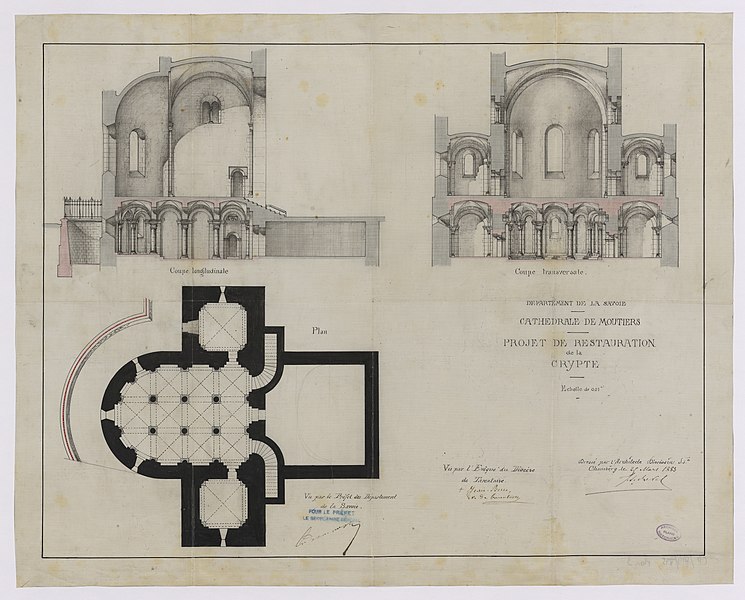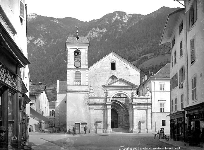 La cathédrale Saint-Pierre de Moûtiers, située à Moûtiers dans la vallée de la Tarentaise (Savoie), présente un plan en croix latine de dimensions modestes : une nef divisée en trois nefs sur quatre travées voûtées d'arêtes, un transept saillant et une coupole à lanternon à la croisée. Ses nombreux remaniements témoignent de l'histoire complexe du diocèse de Tarentaise ; la partie intermédiaire conserve notamment le blason de l'archevêque Milliet de Challes et le campanile illustre le « style sarde », caractéristique de l'architecture religieuse savoyarde du XIXe siècle. L'évêché de Tarentaise a été créé au Ve siècle ; une lettre du pape saint Léon (450) rattache cet évêché à la métropole de Vienne. La première mention connue de la cathédrale figure dans l'homélie de saint Avit, prononcée lors de la dédicace de l'édifice reconstruit par l'évêque Sanctus entre 517 et 525, qui remplaçait un bâtiment devenu trop petit. Des fouilles du XIXe siècle ont mis au jour, au chevet, un bâtiment circulaire témoignant de l'existence d'un groupe épiscopal comprenant probablement église, paroisse et baptistère. Les incursions sarrasines ont atteint la région et ont probablement contribué à la destruction de la cathédrale avant les reconstructions médiévales ; au Xe siècle, les archevêques reçurent le comitatus d'une partie de la vallée, les élevant au rang de princes d'Empire et leur procurant des ressources pour rebâtir. Au XIe siècle, un archevêque (peut-être Aymon dit Amizon ou son successeur) entreprit la reconstruction de la cathédrale et des bâtiments épiscopaux ; de l'édifice roman subsistent principalement le chœur et l'abside, ainsi que deux des quatre tours originelles, la tour nord assurant la fonction de clocher. La crypte romane, servant de martyrium et provoquant une surélévation du chœur, fut supprimée pour des raisons de stabilité, et des fresques du chœur, recouvertes au XVIIe siècle par Mgr Milliet de Challes, furent partiellement dégagées en 1882 par l'architecte Borrel. Les études récentes montrent une construction en deux temps : la partie orientale vers 1020 et la nef occidentale vers 1050 ; de la nef romane subsiste notamment le mur gouttereau sud remanié. Entre 1141 et 1175 l'archevêque Pierre II fit voûter la nef en pierre, et au XVe siècle le cardinal Jean d'Arces fonda la chapelle des Innocents et fit reconstruire des éléments dans le style gothique, comme l'atteste une plaque de 1461 mentionnant le maître maçon François Cirgat. Aux XVIIe et XVIIIe siècles, l'archevêque François-Amédée Milliet de Challes adapta l'édifice à la liturgie tridentine en abaissant le niveau du chœur par la destruction de la crypte, en percant des baies dans les bras du transept et en faisant édifier la coupole à lanternon par Louis Billot ; des actes datés de 1669 et 1671 concernent ces travaux, et un porche construit en 1686 fut détruit à la Révolution puis reconstruit en 1864. Pendant la Révolution, la cathédrale fut transformée en Temple de la Raison et, sur ordre du représentant Antoine Louis Albitte, les clochers furent abattus, ce qui provoqua l'affaissement de la charpente et l'effondrement des voûtes romanes et gothiques le 24 décembre 1794 ; les clercs se réfugièrent en Piémont et la réorganisation concordataire de 1801 supprima l'archidiocèse au profit de Chambéry. Au XIXe siècle, après le rétablissement du diocèse de Tarentaise en 1825, la cathédrale, fortement endommagée, fit l'objet d'une restauration : la nef fut reconstruite dans un style classique, les travaux confiés à Ernesto Melano et Sogno à partir de 1827, la décoration confiée au peintre Casimir Vicario selon un contrat du 13 février 1829, la cathédrale étant bénite le 31 octobre 1829 et consacrée le 3 juillet 1831. L'édifice a été classé monument historique le 30 octobre 1862 ; une chapelle latérale a été ajoutée en 1869 et, en 1882, l'architecte Borrel a reconstitué une crypte romane en supprimant certaines décorations du XVIIe siècle dans le chœur. Architecturalement, le chœur se compose d'une travée voûtée flanquée de deux chapelles qui occupaient la base des tours orientales détruites à la Révolution, seule la tour nord ayant été reconstituée après 1860, et se termine par une abside romane en cul-de-four. La façade, remaniée à la fin du Moyen Âge, présente un portail baroque ; la coupole peinte par Casimir Vicario date de 1829 et la nef actuelle résulte de la reconstruction entreprise vers 1827.