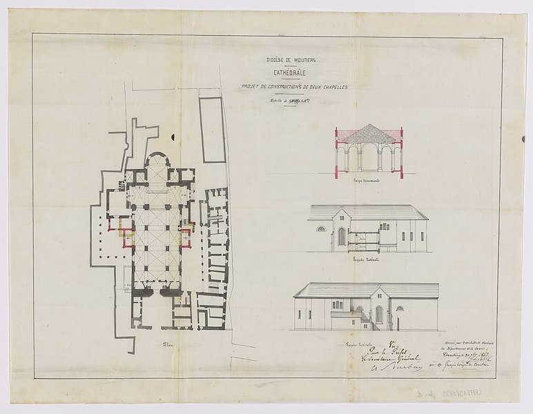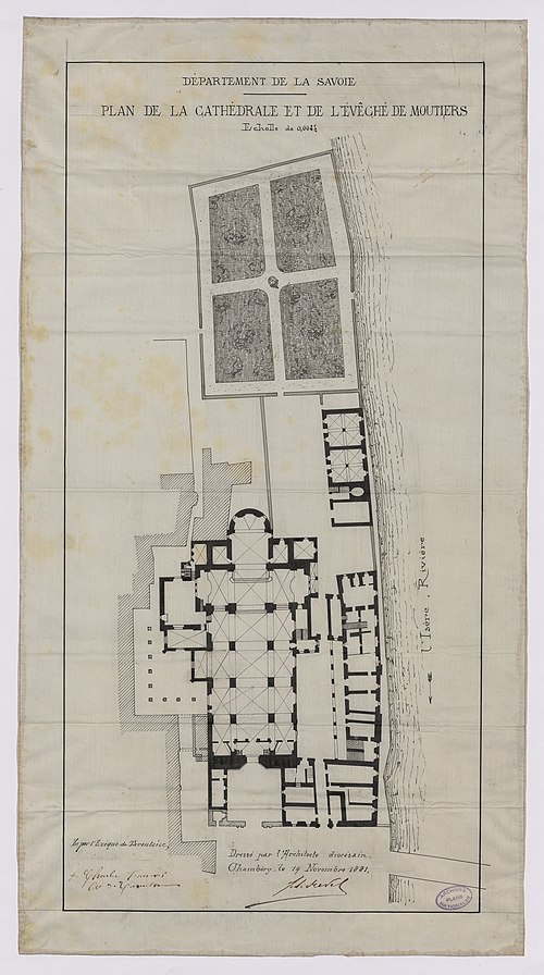 La cathédrale Saint-Pierre et ses dépendances, telles que teintées en bleu sur le plan annexé à l'arrêté et appartenant : à l’État pour les parcelles n° 2102 et n° 2103, figurant au cadastre section A et à la commune de Moûtiers, pour les parcelles n° 406, n° 409 et n° 410, figurant au cadastre section A : classement par arrêté du 25 mars 2015