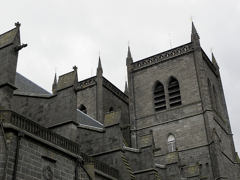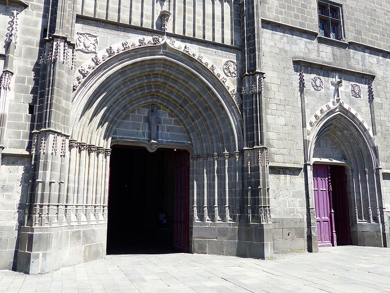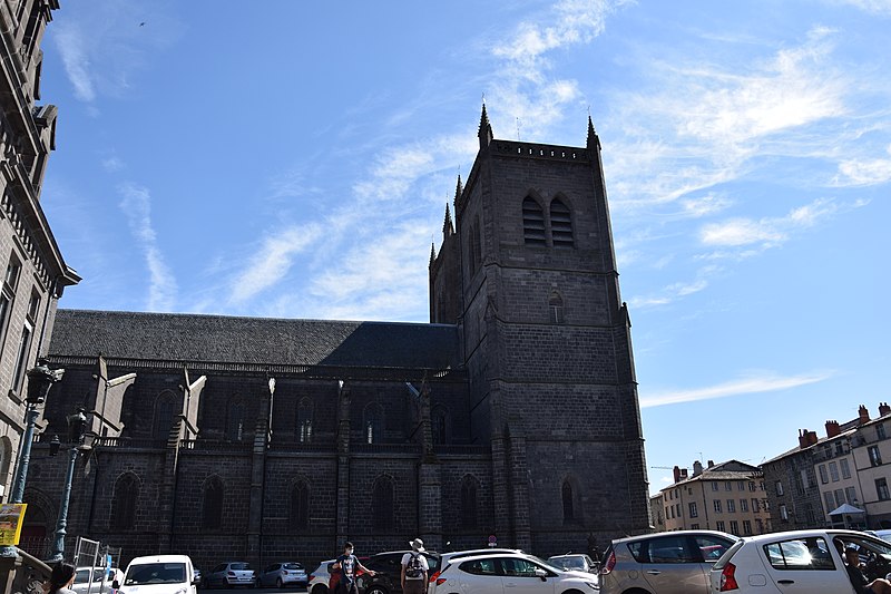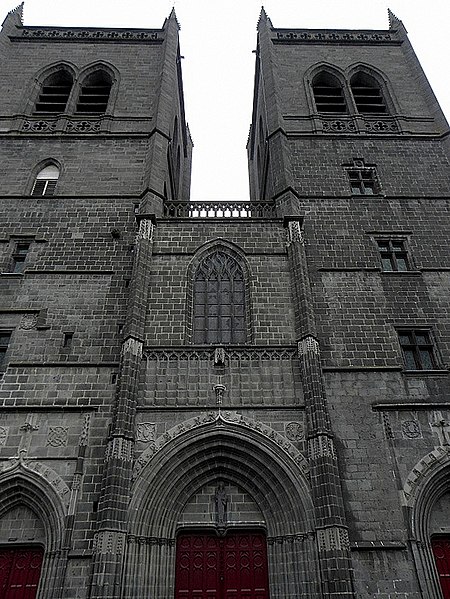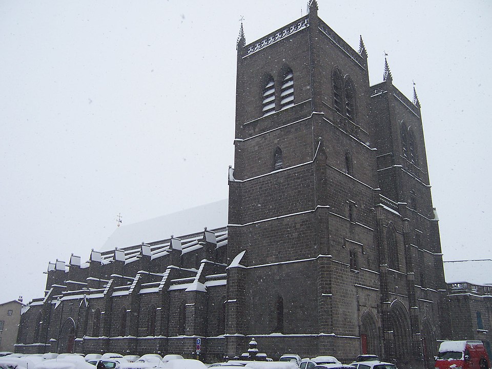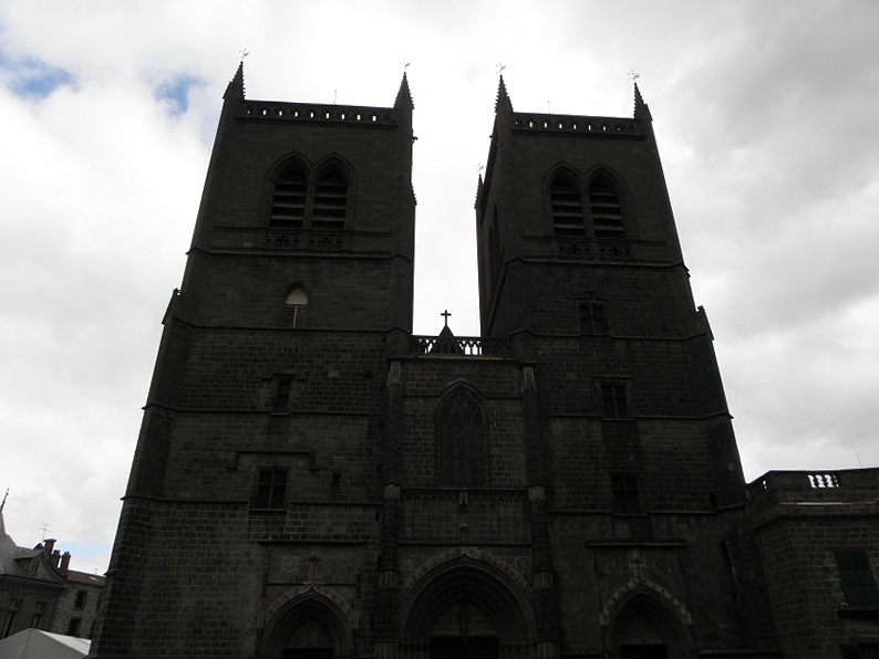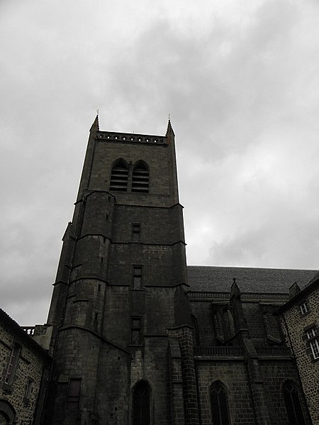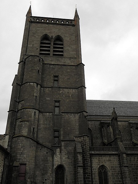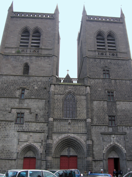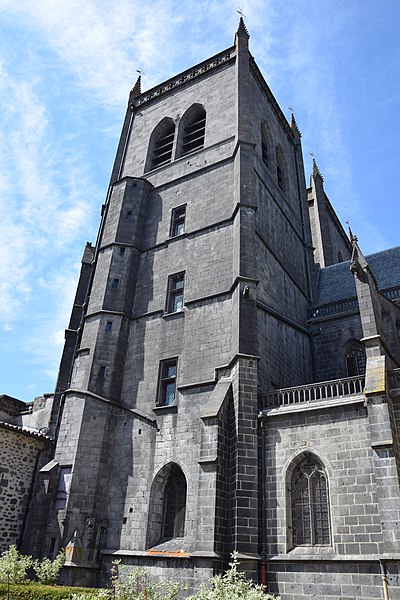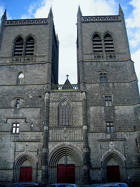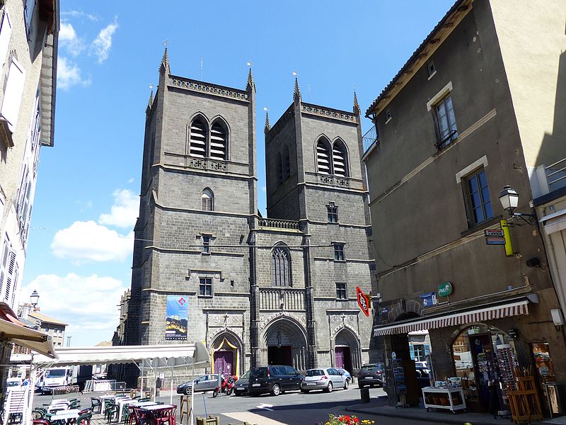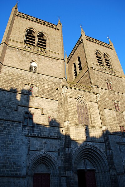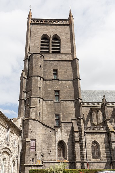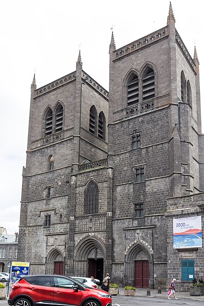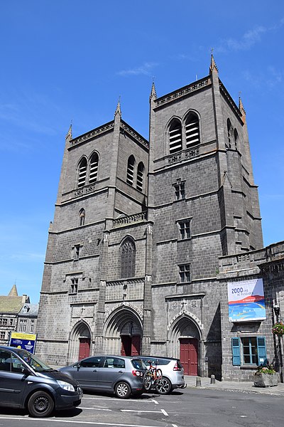 La cathédrale Saint-Pierre de Saint-Flour, située au cœur de la ville sur la place d'Armes bordée d'arcades, est l'une des quatre cathédrales d'Auvergne et siège du diocèse de Saint-Flour (Cantal). Consacrée en 1095 par le pape Urbain II, l'édifice primitif n'en laisse aucun vestige en élévation ; l'actuelle cathédrale, construite entre 1396 et 1466, a été élevée sur l'emplacement d'une ancienne basilique romane. L'église, de style gothique flamboyant, est décrite comme composée de trois nefs sans transept, tandis que l'intérieur est parcouru de lignes verticales et doté, selon d'autres descriptions, de cinq nefs étroites dirigées vers la lumière. Le matériau dominant est la pierre volcanique, la lave noire de Liozargues, qui lui donne une teinte sombre et une allure de forteresse avec ses deux tours carrées massives. Le parvis se situe à 892 m d'altitude, ce qui fait de cette cathédrale, pour cette situation, la plus haute d'Europe. Les dimensions indiquées sont une longueur totale de 65 m, une largeur de 24,60 m, une longueur du vaisseau principal de 44 m, une hauteur de nef centrale de 16,50 m et une hauteur des tours de 35 m.