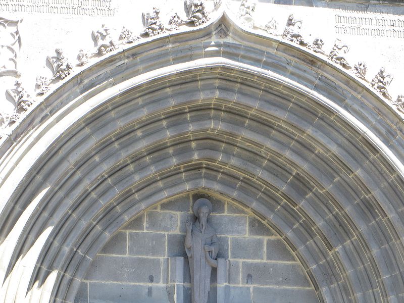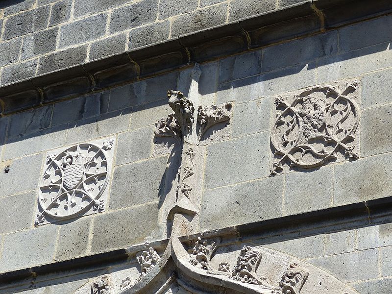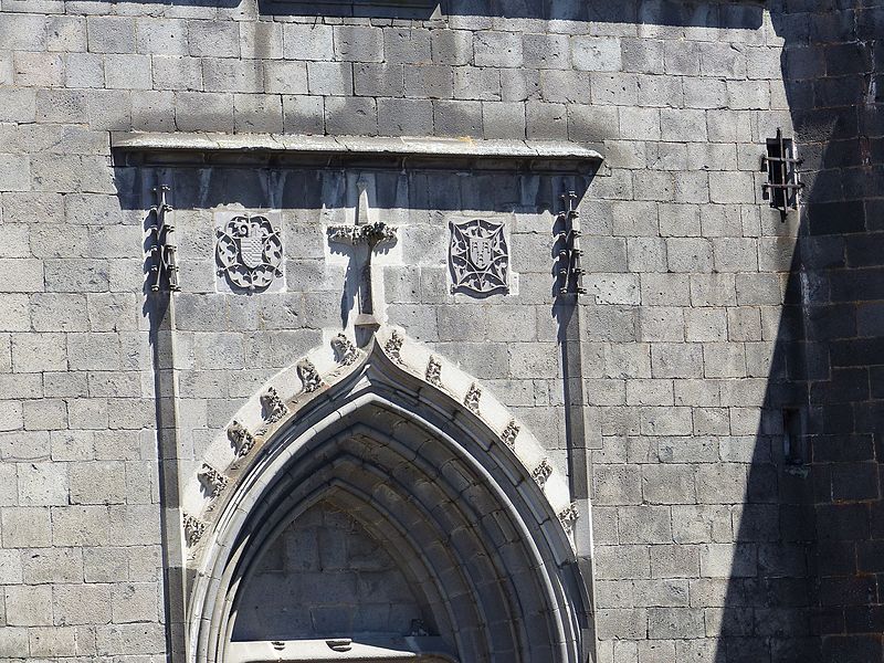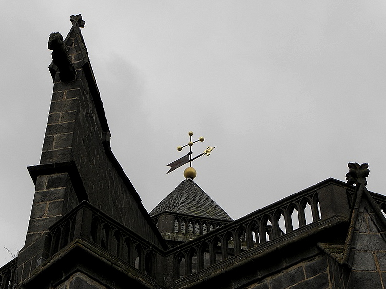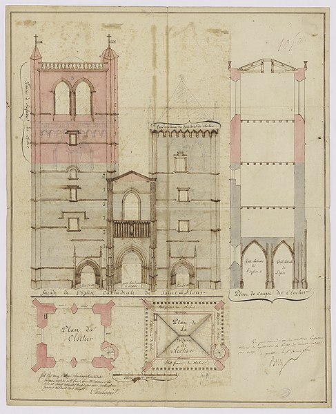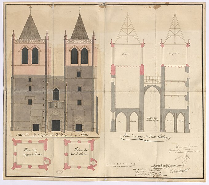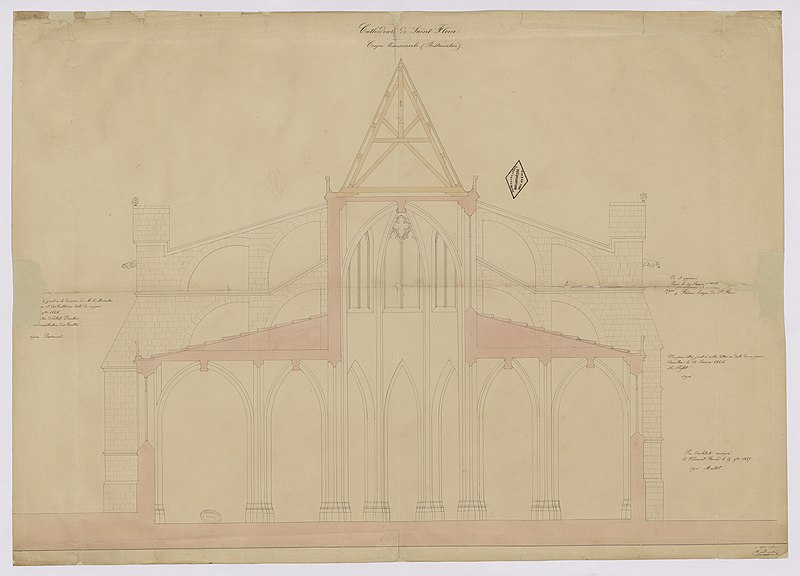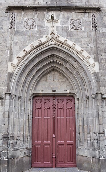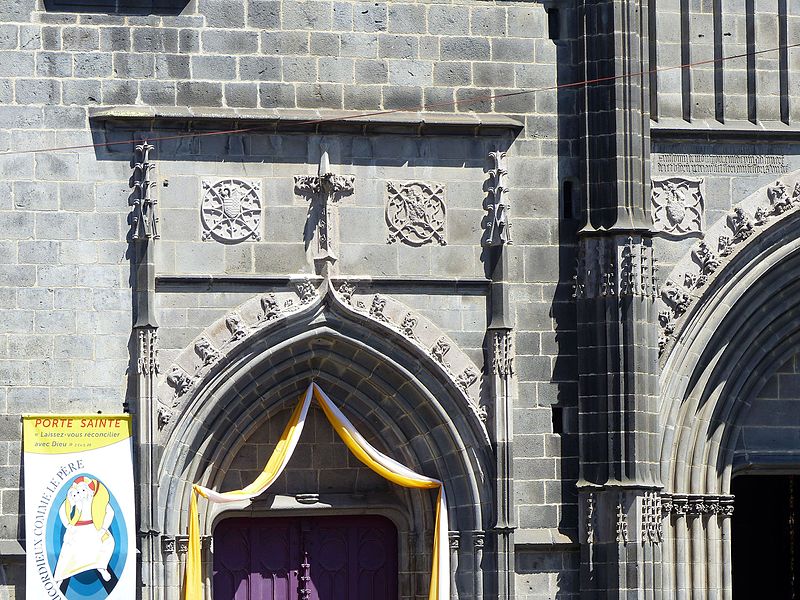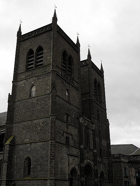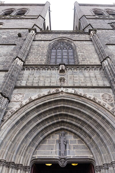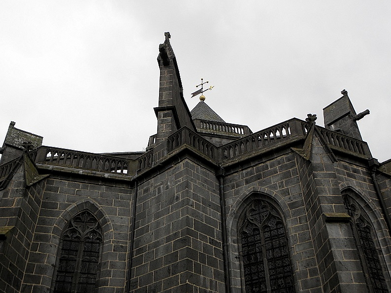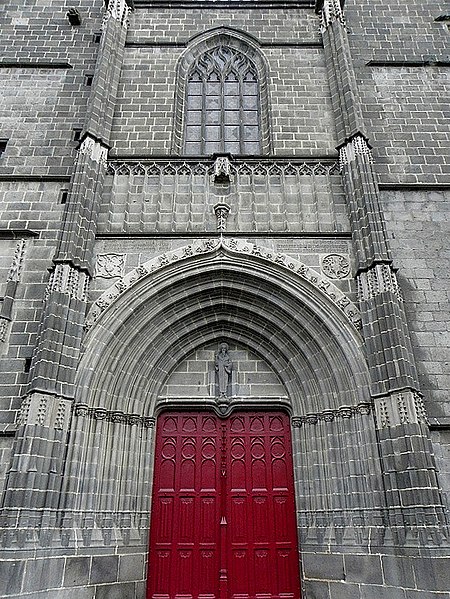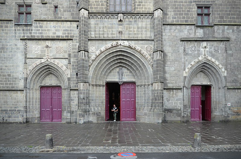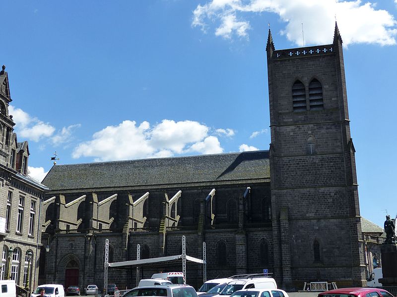 La cathédrale Saint-Pierre de Saint-Flour, située au cœur de la ville sur la place d'Armes bordée d'arcades, est l'une des quatre cathédrales d'Auvergne et siège du diocèse de Saint-Flour (Cantal). Consacrée en 1095 par le pape Urbain II, l'édifice primitif n'en laisse aucun vestige en élévation ; l'actuelle cathédrale, construite entre 1396 et 1466, a été élevée sur l'emplacement d'une ancienne basilique romane. L'église, de style gothique flamboyant, est décrite comme composée de trois nefs sans transept, tandis que l'intérieur est parcouru de lignes verticales et doté, selon d'autres descriptions, de cinq nefs étroites dirigées vers la lumière. Le matériau dominant est la pierre volcanique, la lave noire de Liozargues, qui lui donne une teinte sombre et une allure de forteresse avec ses deux tours carrées massives. Le parvis se situe à 892 m d'altitude, ce qui fait de cette cathédrale, pour cette situation, la plus haute d'Europe. Les dimensions indiquées sont une longueur totale de 65 m, une largeur de 24,60 m, une longueur du vaisseau principal de 44 m, une hauteur de nef centrale de 16,50 m et une hauteur des tours de 35 m.