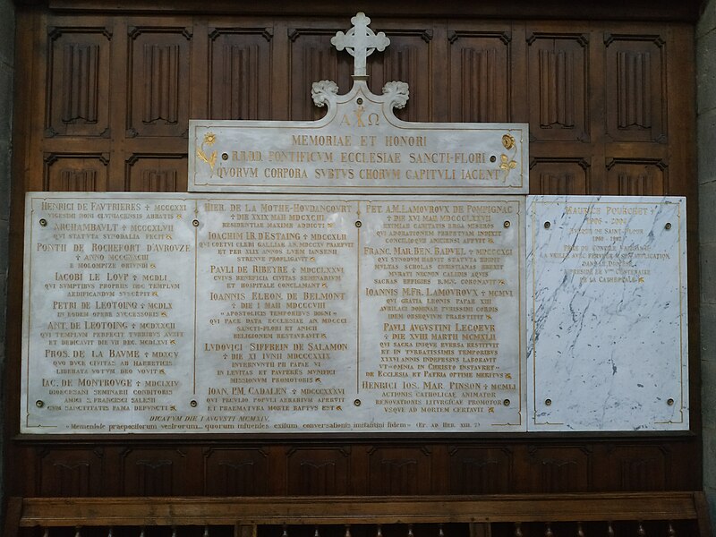 À l'intérieur, le grand Christ noir en noyer, dit « Beau Dieu noir », est installé à l'entrée du chœur contre le pilier gauche ; une étude de 2019 le date entre le XIe et le XIIIe siècle et montre qu'il fut à l'origine polychrome, puis partiellement brûlé et noirc i au cours des transformations ultérieures. Les chapelles abritent des vitraux d'Émile Thibaud, une pietà polychrome du XVe siècle, la châsse en bronze doré de l'orfèvre Poussielgue contenant des reliques de saint Flour (1897), ainsi que des œuvres comme un Christ au tombeau de 1842 par Fauginet, un tableau du XVIIIe siècle représentant saint Vincent de Paul et une statue en marbre d'Alexandre Oliva représentant l'évêque Lamouroux de Pompignac. Le chœur comporte un maître-autel en marbre polychrome surmonté d'un ciborium en bois doré et un lutrin du XVIIIe siècle ; l'ancienne crédence sert d'autel face aux fidèles, les stalles du chapitre ont été remises en place en 1852 et les vitraux de l'arrière-chœur (1851) par Étienne Thevenot représentent saint Flour et saint Odilon. La chaire a été sculptée en 1868 par l'ébéniste local Jean Peuch.
