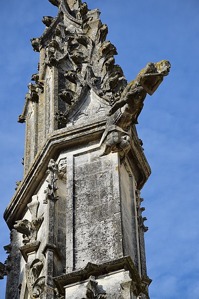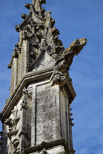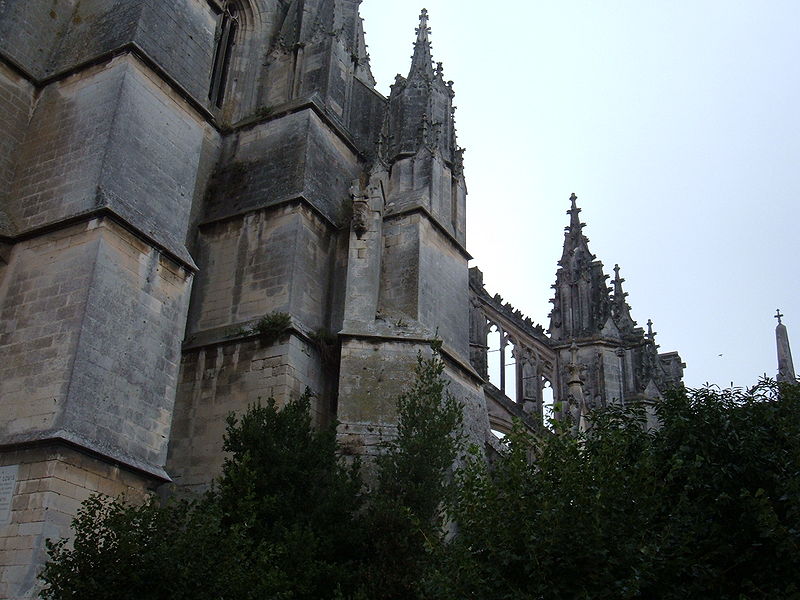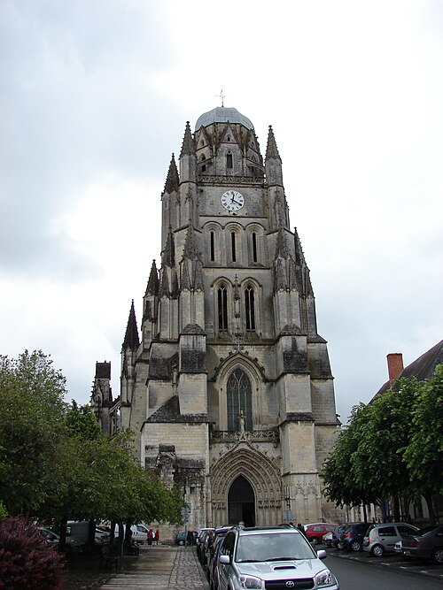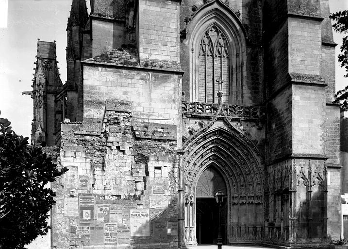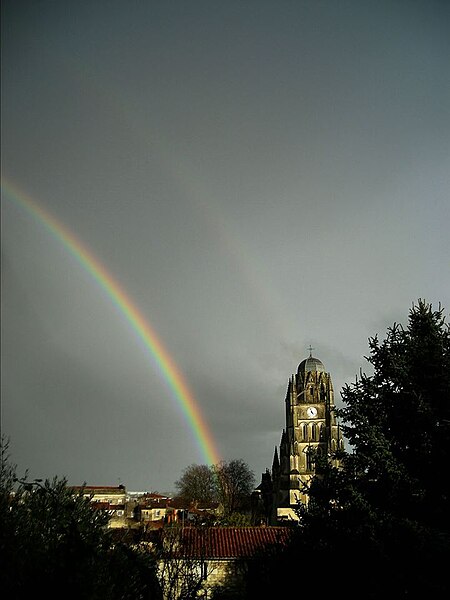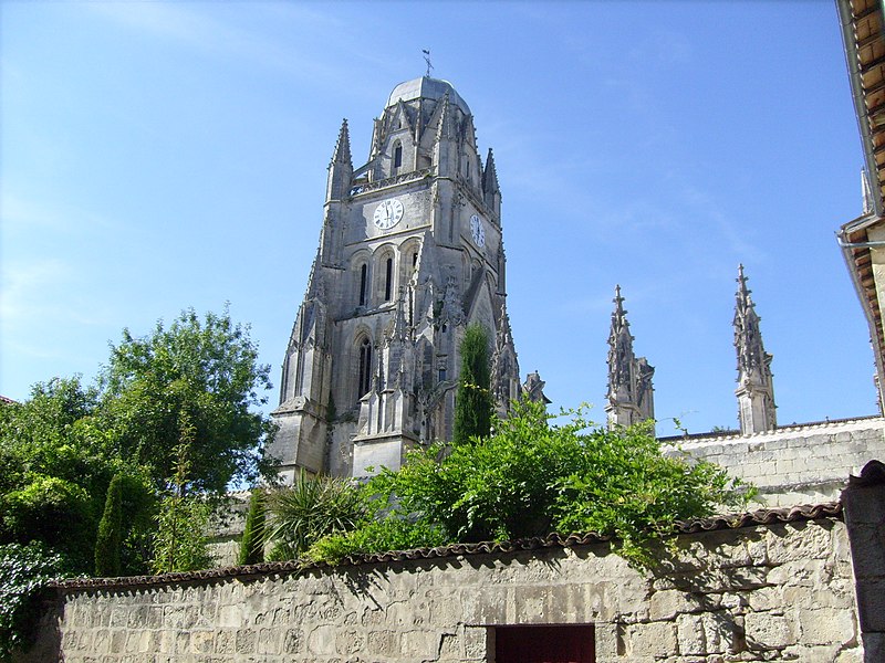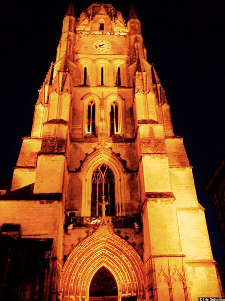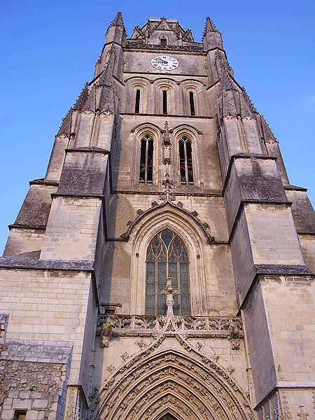 Le clocher-porche, qui domine la ville sur près de 58 m, devait porter une flèche en pierre mais resta inachevé après les guerres de Religion ; il est couvert d'un dôme en cuivre et accessible par un escalier à vis du XVe siècle menant à la plateforme sommitale. Le clocher abrite trois cloches de volée — Pierre (bourdon), Marie et Louis — ainsi qu'un braillard fixe servant de timbre pour l'horloge ; Pierre, fondu en 1834, fait partie des cloches au son le plus grave du département. Le portail occidental, représentatif de la sculpture gothique tardive du Sud-Ouest, présente une ogive à quatre voussures ornées d'anges, d'apôtres et de diverses figures ecclésiastiques et chevaleresques.