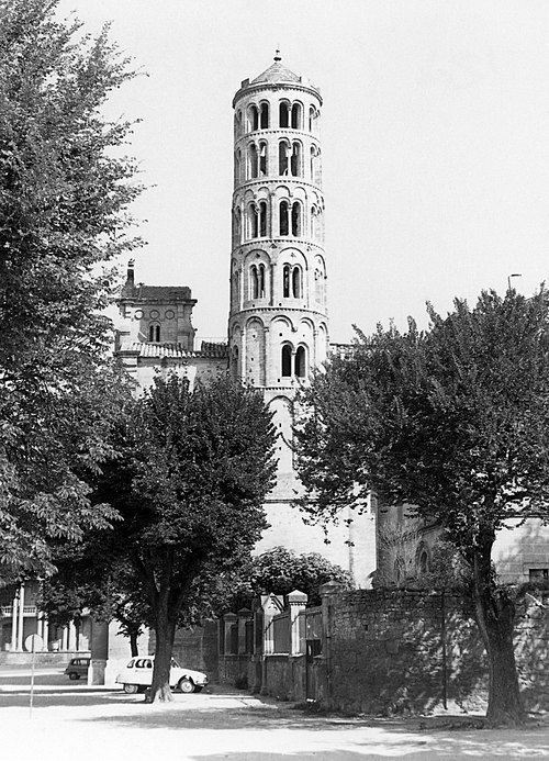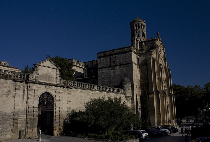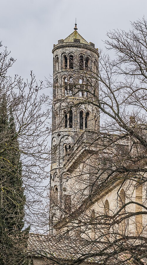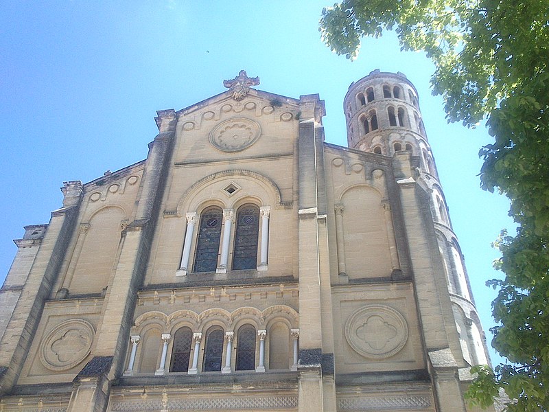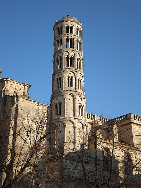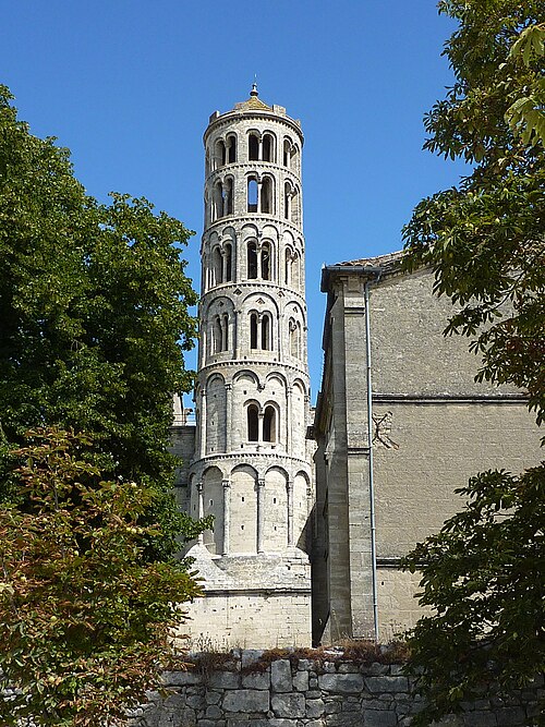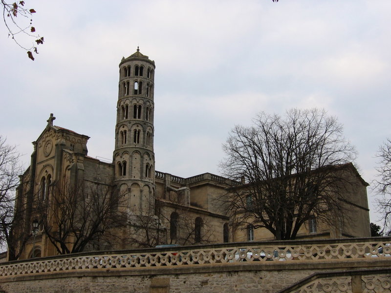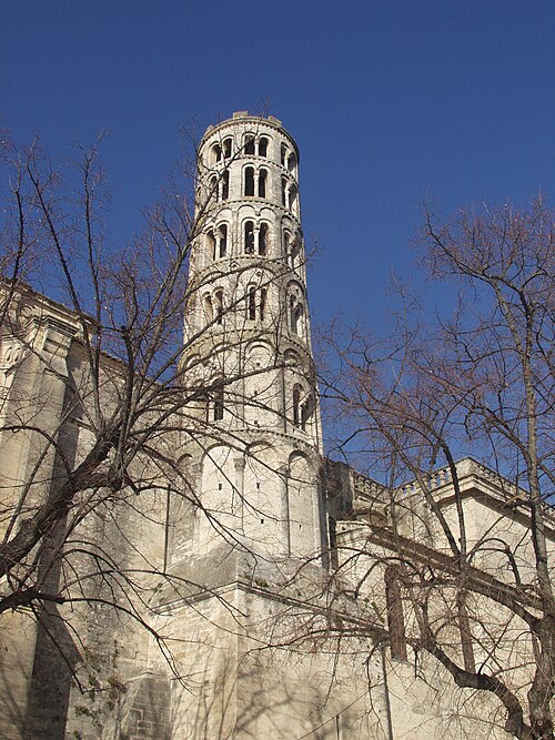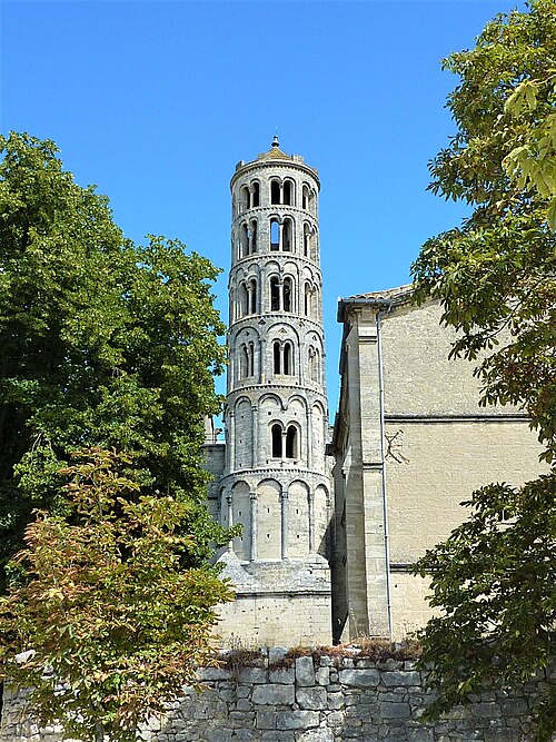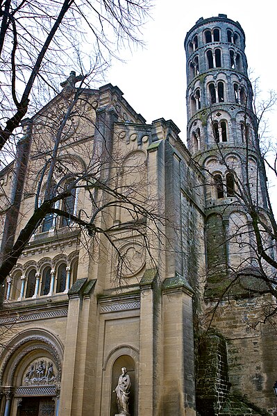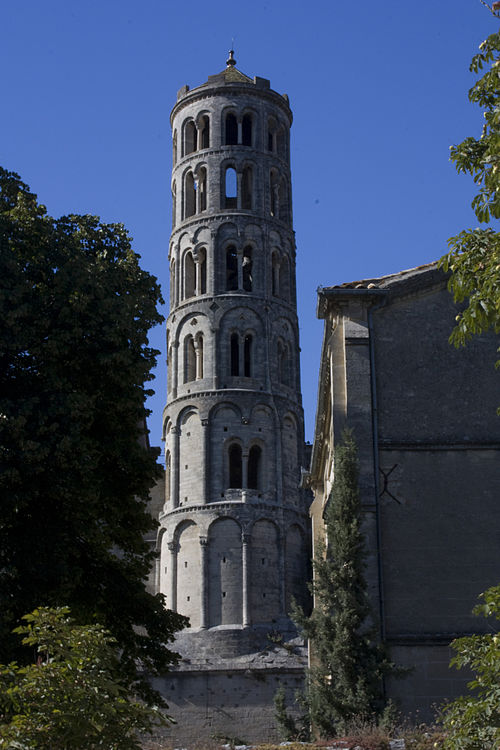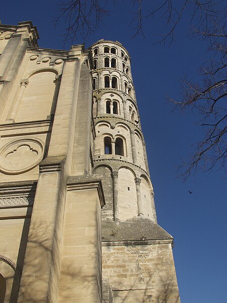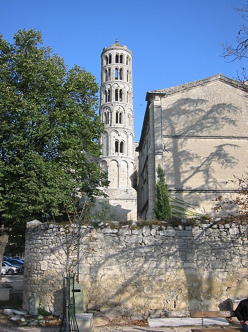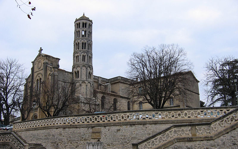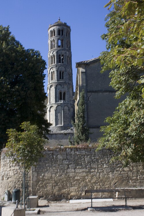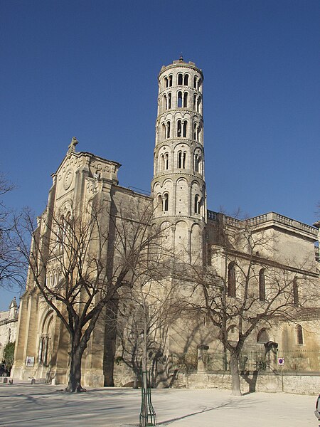 La cathédrale Saint-Théodorit d'Uzès, ancienne cathédrale située dans le Gard, a été édifiée à partir de 1090 sur l'emplacement d'un temple romain et fut le siège de l'ancien diocèse d'Uzès jusqu'à la Révolution. Le premier bâtiment roman portait l'influence de l'ordre de Cluny ; il fut partiellement démoli lors de la croisade des Albigeois en 1177, puis reconstruit. Le chapitre, appartenant à l'ordre des chanoines réguliers de saint Augustin, adopta la religion protestante en 1546 puis, en 1633, revint au catholicisme et se soumit à la règle des chanoines réguliers de la Congrégation de France. Au cours des guerres de religion la cathédrale médiévale fut gravement atteinte : elle subit des dommages dès le 13 mai 1563 et fut finalement détruite en 1621, seul le campanile, la tour Fenestrelle, subsistant mais amputé de deux étages. La reconstruction eut lieu principalement au XVIIe siècle, avec des campagnes menées de 1642 à 1663 ; le gros œuvre du chevet fut achevé en 1649 et l'édifice fut rouvert au culte en 1660. Les travaux d'ameublement et de décoration intérieure furent réglés par des contrats passés entre 1678 et 1680. À l'ouest, l'ancienne maçonnerie a été incorporée lors de la construction du nouveau clocher nord en 1649, et la partie du XVIIe siècle s'articule à l'ouest avec des bâtiments antérieurs, dont la tour Fenestrelle qui flanque l'angle sud‑ouest. La façade néo‑romane, plaquée contre l'ancien mur‑pignon, a été posée à la fin du XIXe siècle en 1873. L'édifice présente une large nef centrale bordée de chapelles latérales aménagées entre les contreforts et surmontées de tribunes qui sont interrompues à la seconde travée en regard du sanctuaire pour former un transept ; la partie semi‑circulaire du sanctuaire est inscrite dans le plan rectangulaire de l'édifice et s'accompagne d'une travée correspondant aux chapelles latérales de part et d'autre. L'intérieur, sobre, relève d'un style classique lié à la Contre‑Réforme et est voûté sur croisées d'ogives culminant à 18 mètres ; il se signale par de hautes tribunes pourvues de balcons en fer forgé et par des galeries aménagées après la révocation de l'édit de Nantes en 1685 pour y loger, durant les offices, les « nouveaux convertis », avec des grilles en fer peint en gris et doré. Dans les chapelles entourant le chœur subsistent des traces de peintures aux plafonds et sur les murs ; une grande partie du mobilier a disparu pendant la Révolution, à l'exception de l'orgue dont le double buffet peint et doré du XVIIe siècle conserve ses volets originaux datés de 1685. La façade porte des statues de saint Pierre, à gauche avec les clefs, et de saint Paul, à droite ; le tympan représente la Vierge à l'Enfant entourée des saints Firmin et Ferréol. Le chœur réunit une table de communion en marbre datée de 1891, portant les armes du pape, de l'évêque, du chapitre et de la cathédrale, don de Paul Foussat, un maître‑autel en marbre de 1827 inspiré de celui de Saint‑Pierre d'Avignon, un sol refait en 1936 et un tableau monumental, la Descente de Croix de Lair (1827), offert par le gouvernement et surmonté du triangle trinitaire et du nom de Dieu en hébreu, dont la décoration de la Restauration masque la fenêtre centrale. Les grandes orgues sont remarquables par leur double buffet du XVIIe siècle peint et doré et par une partie instrumentale restaurée, considérée comme une réussite des Monuments historiques. La tour Fenestrelle, clocher roman de 37 mètres datant du XIIe siècle et fortement restaurée au XVIIe siècle, est un vestige de l'ancienne cathédrale assimilable aux campaniles lombards ; unique clocher rond en France, elle doit son nom aux nombreuses baies géminées qui rythment ses étages et sa toiture est couverte de tuiles vernissées jaunes et vertes, faisant d'elle, avec le palais ducal, un des symboles d'Uzès. La cathédrale possède une sonnerie de quatre cloches de volée : la plus lourde (Sol3) pèse 789 kg et a été fondue en 1810 ; deux cloches fondues par Paccard en 1932 pèsent 427 kg (Si b3) et 192 kg (Do4) ; une cloche de 110 kg (Mi4), fondue en 1600, se trouve dans un clocheton au‑dessus de la façade ouest.