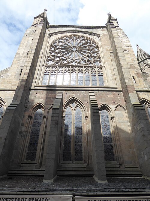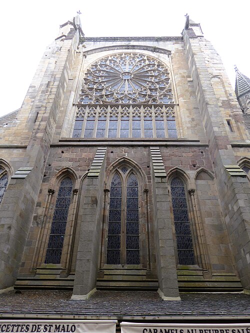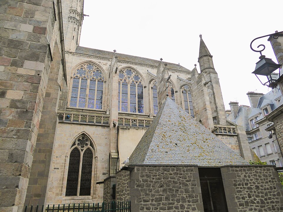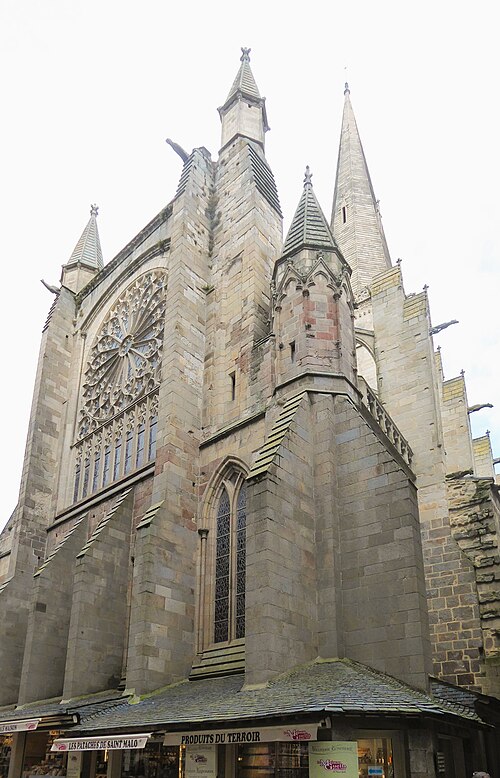 La cathédrale Saint-Vincent de Saint‑Malo, dédiée à saint Vincent de Saragosse, mêle les styles roman et gothique et est classée monument historique depuis 1910 ; elle fait partie des sept cathédrales étapes du Tro Breiz. Édifiée sous l'épiscopat de Jean de Châtillon (1146‑1163) sur l'emplacement d'une ancienne église fondée au VIIe siècle et relevée au IXe, elle est issue d'un monastère primitif dépendant de l'abbaye de Marmoutiers. Des éléments du XIIe siècle subsistent : une partie du cloître, la nef, la croisée du transept et une travée des bras nord et sud. Le chœur a été reconstruit au XIIIe siècle, et la tour commencée au XIIe siècle a été surélevée en 1422. Le collatéral sud et trois chapelles du chœur datent du XVe siècle. À la fin du XVIe siècle et au début du XVIIe siècle (1583‑1607), le collatéral nord fut reconstruit et le transept nord agrandi, tandis que l'aile du rosaire au sud fut commencée entre 1623 et 1631. En 1676 le sol du sanctuaire, du déambulatoire et du chœur fut élevé au même niveau que la nef, et en 1695 la rosace du chevet, détruite par la flotte anglo‑hollandaise, fut remplacée par trois baies en plein cintre. Au XVIIIe siècle la chapelle sud fut édifiée, la tour du clocher surélevée et coiffée d'un dôme en ardoise, puis la façade fut reconstruite en 1772‑1773 en style néoclassique sur les maçonneries médiévales. Des aménagements du XIXe siècle comprennent notamment une porte de style Renaissance en 1851 et l'érection d'une flèche en pierre de Caen à partir de 1858, couronnée d'une croix en 1860.