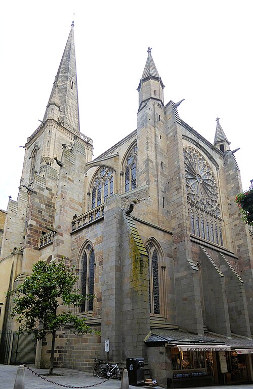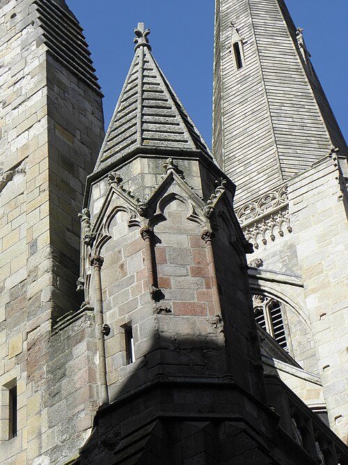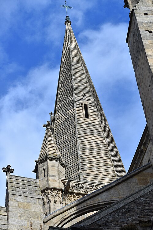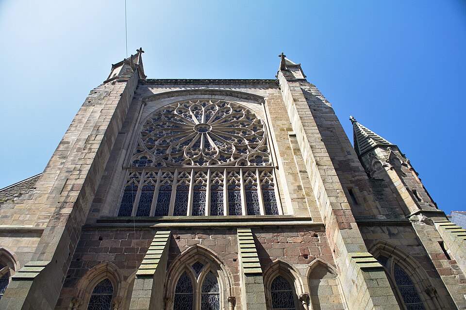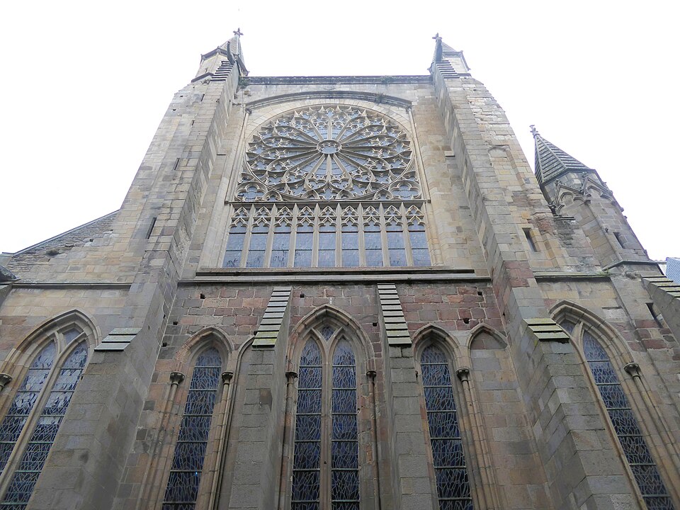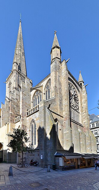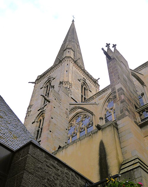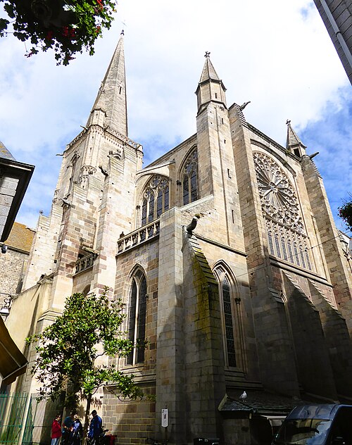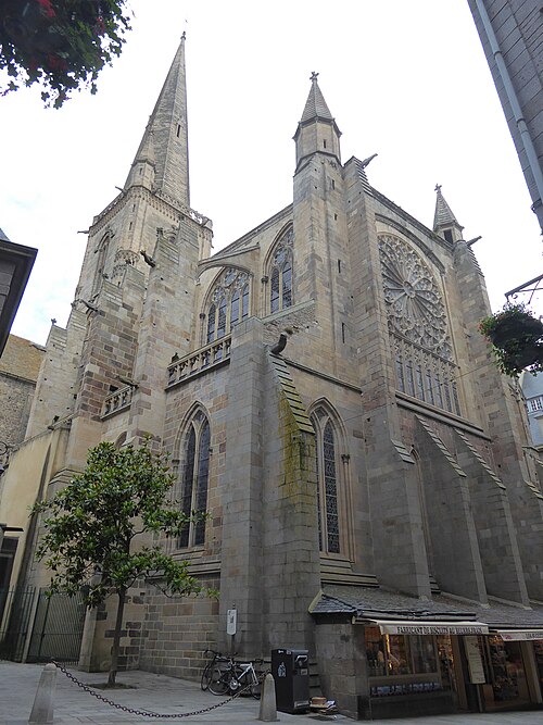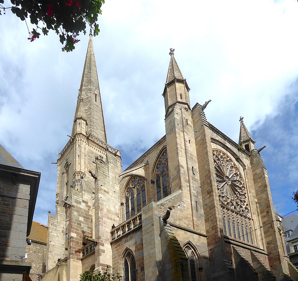 La ville devint siège épiscopal en 1145 ; le diocèse fut supprimé en 1790 et son territoire réparti entre les diocèses de Rennes, de Saint‑Brieuc et de Vannes. Gravement endommagée lors des bombardements d'août 1944, la cathédrale fut restaurée de 1944 à 1972 sous la direction de Raymond Cornon puis de Pierre Prunet. Les travaux révélèrent des destructions plus vastes que prévu : la reconstruction de la nef absorba une grande partie des crédits et la flèche ne put être rebâtie qu'après des collectes, la nouvelle flèche, de même hauteur (77 m) mais d'allure plus sobre, dessinée par Prunet, fut achevée et célébrée en 1972 ; une nouvelle croix de couronnement fut posée en 1987.