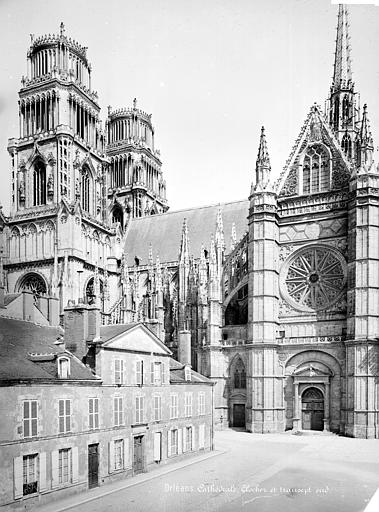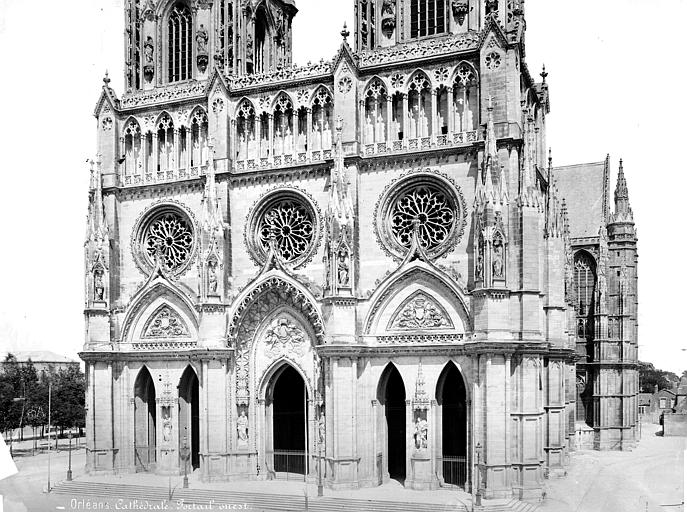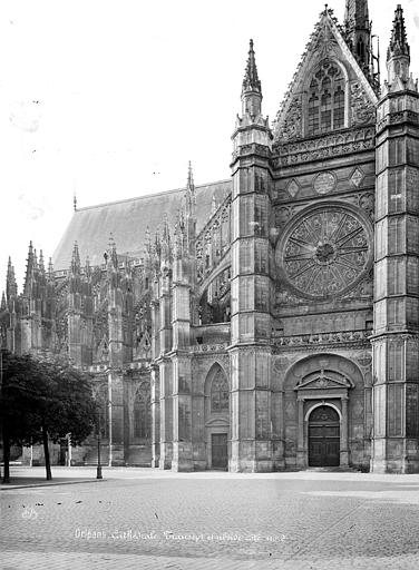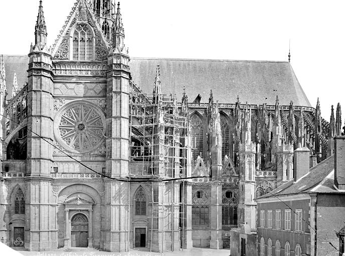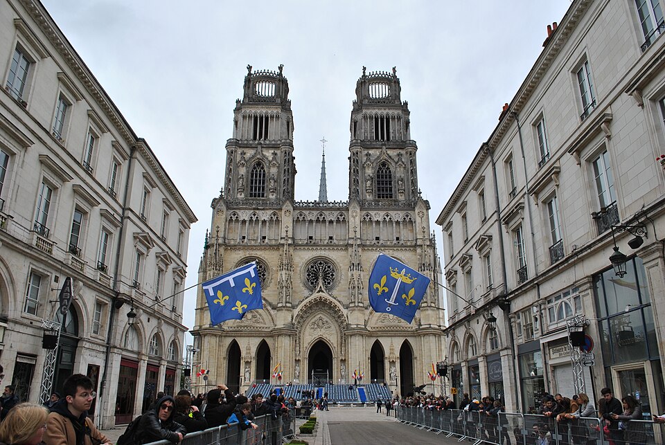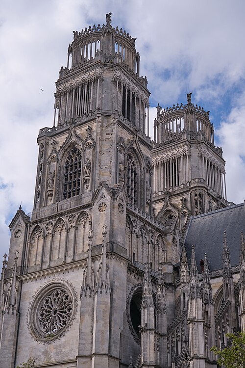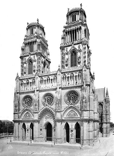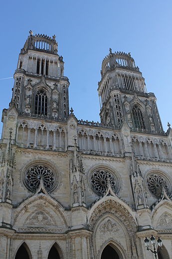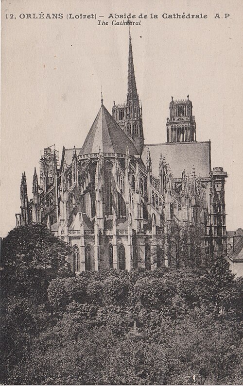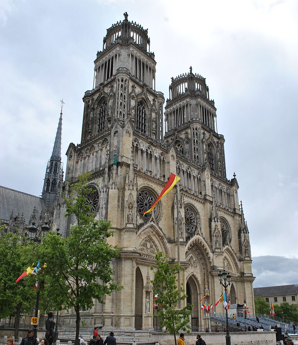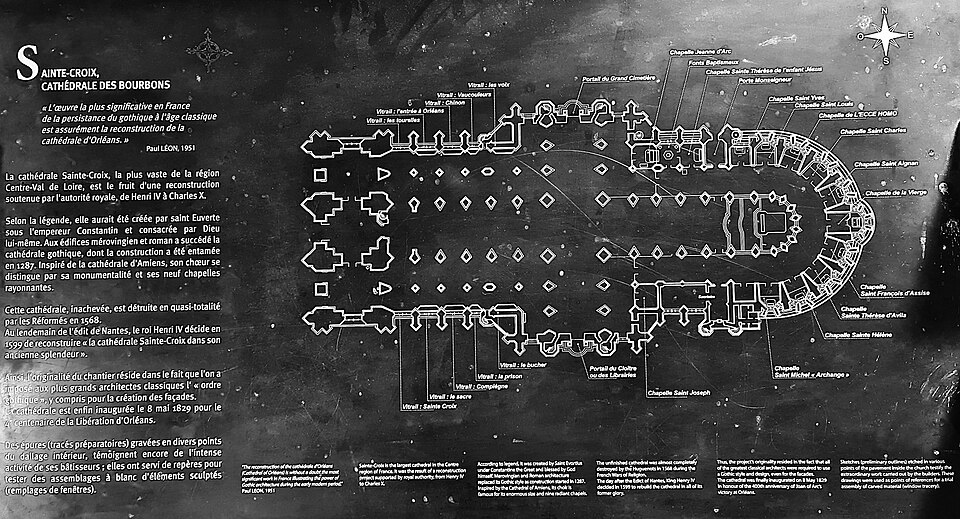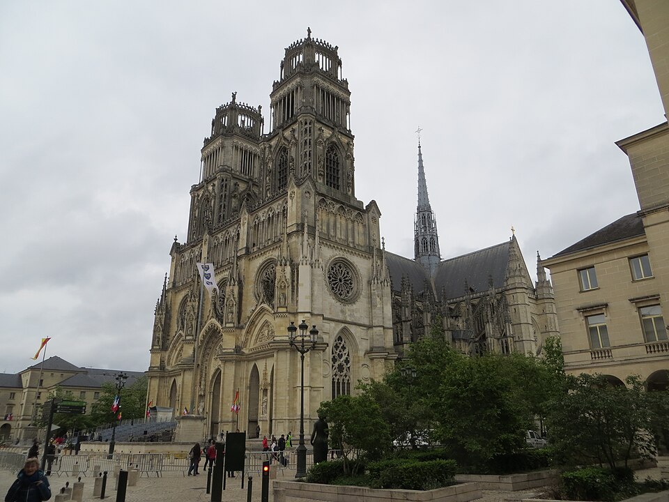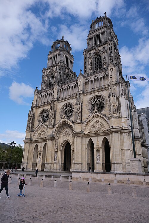 La cathédrale Sainte‑Croix d’Orléans, siège du diocèse et dédiée à la Sainte‑Croix, est un édifice gothique situé dans le Loiret, en région Centre‑Val de Loire ; elle est classée au titre des monuments historiques depuis la liste de 1862 et a été élevée au rang de basilique par le pape Pie IX le 26 janvier 1855. Deux traditions hagiographiques expliquent sa fondation : la Vie de saint Euverte (IXe siècle) fait d’Euverte un sous‑diacre romain choisi miraculeusement pour l’épiscopat à Orléans, qui aurait retrouvé un trésor, reçu des subsides et un fragment de la Vraie Croix et fait édifier une cathédrale consacrée par un prodige divin ; la Grande Passion d’Auxerre (XIe siècle) prétend, plus tardivement, une origine apostolique en attribuant à des missionnaires envoyés par saint Pierre la création de l’Église locale, récit qui relève d’une visée anachronique et de propagande pour le siège métropolitain de Sens. Jusqu’au VIIe siècle, les données sur les constructions et leur emplacement restent incertaines ; le nom du premier évêque connu, Diclopetus, témoigne toutefois de l’existence précoce d’une ecclesia à l’intérieur de l’enceinte urbaine. Des textes médiévaux attribuent à Euverte des travaux sur l’édifice primitif et Grégoire de Tours rapporte la présence du roi Gontran à la messe dans la cathédrale en 585 ; les premières mentions du vocable Sainte‑Croix figurent sur des monnaies du VIIIe siècle. La cathédrale fut le théâtre d’événements historiques : le sacre de Charles le Chauve y est relaté, la ville supporta des incursions vikings et l’édifice aurait été incendié entre 877 et 879, tandis que d’autres cérémonies royales et princières y sont également documentées. Les vestiges archéologiques les plus anciens comprennent des fragments de mosaïque parfois datés du VIIIe siècle, voire attribués au IVe siècle, dont l’inscription partielle renvoie à un texte biblique. Après un incendie signalé en 989, une cathédrale romane reconstruite par l’évêque Arnoul comportait une nef de sept travées, un transept, un chœur avec déambulatoire et chapelles rayonnantes et une croisée marquée par quatre piliers carrés supportant probablement une tour centrale ; une façade harmonique à deux tours fut ajoutée à l’ouest, connue par une abondante iconographie avant sa démolition au XVIIIe siècle. La cathédrale romane a conservé des aménagements tels que le massif du maître‑autel et des restes de mosaïque, mais sa restitution suscite encore des débats sur la configuration des bas‑côtés, du chevet et des tribunes. Au cours du bas Moyen Âge, un vaste chantier gothique débuta à la fin du XIIIe siècle — avec un plan inspiré de Notre‑Dame d’Amiens mais doté de neuf chapelles absidiales — et se poursuivit, entre interruptions et reprises, jusqu’au XVIe siècle ; les travaux furent ralentis par la guerre de Cent Ans et le siège d’Orléans en 1428–1429. Lors des guerres de Religion la cathédrale fut pillée en 1562 et fortement endommagée en mars 1568 lorsque l’explosion des piliers de la croisée entraîna l’effondrement d’une grande partie de l’édifice ; subsistèrent alors, à l’est, la couronne de chapelles rayonnantes et les murs du chœur gothique, au transept des parties muraires et des façades romanes, et à l’ouest quelques travées gothiques et les tours romanes. La reconstruction dite « cathédrale des Bourbons » s’organisa à partir du XVIIe siècle : le chœur et le transept furent relevaillés sous la direction d’architectes comme Étienne Martellange, Jacques‑V. Gabriel et Louis‑François Trouard, et la façade occidentale fut reprise aux XVIIIe–XIXe siècles ; la façade jusqu’à la base des tours fut achevée en 1773, les travaux interrompus par la Révolution, puis repris au XIXe siècle avec une inauguration en 1829 à l’occasion du quatre‑centième anniversaire de la levée du siège. Depuis son achèvement moderne, la cathédrale a subi de nouveaux aléas : le clocher détruit en 1854 fut reconstruit en 1858, les vitraux du chœur dus à Lobin furent posés en 1859, les voûtes du sanctuaire s’effondrèrent dans la nuit du 8 au 9 septembre 1904, et l’édifice subit des dégâts limités lors des bombardements de 1940 et de 1944 ; certaines réparations restent inachevées, l’accès aux tours ayant été interdit depuis 1940, et le bourdon fissuré en 1971 a été refondu et réinstallé en 2012. Les fouilles archéologiques ont confirmé et précisé plusieurs phases : des sondages de la fin du XIXe siècle et des campagnes menées entre 1937 et 1942 par Georges Chenesseau ont mis au jour le chœur roman, le déambulatoire, des tombes, des substructions carolingiennes et des vestiges gallo‑romains, tandis que des sondages de 1903 ont établi l’absence de crypte et ceux de 1940–1942 ont démontré que la nef romane n’avait qu’un seul bas‑côté et que le chevet roman comptait trois chapelles rayonnantes. Jeanne d’Arc est liée indirectement à l’édifice : elle assista à un office vespéral le 2 mai 1429 durant le siège, et la ville commémore chaque année, le 7 mai, une cérémonie johannique sur le parvis, tandis que la rue Jeanne d’Arc, percée au XIXe siècle, débouche sur la façade principale. La cathédrale présente d’importantes dimensions : 143,85 mètres de longueur hors‑œuvre, cinq nefs pour une largeur hors‑œuvre de 50,86 mètres, une hauteur du vaisseau principal de 31,75 mètres, des tours culminant aux alentours de 78 à 82 mètres selon les points mesurés et une flèche centrale qui s’élève à 114 mètres. Le grand orgue, issu d’un échange avec l’abbaye de Saint‑Benoît‑sur‑Loire en 1822, a été remodelé par Louis Callinet, transformé par Cavaillé‑Coll en 1880 puis restauré au début du XXIe siècle ; il compte quatre cl